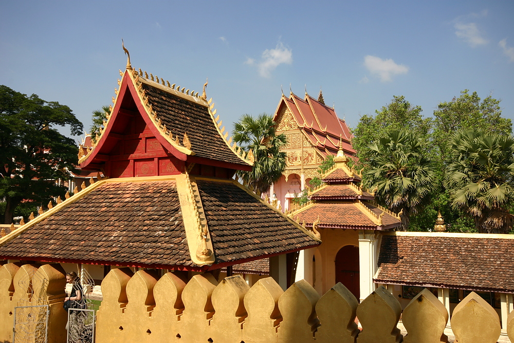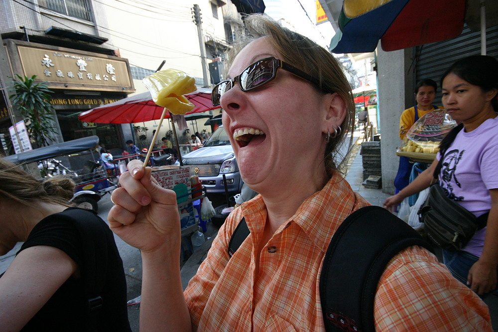 Die weiblichen Reisenden geniessen Futter im Morning Market am Nachmittag in Vientiane. Mmmmmmm!