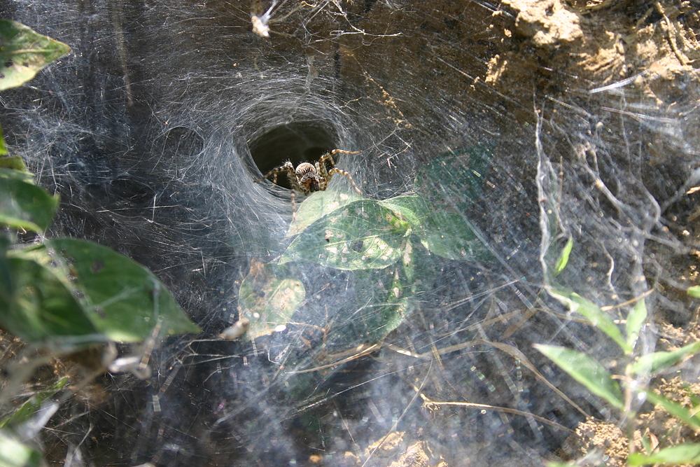 Dies ist das bescheidene Chalet einer Tunnelspinne, Astrids Lieblingstierchen in Laos.