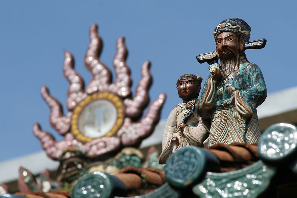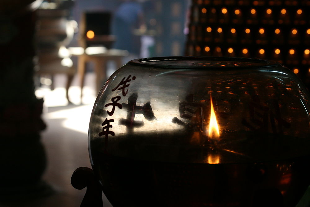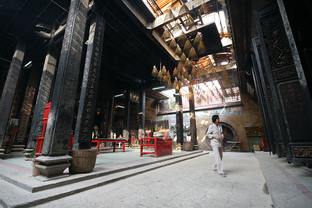 Nach den guten Straßenwalking-Erfahrungen vom Vortag, sind wir nun wieder als alte Straßenüberquerfonzies total coool durch das Chaos marschiert und haben immer chinesischere Tempel angeguckt. Die Kleine hatsich dabei an Fischen, Schildkröten, Steintigern und Eingangsbewachungslöwen erfreut und begeistert gequietscht. Interessanterweise ist die Immissionsbelastung der Atemluft in den Tempel sehr viel höher als auf der Straße. Schuld sind die Räucherspiralen, die hier zu dutzenden an den Decken hängen. Und die Rächerstäbchen, die man Kiloweise ansteckt. Und nicht zu vergessen die Räucherknüppel mit mehreren Zentimetern Durchmesser! Man soll anscheinend nicht in der Lage sein, die andere Seite sehen zu können...