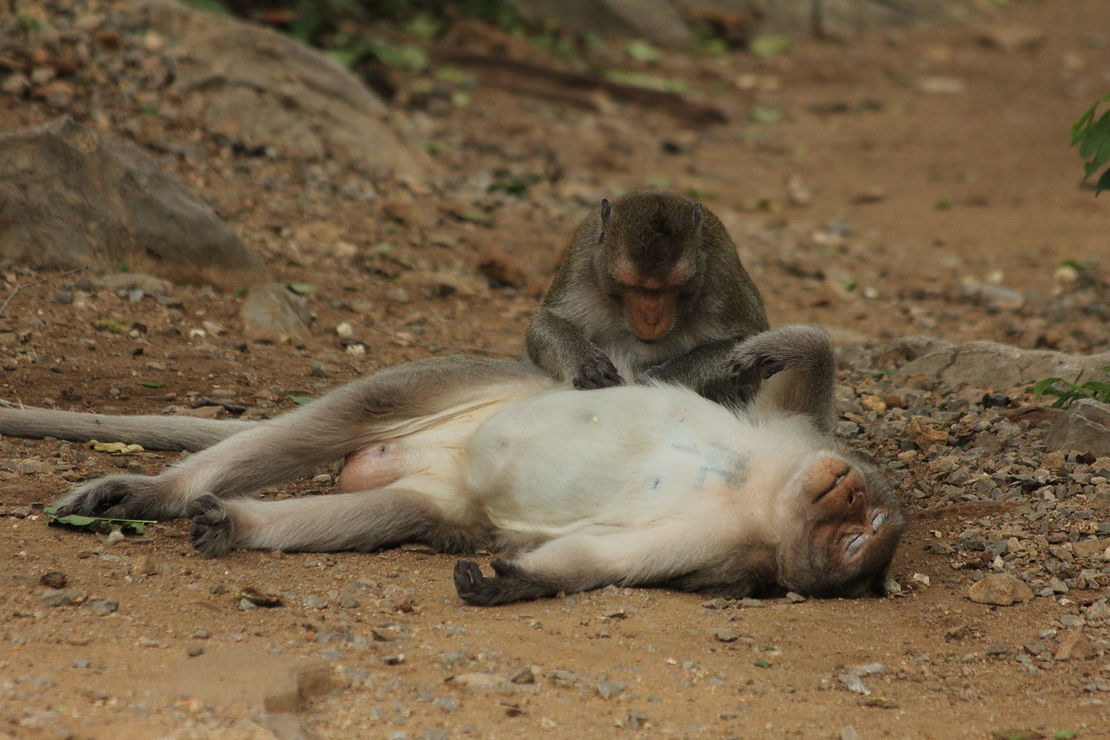 Die Höhle findet man auf einem kleineren Berg, der mit fieser Luftfeuchtigkeit und hunderten Affen aufwartet, die hoffen, dass man sie füttert, was unverständlicherweise die Thais sehr gerne machen. Resultat sind Horden von gierigen Auffenaugen, die jeden Besucher beäugen, ob man ihn nicht ausrauben kann. Affen zu füttern ist noch bescheuerter als Tauben oder Möwen etwas hinzuwerfen oder sein Geld einem Investmentbanker zu geben. Aber dafür waren sie sehr nah dran und nicht die Bohne scheu.