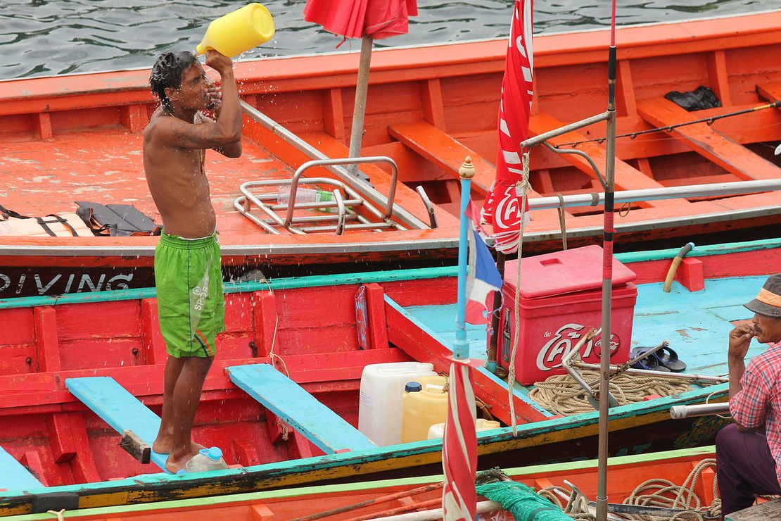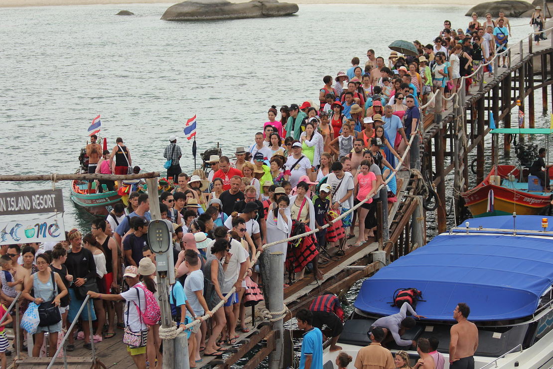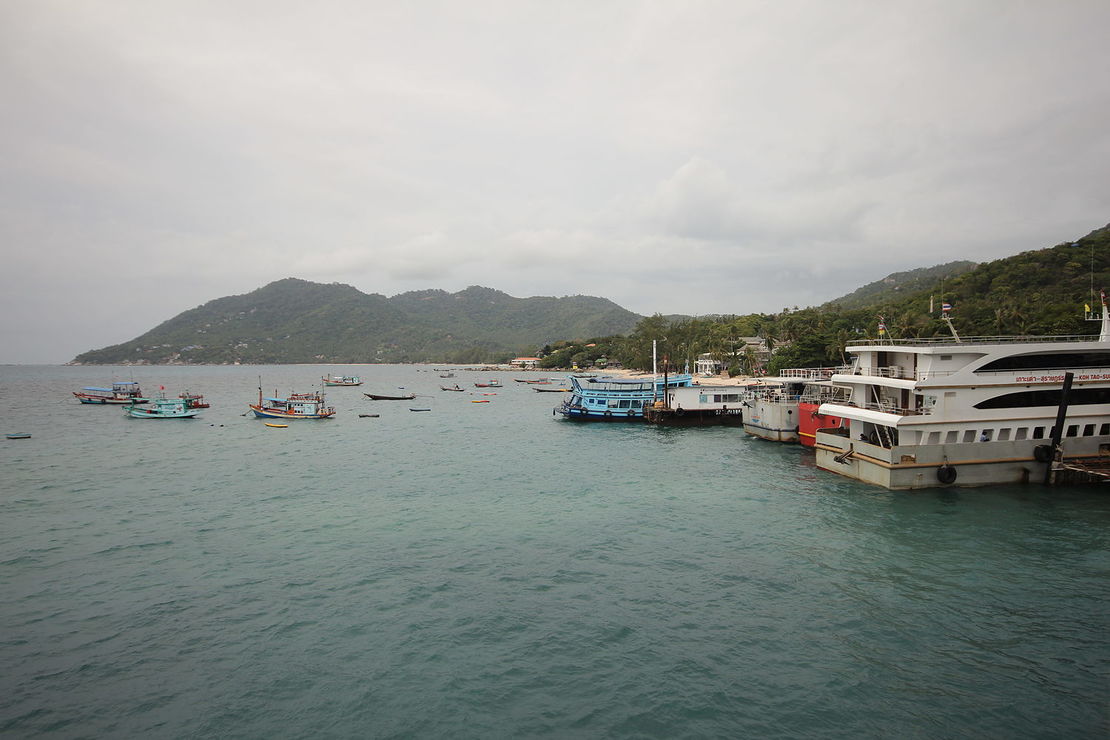 Nach einem späten Frühstück holte uns und die Belgier der (gute) Minibus des Fährunternehmens ab und brachte uns zum (schlechten) Bus, der uns in fast einer Stunde zum Pier brachte. Das »normale« Thailand ist hier zuende und es beginnt Touristen-Thailand, um dass man leider heutzutage kaum herumkommt, wenn man auf eine Insel will. Die Lomphraya-Fähre ist ein moderner Katamaran und bewältigt die Strecke in gut 2 Stunden. Wir haben die Zeit auf dem SonnenWolkendeck verbracht, wo man sich trotz nicht vorhandener Sonne kostenlos einen Sonnenbrand holen kann.