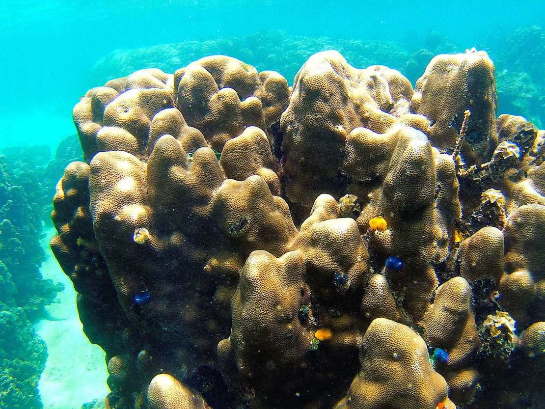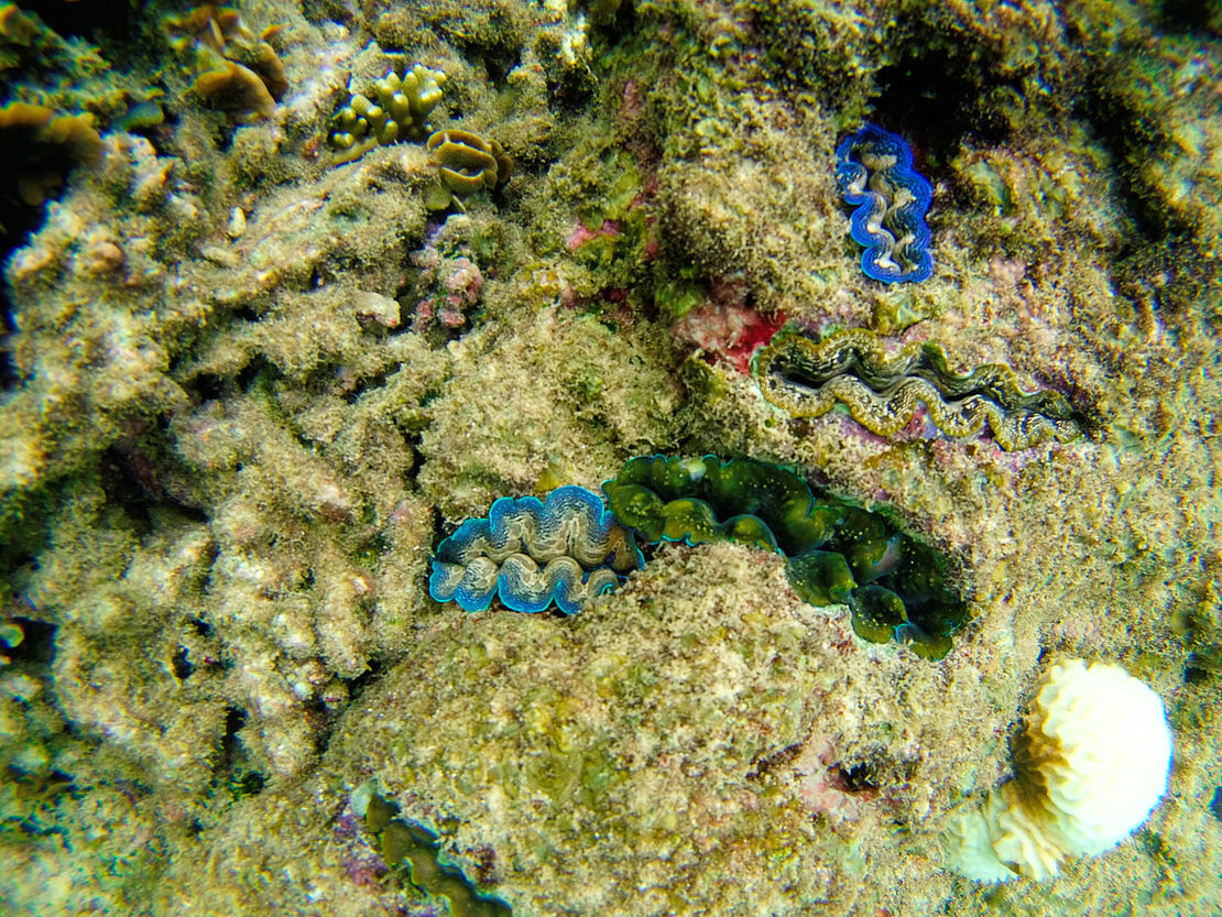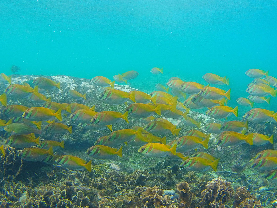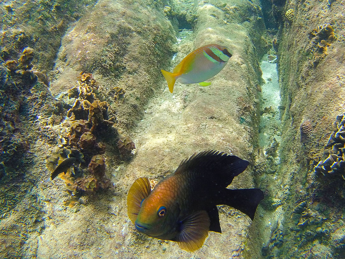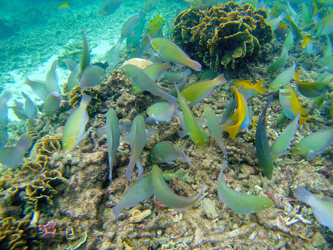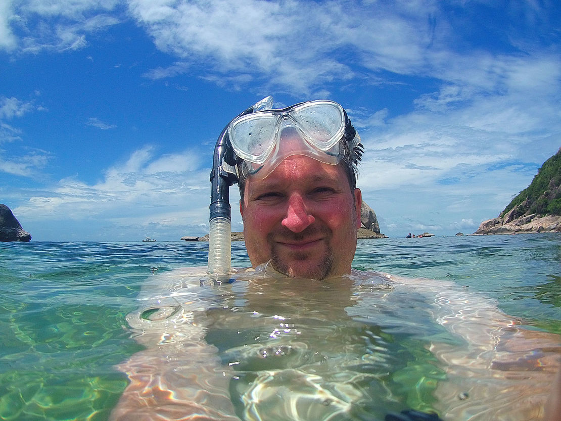 Nach dem foul and fair day von gestern wurden wir heute mit blauem Himmel und Sonne begrüßt. Den Ausblick von meiner Veranda seht Ihr oben. Noch vor dem Frühstück sind wir mit Tauchermasken und Schnorchel bewaffnet ins Wasser gesprungen und durch Schwärme von Fischen getaucht. Der Welpe hat dabei die lustige Angewohnheit, praktisch ununterbrochen durch seinen Schnorchel zu singen und begeistert zu quieken.