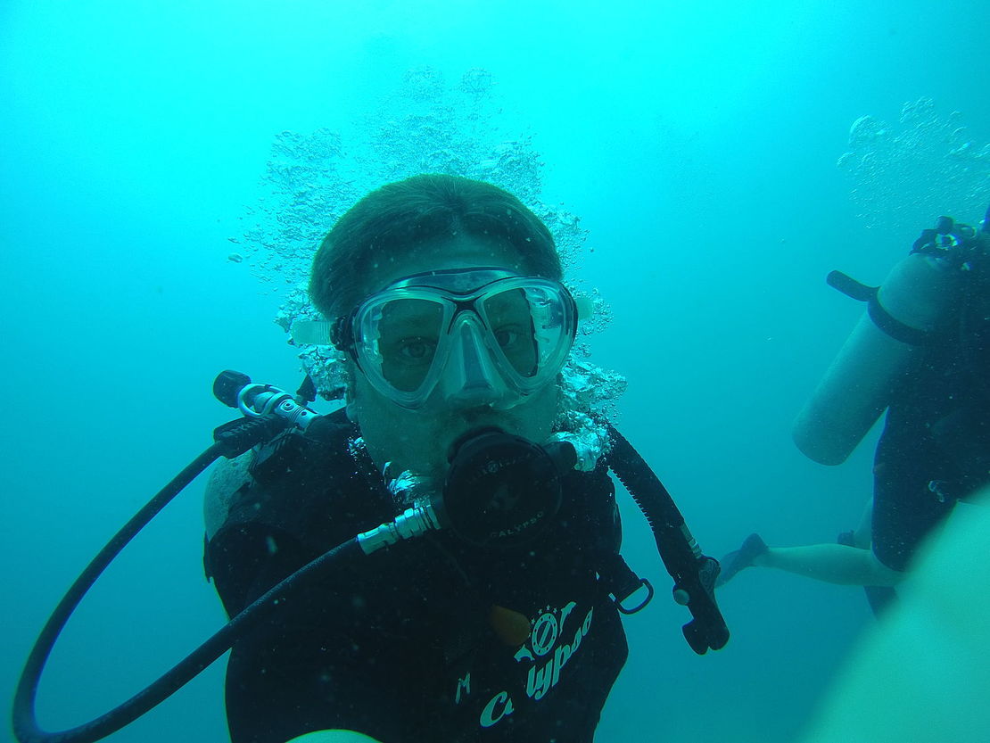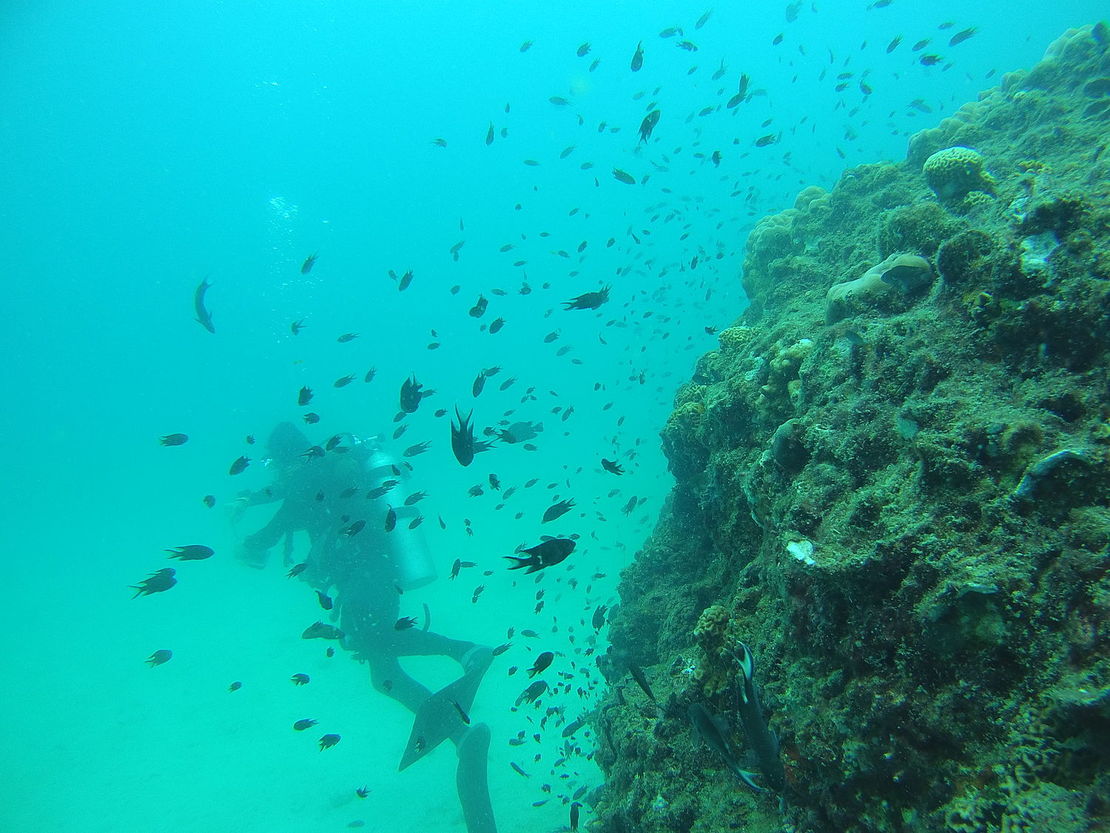 Man könnte meinen, der Sensor meiner Kamera ist kaputt, aber es gibt leider praktisch kein rotes Licht mehr in 19m Tiefe, es sei denn, man bringt welches mit. Wir hatten zwei schöne Dives heute, an der leicht umströmten Shark Island (leider heute ohne Sharks) und in der ruhigen Ao Leuk Bucht. Beide sehr unterschiedlich, der erste eher felsiger, mit guter Sicht (20m), der andere eher mit einer sandigen Ebene und 10m Sicht. Einen fetten Zackenbarsch mit ca. 110cm Länge gabs, aber der hat sich wegen der blubbernden Paparazzi unter einem Felsen versteckt. Dann noch Drückerfische, seltsame Schnecken, Einsiedlerkrebse, Anemonenfische, die wie eine kleine Familie auf ihrer Anemone leben, mit einem Krebs als Haustier und den Kindern, die Mist machen.