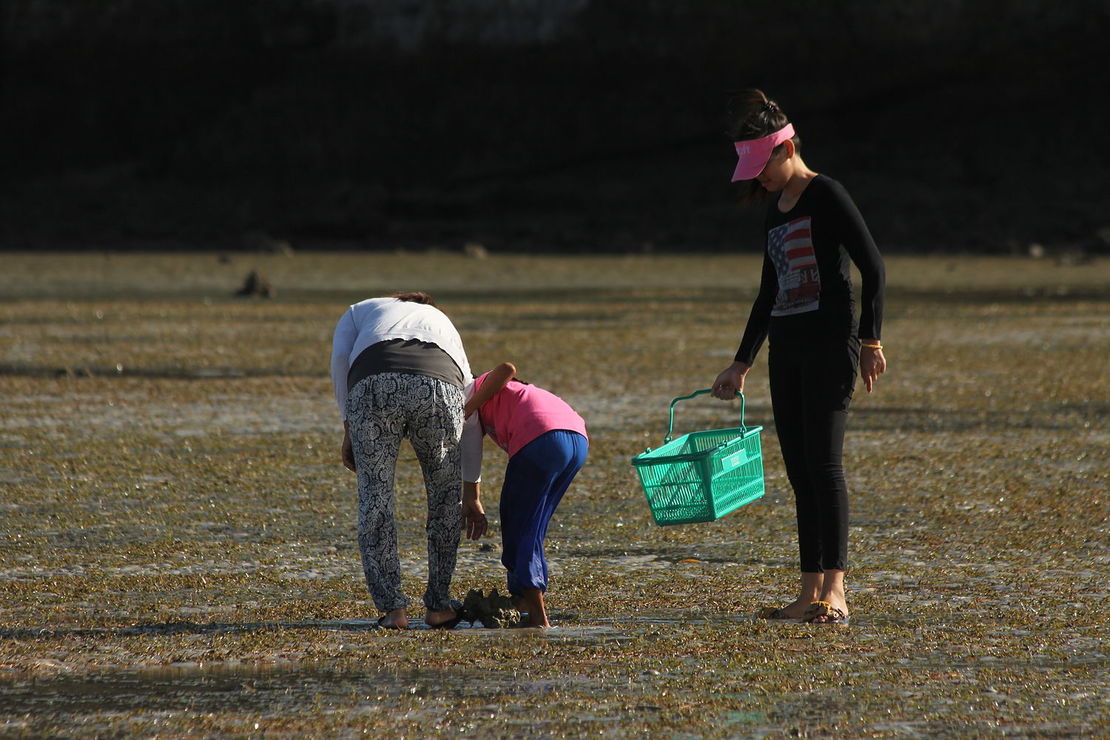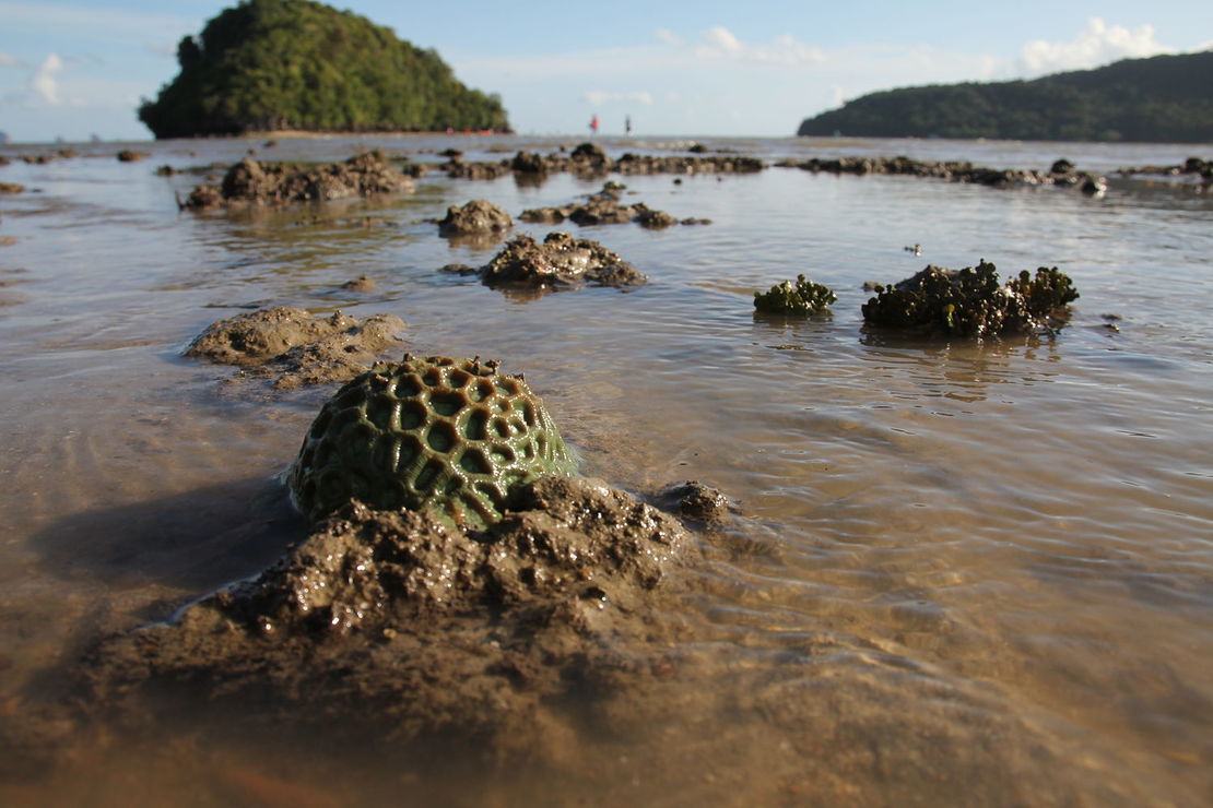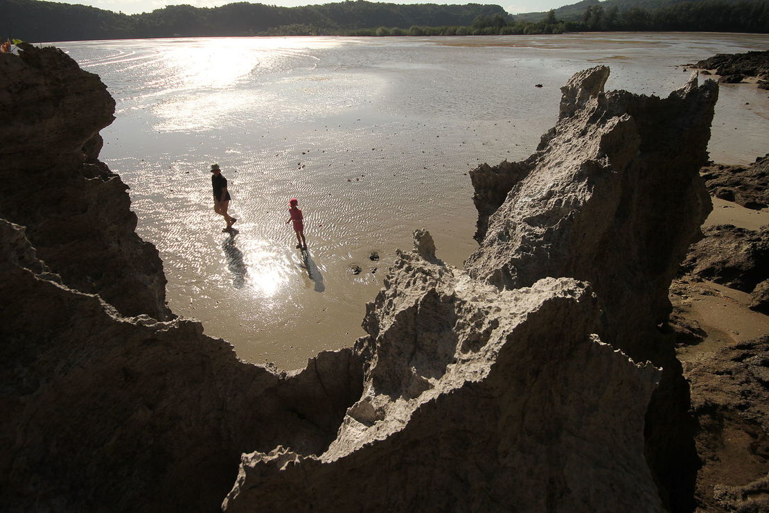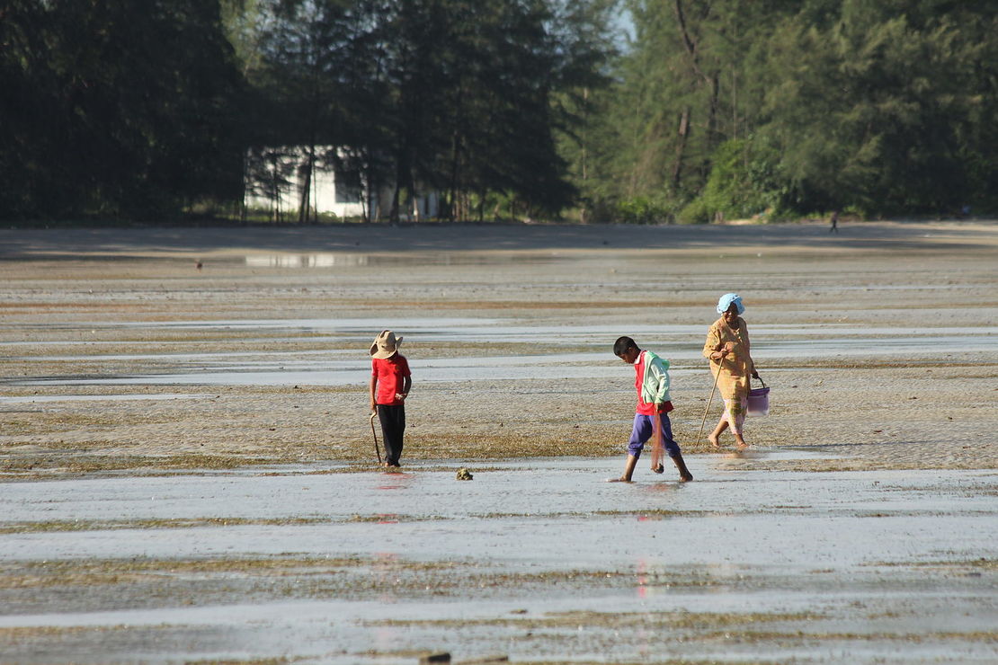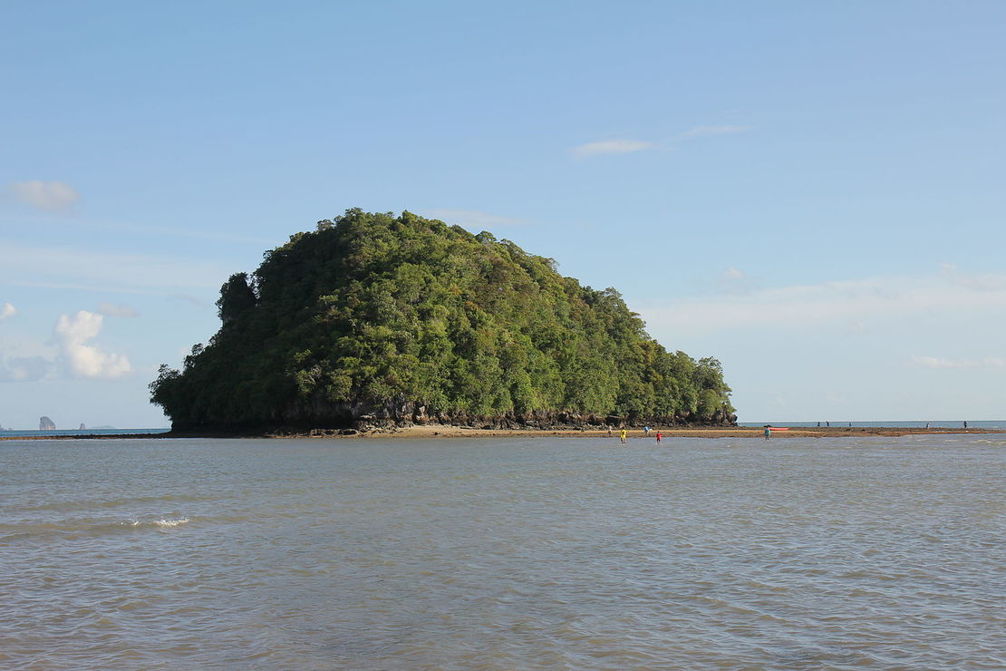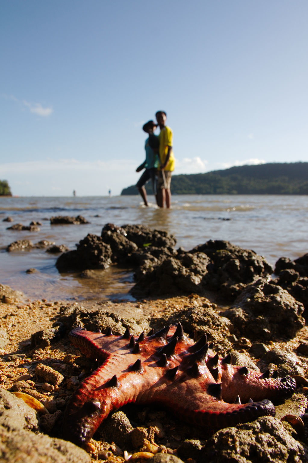 Die kleine Karsch-(Haha)-Insel ist wie die andere auf der anderen Seite des Strandes oben dicht bewachsen und hat unten einen Ring von den Felsen, aus denen Mordor gemacht ist: Schroff und so scharfkantig, dass man sich nicht mal kurz vorsichtig dran abstützen mag. Einmal hinfallen und man sieht sicher aus, als wäre man in einen Altglascontainer gefallen. es gibt kleine Höhlen und Felsvorsprünge, kleine Wasserbecken und überall Krebse und Viecher, die sich sofort verstecken, wenn jemand da rumklettert. Hin und wieder liegen dicke, große rote Seesterne dazwischen, die aussehen, als wenn sie aus dickem Gummi bestünden. Viele Thais streifen bei Ebbe um die Inseln und durchs Watt, um Krebse zu suchen.