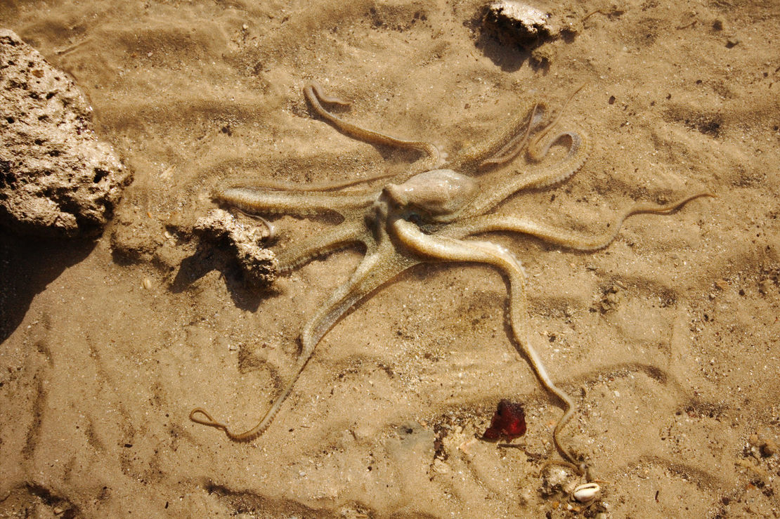 Aber immerhin haben wir heute auf unserer Watt-Wanderung zur westlich gelegenen Karsch-(Haha)-Insel zusätzlich zu den Unmengen kleiner Einsiedlerkrebse, Schnecken, etc, auch einen Oktopus gesehen, der durch das knietiefe Wasser kroch. Wir sind ihm ein wenig hinterher, was ihn zu einigen Farbänderungen bewog. Dann wollte er sich an einem flachen Felsen verstecken und änderte seine Farbe auf schwarz und seine Oberfläche auf die des Felsen. Wirklich absolut faszinierend. So hätten wir ihn nichtmal erkannt, wenn ihn uns jemand gezeigt hätte. Als wir ihn dann doch noch ein klein wenig aus der Reserve locken wollten, pustete er schnell eine fette Ladung Tinte ins Wasser und sauste gleichzeitig so unter den Fels, dass er wirklich verschwunden war. Eine tolle Show und das Highlight des Tages!