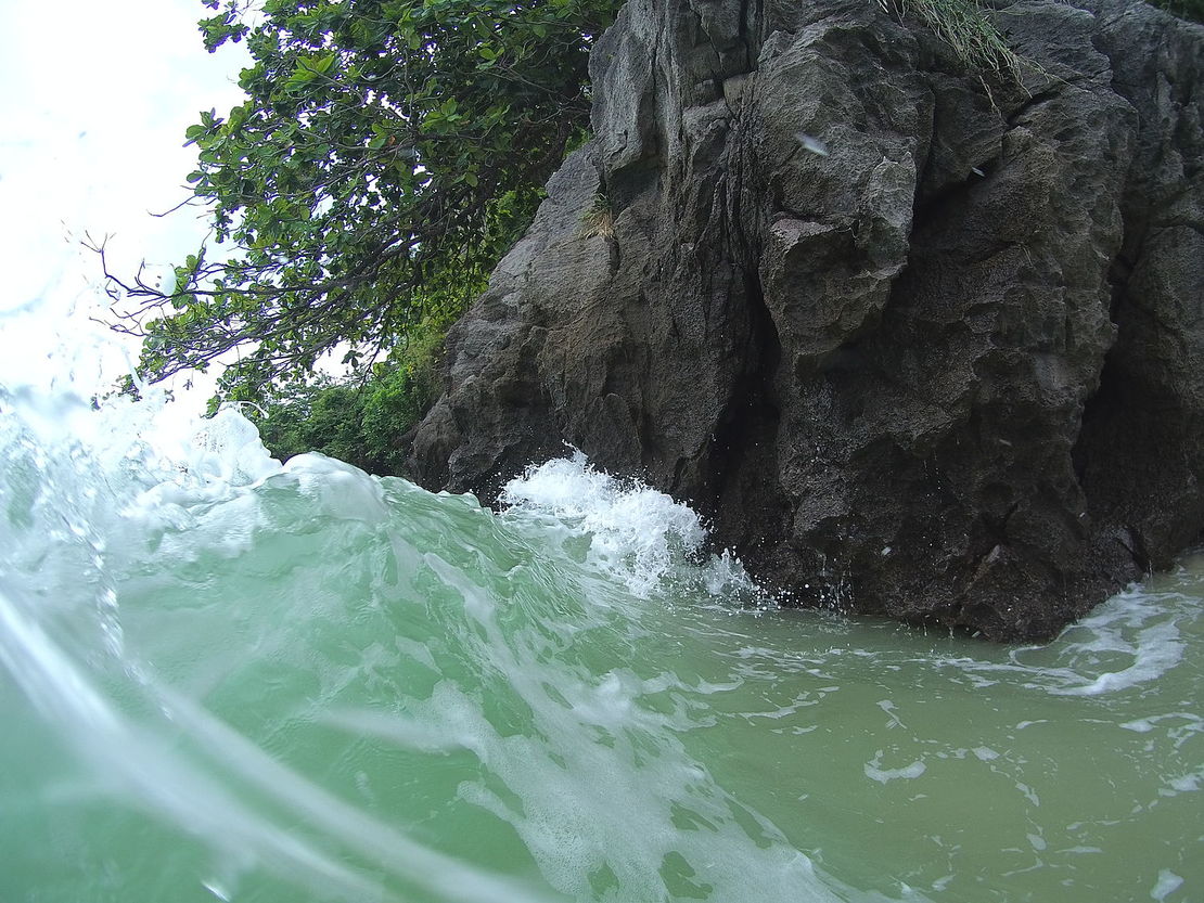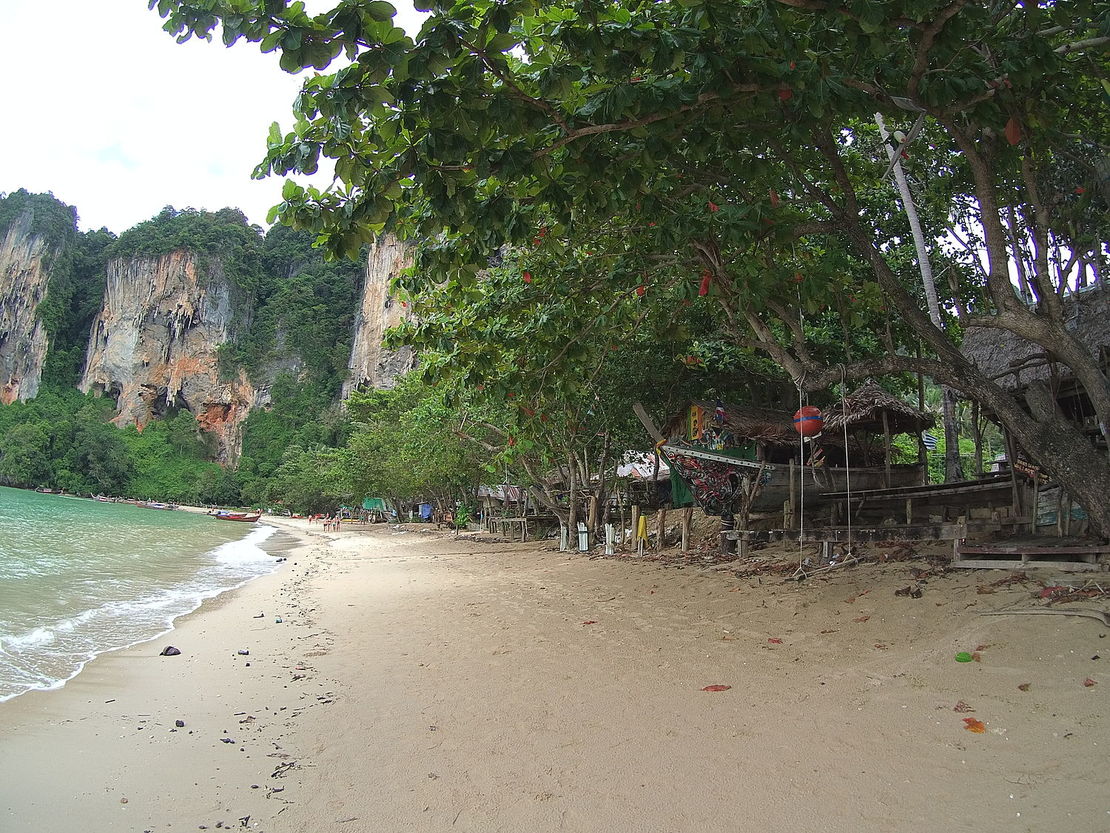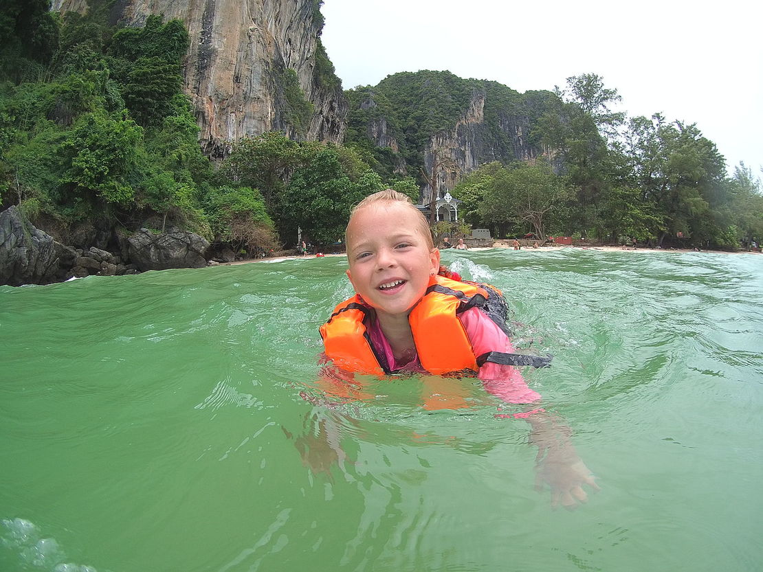 In der Railay-Bucht waren die Wellen noch höher. Wir haben das Kayak an den Strand gezogen und erstmal in den Wellen gebadet, während wir uns fragten, ob wir überhaupt wieder in unsere Bucht zurückkehren können. Das Wasser stieg währenddessen immer weiter, während eigentlich schon längst die Ebbe wieder einsetzen sollte. Wir mussten unser Kayak noch dreimal ein ganzes Stück weiter den Strand raufziehen. Dabei entdeckten wir am Fuß der Felswand einen ca. einen Meter langen Waran, der sich da verstecken wollte (gibt leider nur ein Telefonfoto von ihm, der Rest der heutigen Bilder mit Ausnahme des Nachtbildes ist mit der Actioncam entstanden).