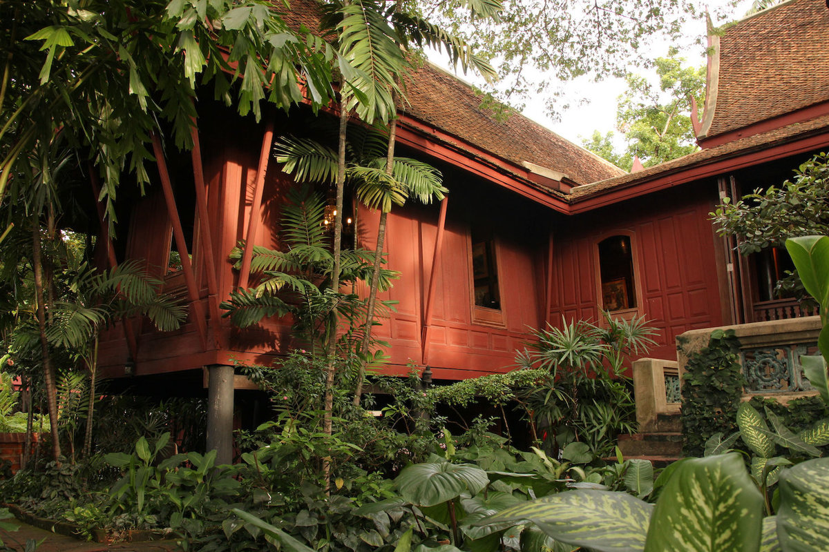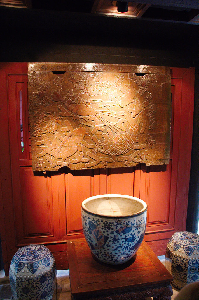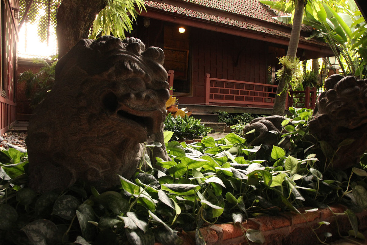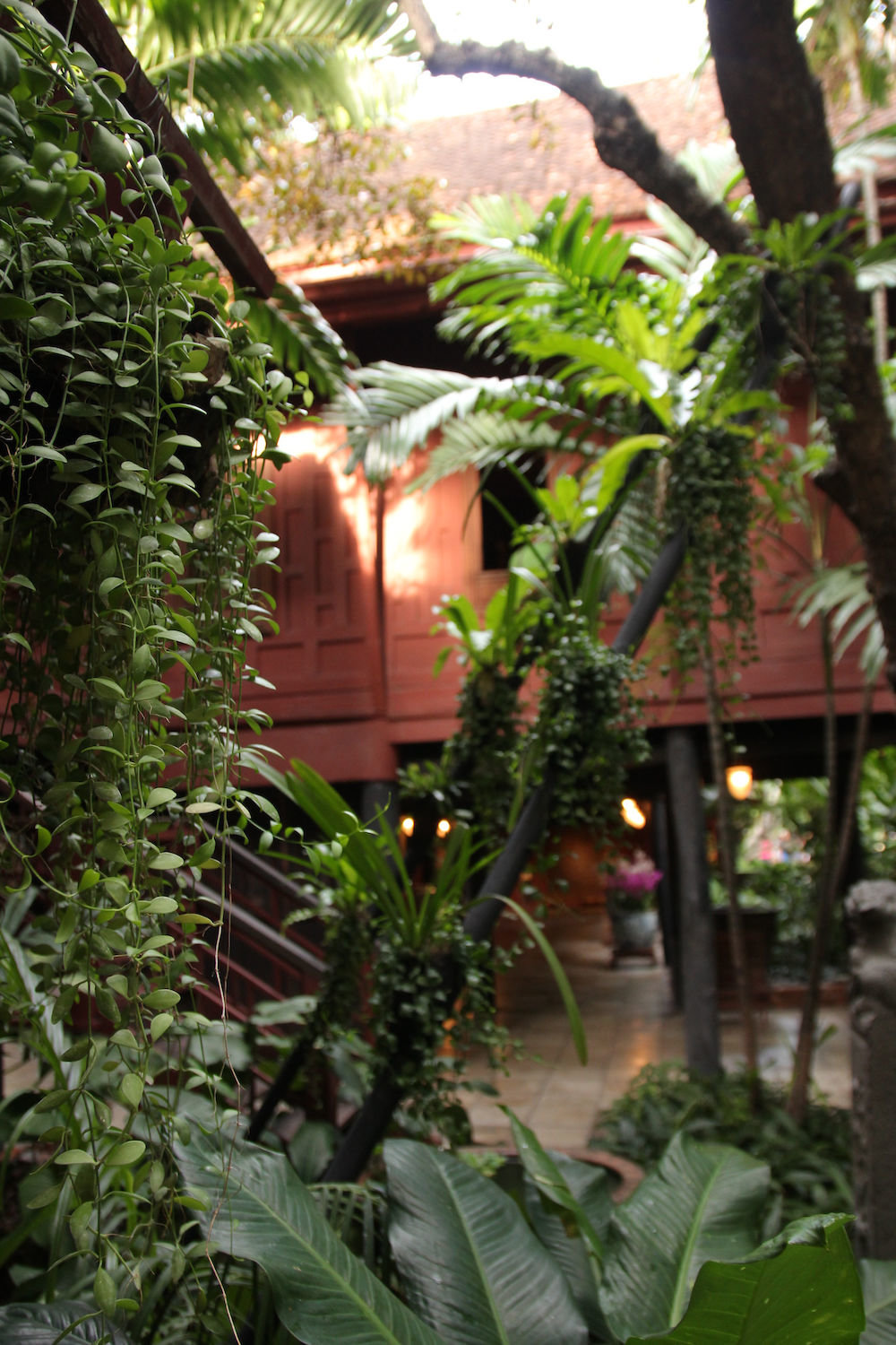 Mit dem wie immer eisigen Skytrain (in dem die Kleine immer sofort einen Sitzplatz angeboten bekommt) gings bis National Stadium zu Jim Thompsons House, eine Institution in BKK, die wir schon lange mal besichtigen wollten. Eingezwängt zwischen Wohnhochhäusern und einem Khlong, auf dem laute Boote brettern, liegt ein malerischer Garten im offenen Innenhof eines großen, auf Stelzen errichteten traditionellen Teak-Haus, das ein Ex-CIA-Mann in den Sechsigern mal für seine Sammlung erworben/gebaut hat. Sehr sehenswerte und geschmackvolle Anlage mit vielen Kunstgegenständen aus Asien. Die Kleine war auch recht beeindruckt, fand die Fische in den riesigen Pötten und die Schildkröte im Teich aber natürlich interessanter.