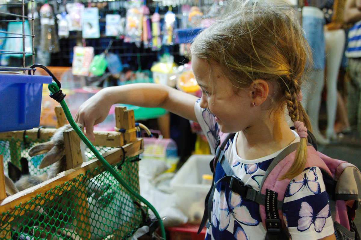 Auf dem Nachtmarkt am Straßenrand haben wir noch eine Drachenfrucht erworben, der Welpe noch vor dem Essen eine frische Waffel. Auch kleine Kaninchen wurden feilgeboten, die der Welpe natürlich zu gerne mitgenommen hätte.