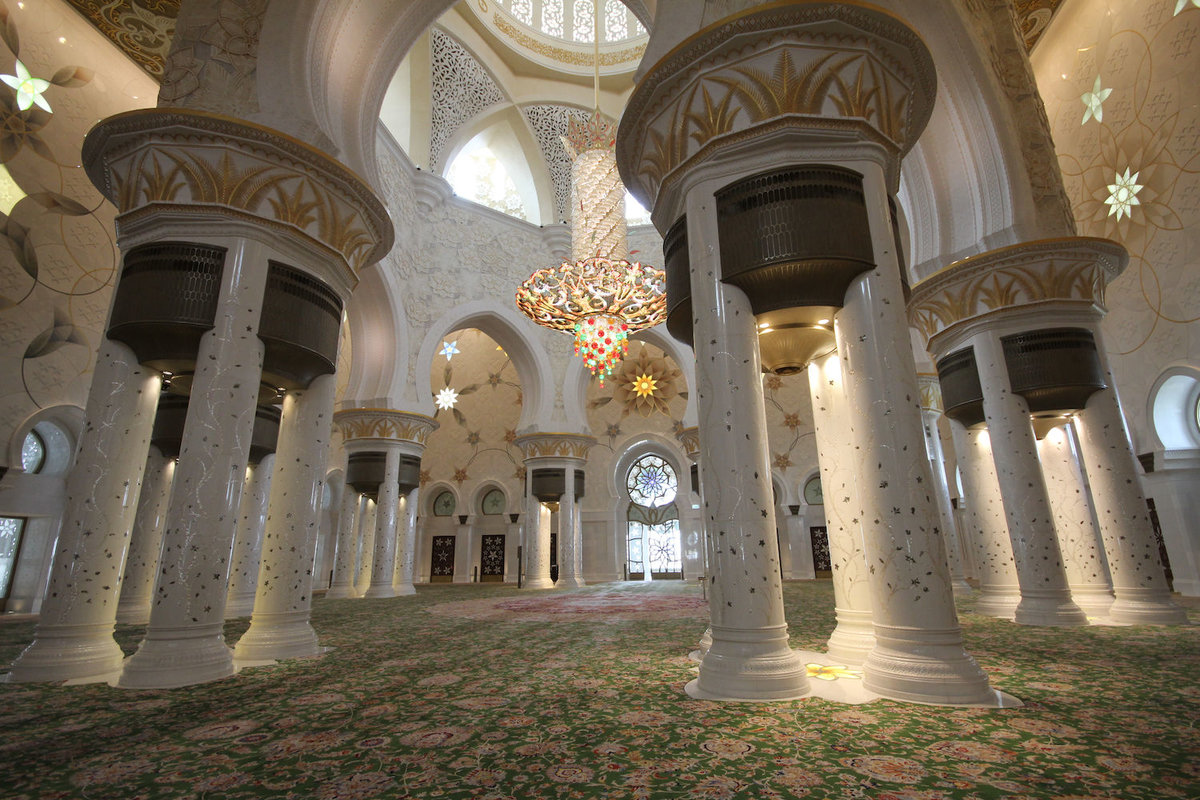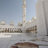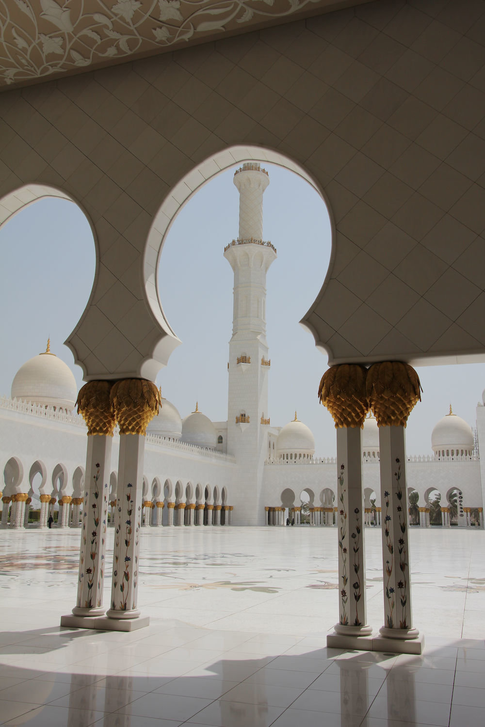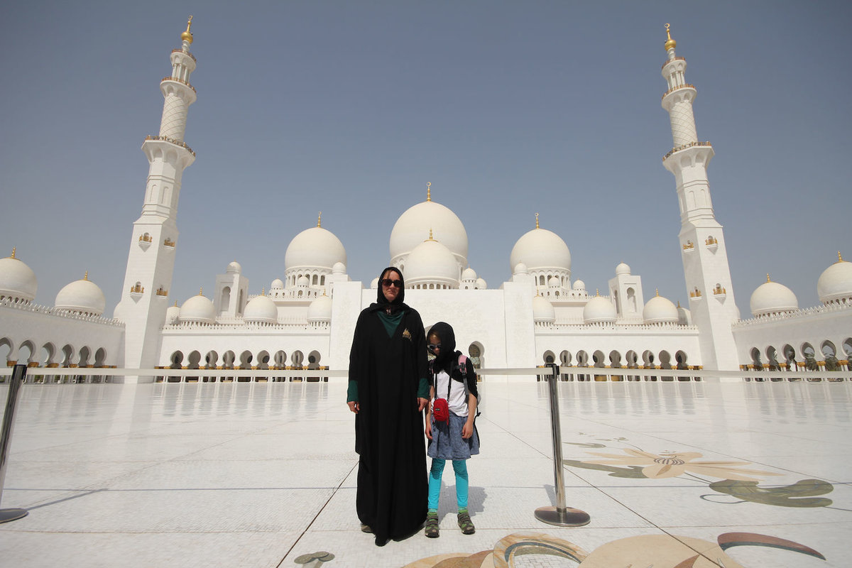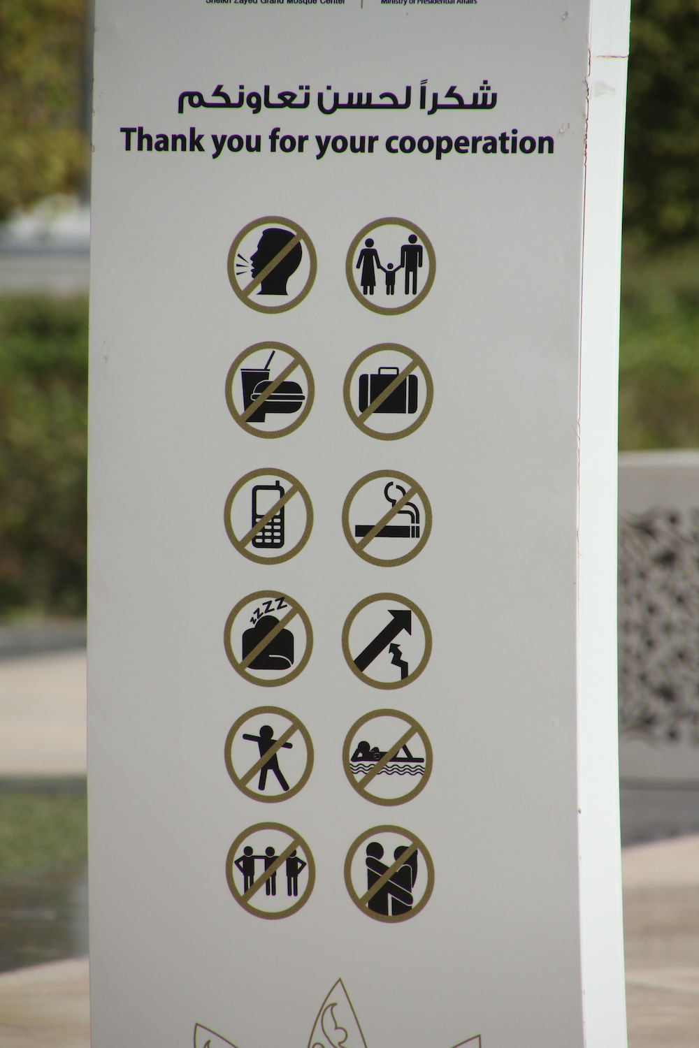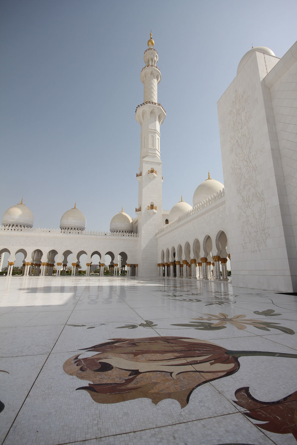 Im morgendlichen AUH gingen fast alle Passagiere gleich zum Transfer, wir wollten aber die zur Verfügung stehenden 6 Stunden gerne nutzen und sind in Richtung Immigration. Wir haben ein paar Dirham abgehoben, noch etwas rumgelungert, bis es spät genug für eine Tour zur Sheik Zayed Moschee war. Die Mitarbeiter in der Flughafeninfo sagten, das Taxi würde ca 50 Dirham kosten, die Leute am Prepaid-Taxistand 150. Im Taxi selbst waren es dann faire 65, also etwa 15 €. Wir haben uns mit zwei Münchnern die Tour geteilt. Schon morgens um 9 haben einem 38 Grad ins Gesicht gehauen, aber das Taxi hatte Klimaanlage. Die paar Minuten vor 9, die wir dann doch zu früh da waren, haben wir dann auch konsequent mit laufendem Taxameter im Wagen verbracht, weil die Hitze auf dem Steinboden in der Sonne wirklich zu heftig war.