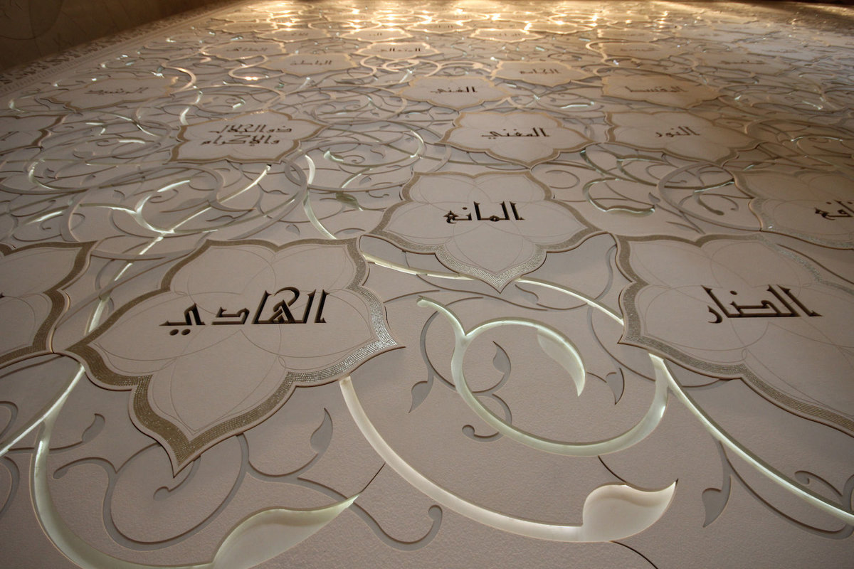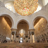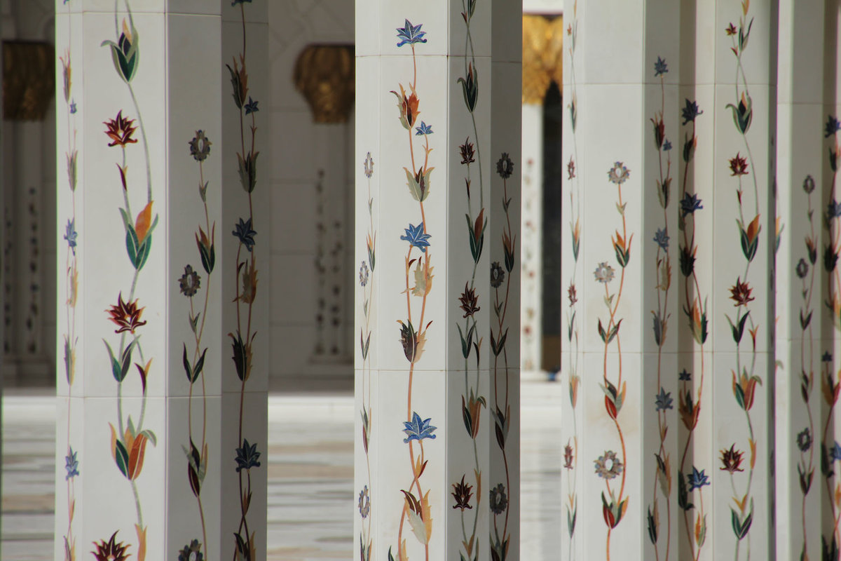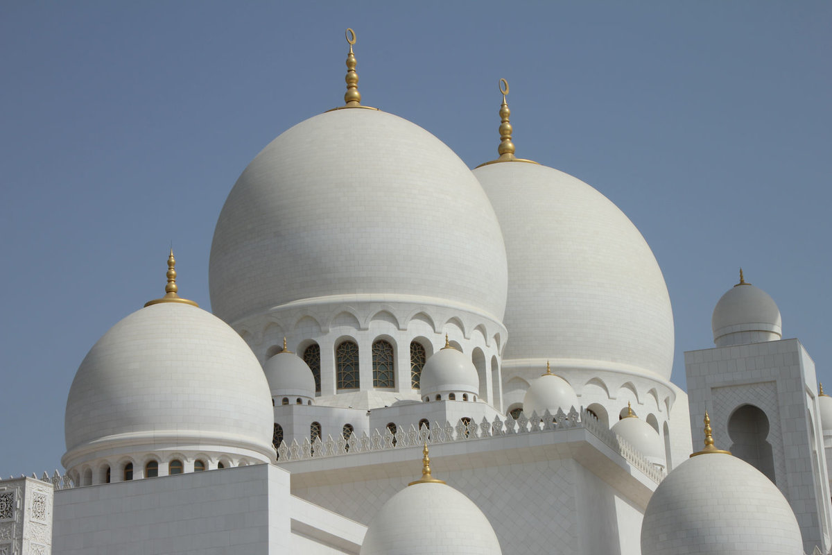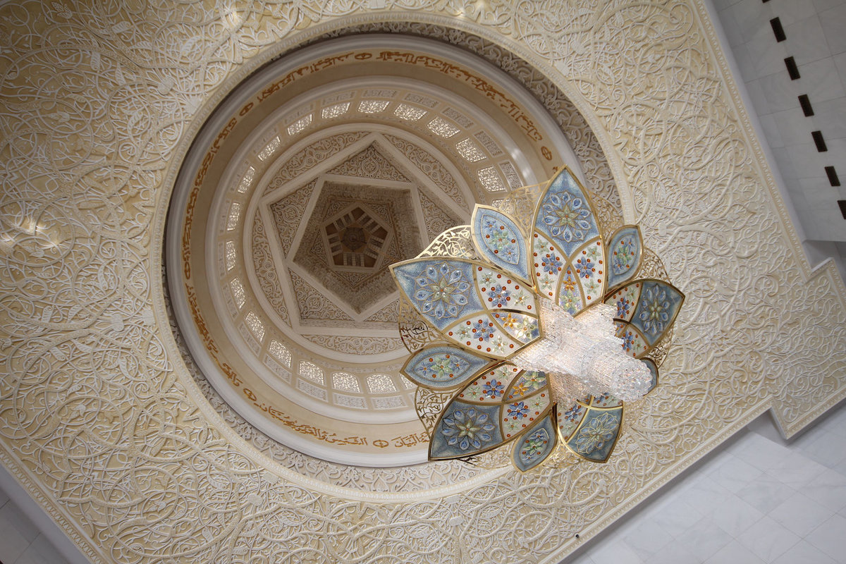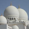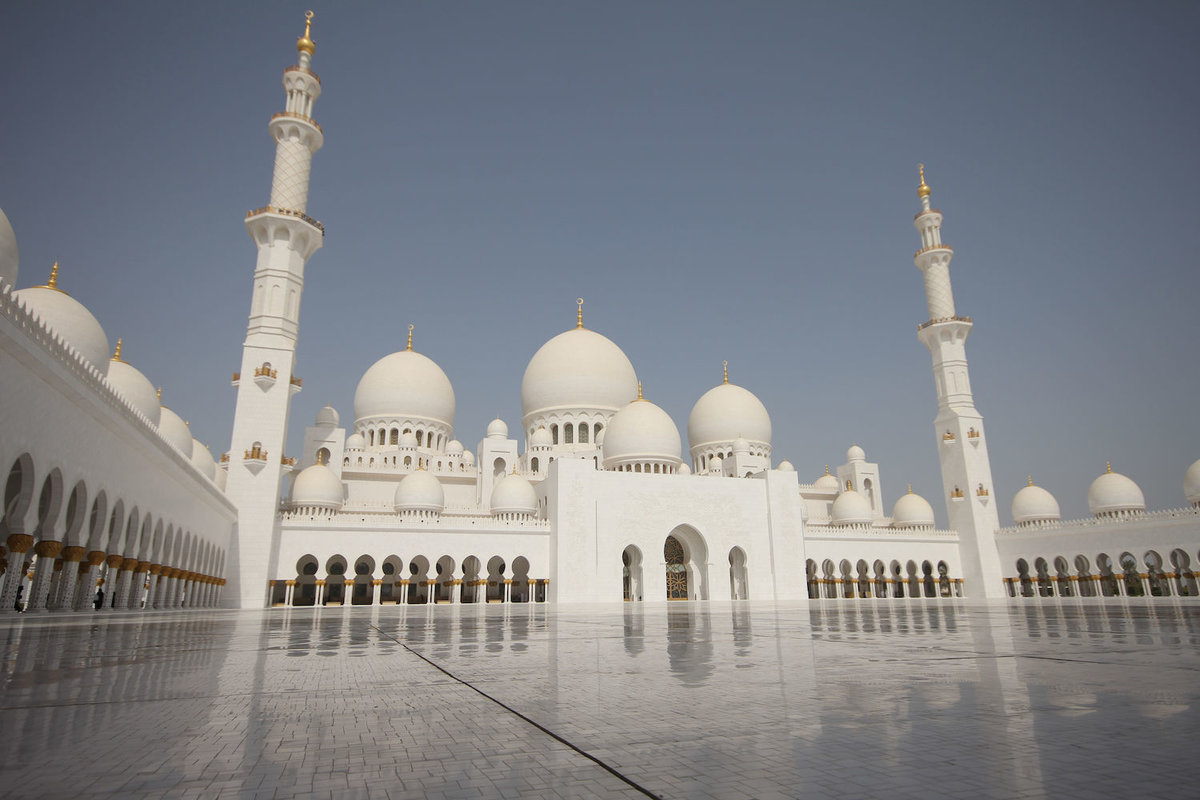Im morgendlichen AUH gingen fast alle Passagiere gleich zum Transfer, wir wollten aber die zur Verfügung stehenden 6 Stunden gerne nutzen und sind in Richtung Immigration. Wir haben ein paar Dirham abgehoben, noch etwas rumgelungert, bis es spät genug für eine Tour zur Sheik Zayed Moschee war. Die Mitarbeiter in der Flughafeninfo sagten, das Taxi würde ca 50 Dirham kosten, die Leute am Prepaid-Taxistand 150. Im Taxi selbst waren es dann faire 65, also etwa 15 €. Wir haben uns mit zwei Münchnern die Tour geteilt. Schon morgens um 9 haben einem 38 Grad ins Gesicht gehauen, aber das Taxi hatte Klimaanlage. Die paar Minuten vor 9, die wir dann doch zu früh da waren, haben wir dann auch konsequent mit laufendem Taxameter im Wagen verbracht, weil die Hitze auf dem Steinboden in der Sonne wirklich zu heftig war.
