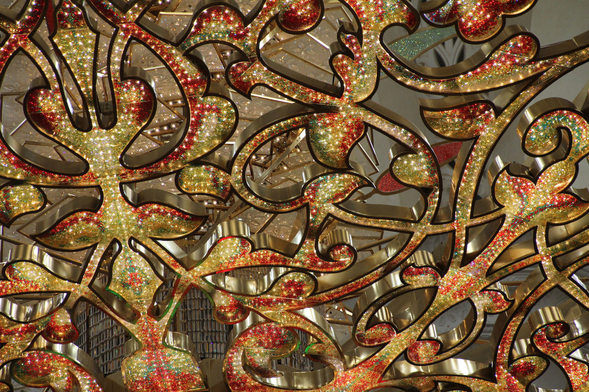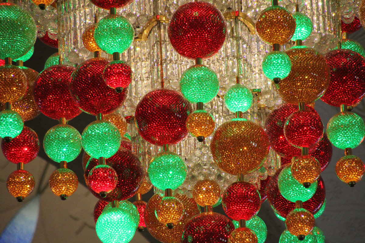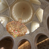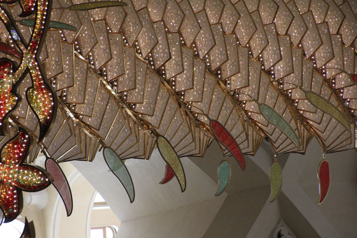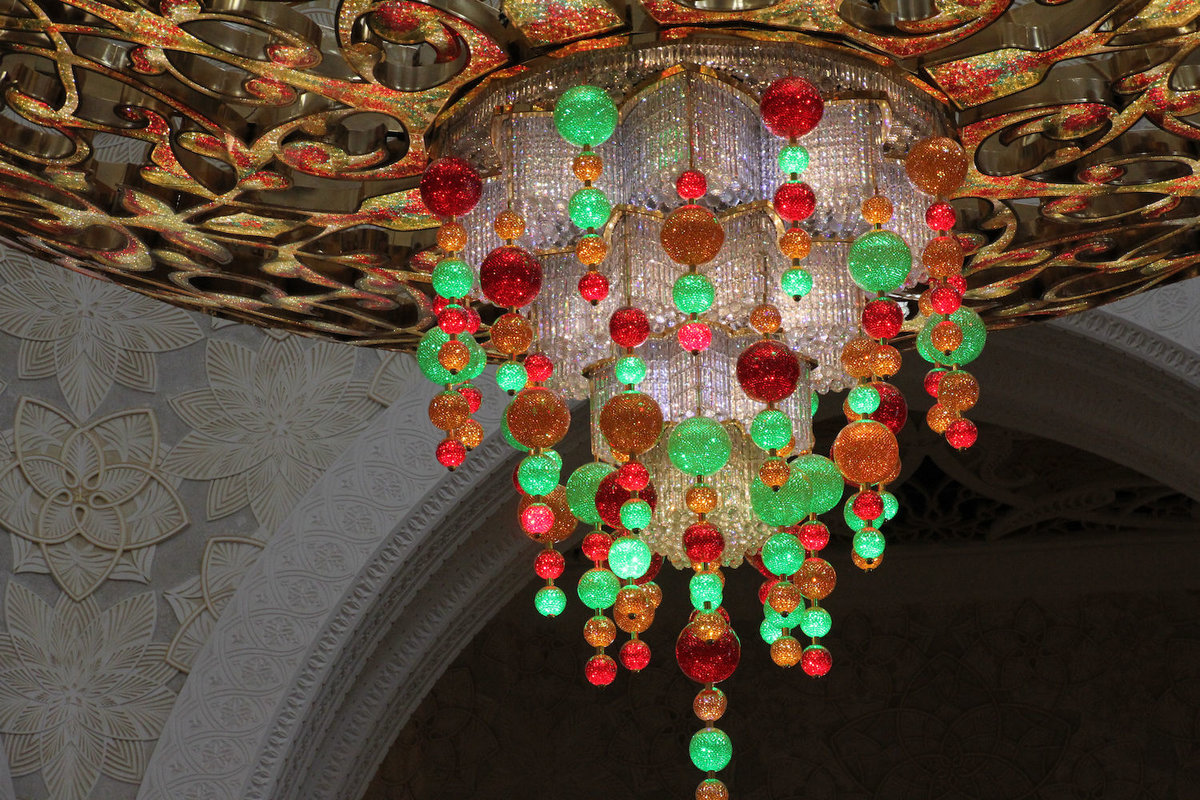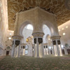 Um 10 ging nach etwas Wartezeit in den schattigen, aber nicht kühlen Kollonaden eine Führung los, die vom Guide ins Mikro gesprochen wurde und alle Teilnehmer mit ihren Knöpfen im Ohr hören konnten, auch wenn man sich ein wenig von der Gruppe entfernte. Glücklicherweise fand der größte Teil der Erklärungen in der riesigen, beteppichten und klimatisierten Halle statt, einer Mischung aus pompösen Säulen, knallig bunten Kandelabern und filligranen Einlegearbeiten. Wirklich sehr beeindruckend! Das Ding ist erst 9 Jahre alt und kann unter anderem mit dem größten Teppich der Welt aufwarten.