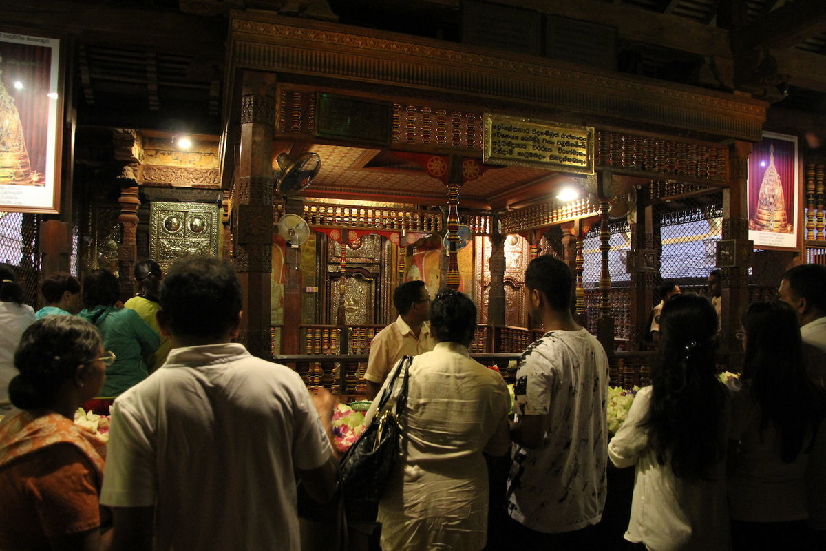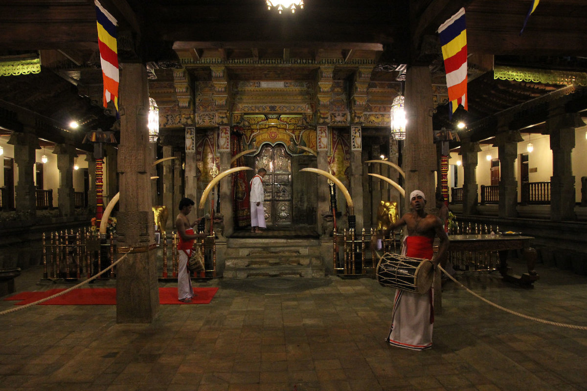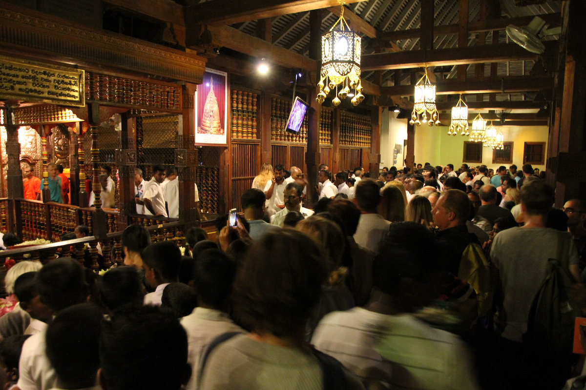 Der Zahntempel hütet einen Zahn Buddhas, allerdings bekommt man den nicht zu sehen, nur Abends eine Weile lang das goldene Gefäß, in dem er liegen soll. Wir hatten das Glück (?) ziemlich genau zu so einer Zeremonie im Tempel zu sein. Allerdings wurde das eine sehr laute (Trommeln und Tröte), enge und warme Angelegenheit, weil zur entsprechenden Zeit an der passenden Stelle ein ziemliches Geschiebe und Gequetsche einsetzt, aus der man eigentlich nicht herauskommt. Man wartet einfach ab und lässt den schwitzenden Strom an sich vorbeiziehen. Nach einer halben Stunde sind 90% der Pilger und Touris dann wieder weg und man hat eine unstressige Möglichkeit, einen Blick auf dieses Gefäß zu werfen. Leider muss man während der Zeit die sehr laute Musik ertragen, Die (unverstärkten) Musiker waren zwar laut wie Motörhead, aber lustlos und auch die Bühnenshow war eher simpel gehalten. Zugaben gab es nicht.