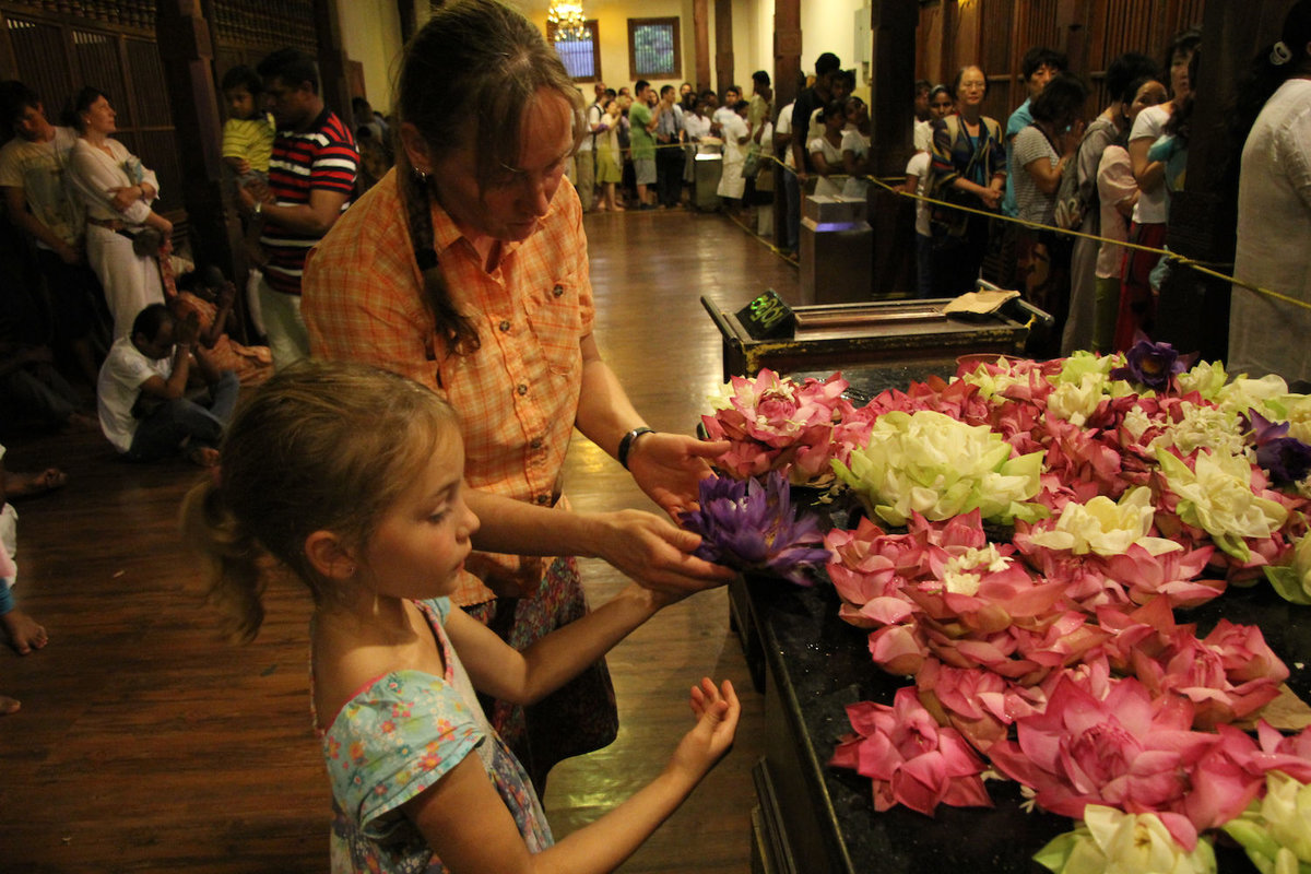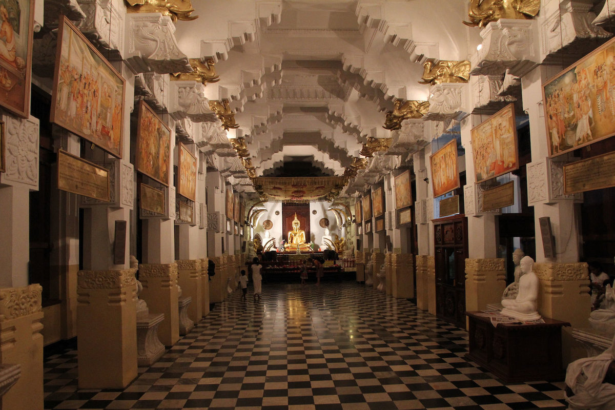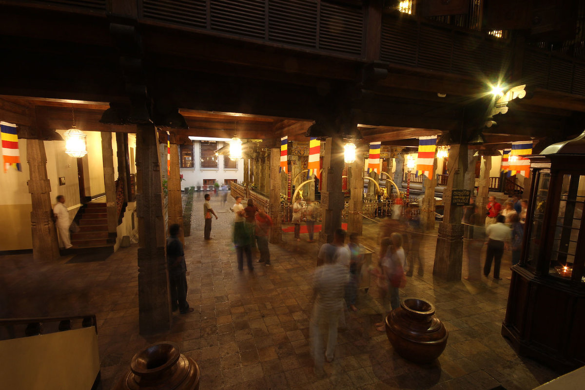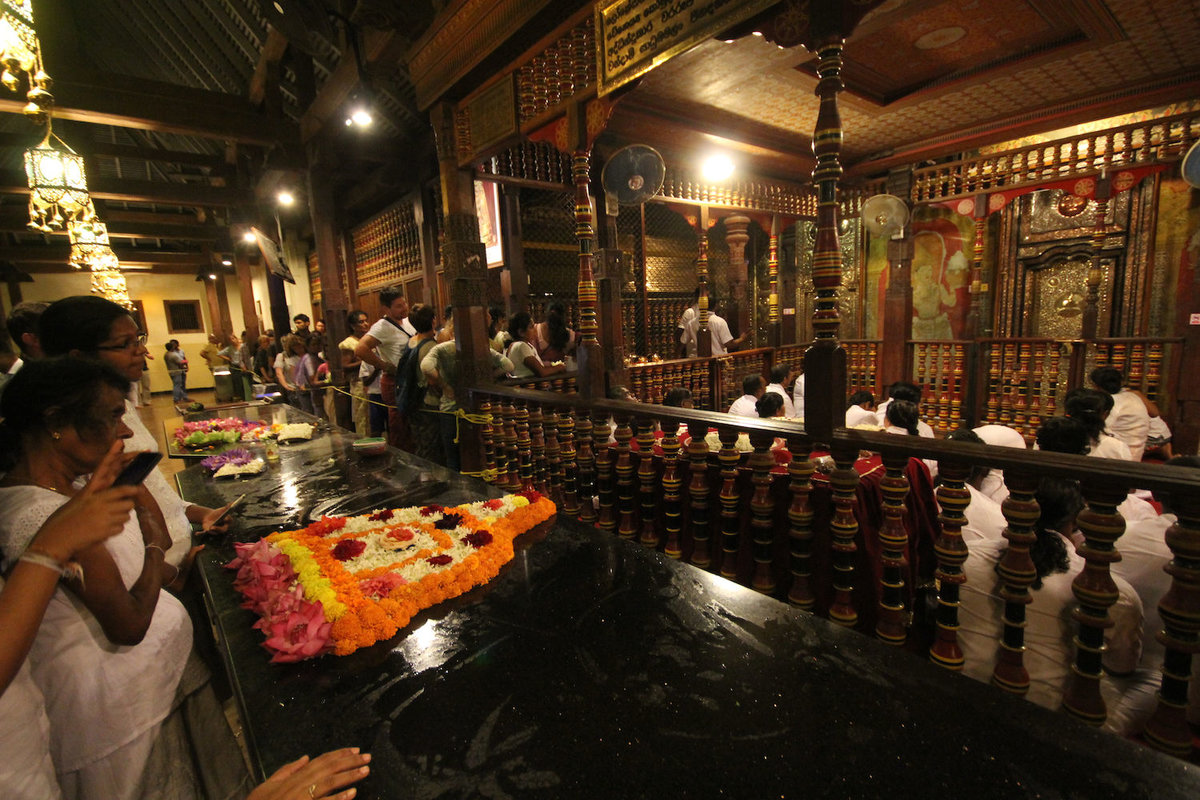 Der Zahntempel hütet einen Zahn Buddhas, allerdings bekommt man den nicht zu sehen, nur Abends eine Weile lang das goldene Gefäß, in dem er liegen soll. Wir hatten das Glück (?) ziemlich genau zu so einer Zeremonie im Tempel zu sein. Allerdings wurde das eine sehr laute (Trommeln und Tröte), enge und warme Angelegenheit, weil zur entsprechenden Zeit an der passenden Stelle ein ziemliches Geschiebe und Gequetsche einsetzt, aus der man eigentlich nicht herauskommt. Man wartet einfach ab und lässt den schwitzenden Strom an sich vorbeiziehen. Nach einer halben Stunde sind 90% der Pilger und Touris dann wieder weg und man hat eine unstressige Möglichkeit, einen Blick auf dieses Gefäß zu werfen. Leider muss man während der Zeit die sehr laute Musik ertragen, Die (unverstärkten) Musiker waren zwar laut wie Motörhead, aber lustlos und auch die Bühnenshow war eher simpel gehalten. Zugaben gab es nicht.