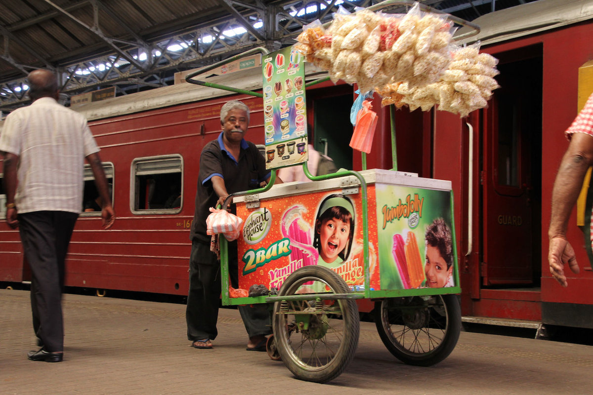 Nach einem kleinen Abschnitt mitten durch einen Bazar waren wir am Bahnhof – und hatten gut eine Stunde Wartezeit. Wenn wir gleich darauf gesetzt hätten, mit dem 3w nach Colombo zu fahren, anstatt mit dem Bus, hätten wir eine Stunde länger schlafen können. OK, egal.
