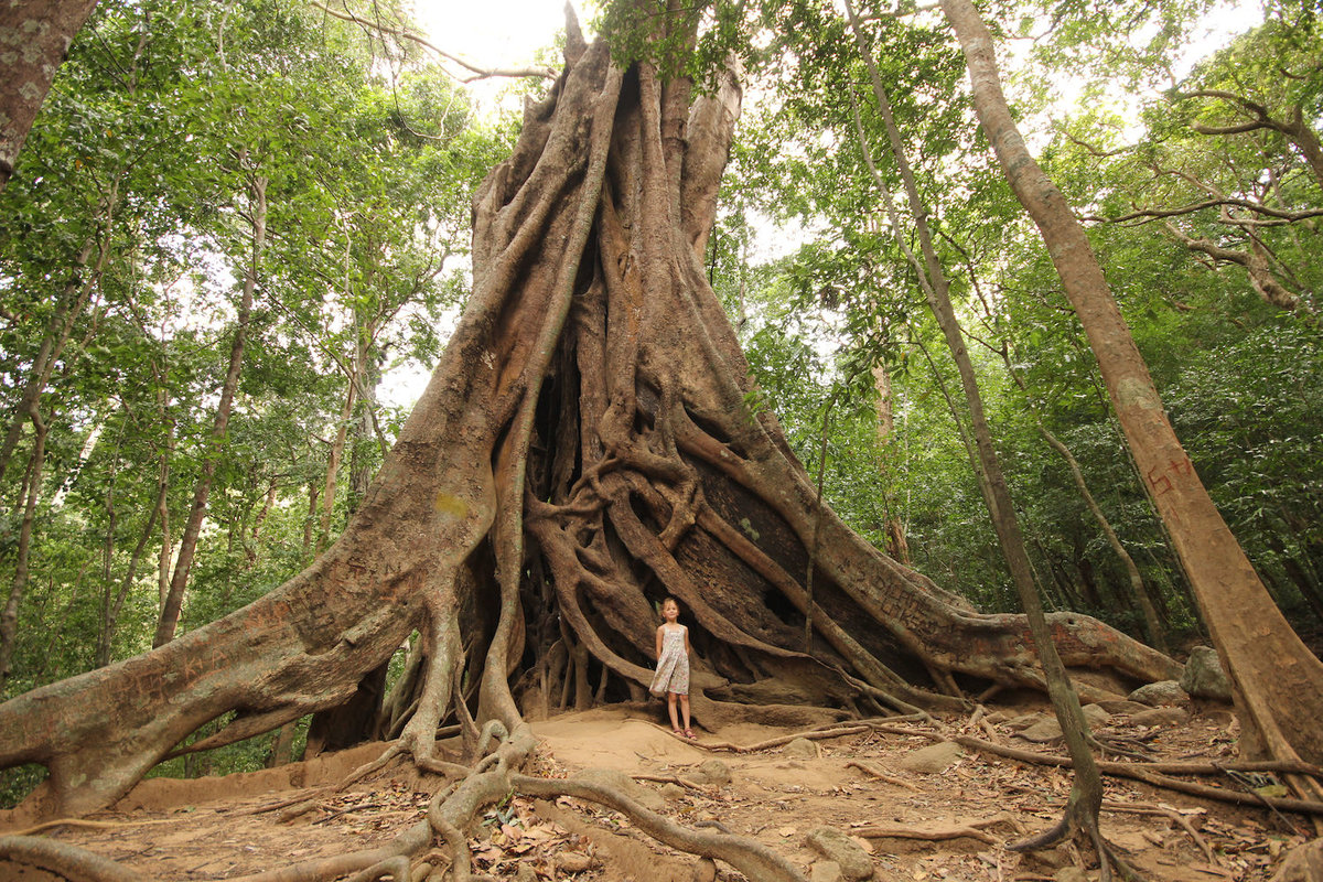 Ein später weiter oben gepflasterter, unten aber über Steinruinenblöcke führender Weg führt durch einen tollen Dschungel den Hügel hoch, man läuft angenehm im Schatten, über einem rauschen die Baumwipfel von teilweise unglaublich dicken alten Bäumen mit Unmengen tentakelartiger Wurzeln. Der größte soll tatsächlich etwa 2000 Jahre alt sein. Glaub ich sofort, nachdem wir ihn gesehen haben.
