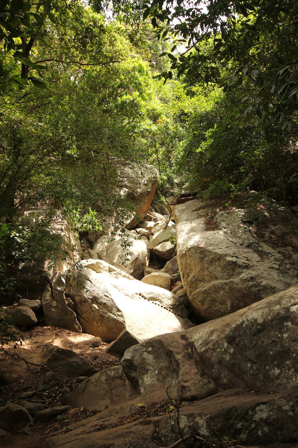 Die Bauwerke dieses buddhistischen Klosters sind für den Besucher zunächst hier nicht so das Highlight, aber immerhin sind sie teilweise über 2000 Jahre alt und haben ungewöhnlicherweise keine Buddhabilder, Stupas, Bodhibäume, etc, weil sie von einem sehr asketischen Bettelorden gebaut wurden. Den einzigen Schmuck haben hier die Latrinensteine, damit man auf den ganzen Schmuck und Prunk der Welt pissen konnte. (Das ist wirklich die gängige Interpretation!). Mit etwas Suchen findet man dann auch abseits des Weges z.B. eine Bibliothekruine auf einem riesigen Felsen in einer Flusskaskade mit einer kleinen Brücke. Und man ahnt anhand der ganzen behauenen Felsbrocken im Wald, dass es hier noch deutlich mehr gegeben haben muss.
