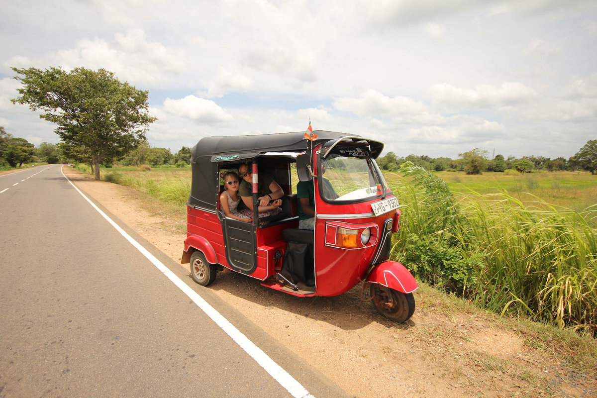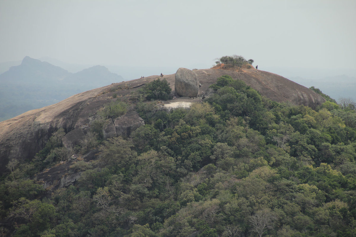 Nach dem sehr viel weniger anstrengenden Abstieg und noch einer fast gefrorenen Fanta am Ausgang (es gibt tatsächlich auf dem ganzen Gelände, auch nicht auf dem heißen, fast schattenlosen Felsen weder Getränkeverkauf noch ein Klo …), sind wir mit dem 3w nach Ritigala gefahren, dem Ort, den die Driver am späten Nachmittag wegen der wilden Elefanten nicht fahren wollen. Auf viel zu schmalen Straßen angesichts der sporadischen fetten entgegenkommenden Laster und Busse ging es nach Norden und schließlich eine kleine Sandpiste durch einen naturgeschützten Dschungel zu einem kleinen Parkplatz, wo die Wächter der Anlage unsere Namen in ein Besucherbuch schrieben und um eine kleine Spende für die Anlage baten. Ansonsten war der Eintritt frei.