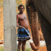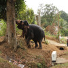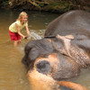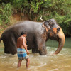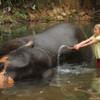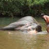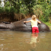 Nachmittags gings zum Fluss, um das Tier zu waschen. Es lag träge und gemütlich auf der Seite im Wasser, atmete mit dem Rüssel als Schnorchel und ließ sich von uns mit Kokosschalen den Rücken schrubben. Das war schon eine tolle Sache und der Welpe wollte gar nicht mehr aufhören, an der harten Haut herumzubürsten. Der Mahoot bellte dem Viech dann immer wieder ziemlich harsche Kommandos zu, um z.B. auch seine Füße reinigen zu können.