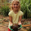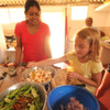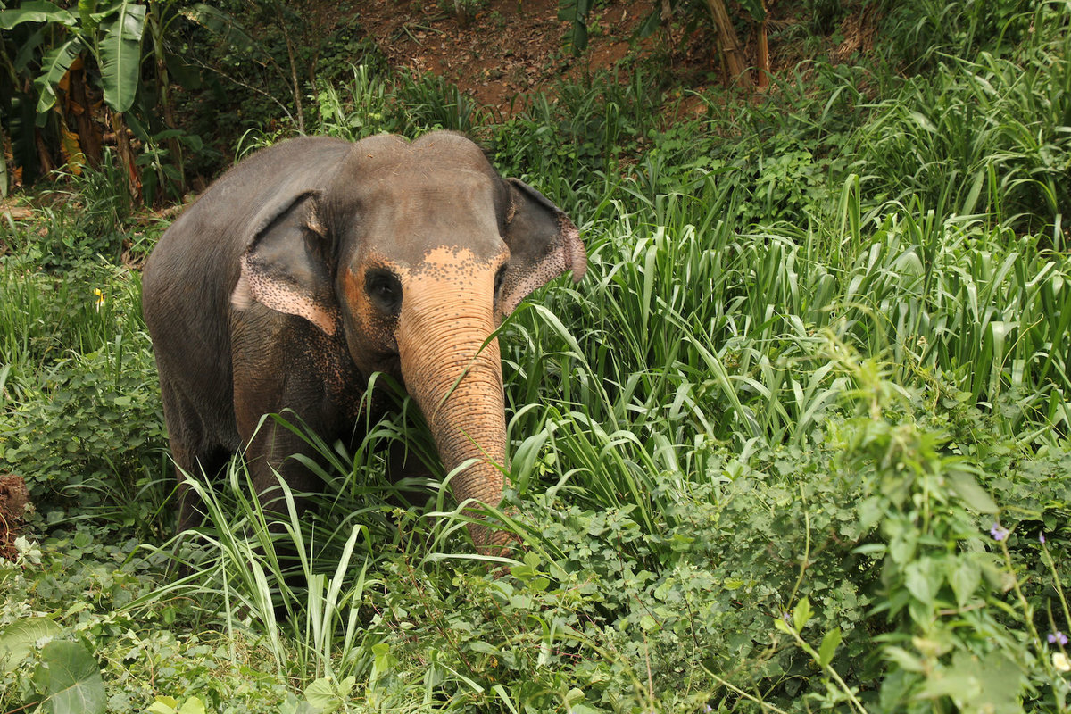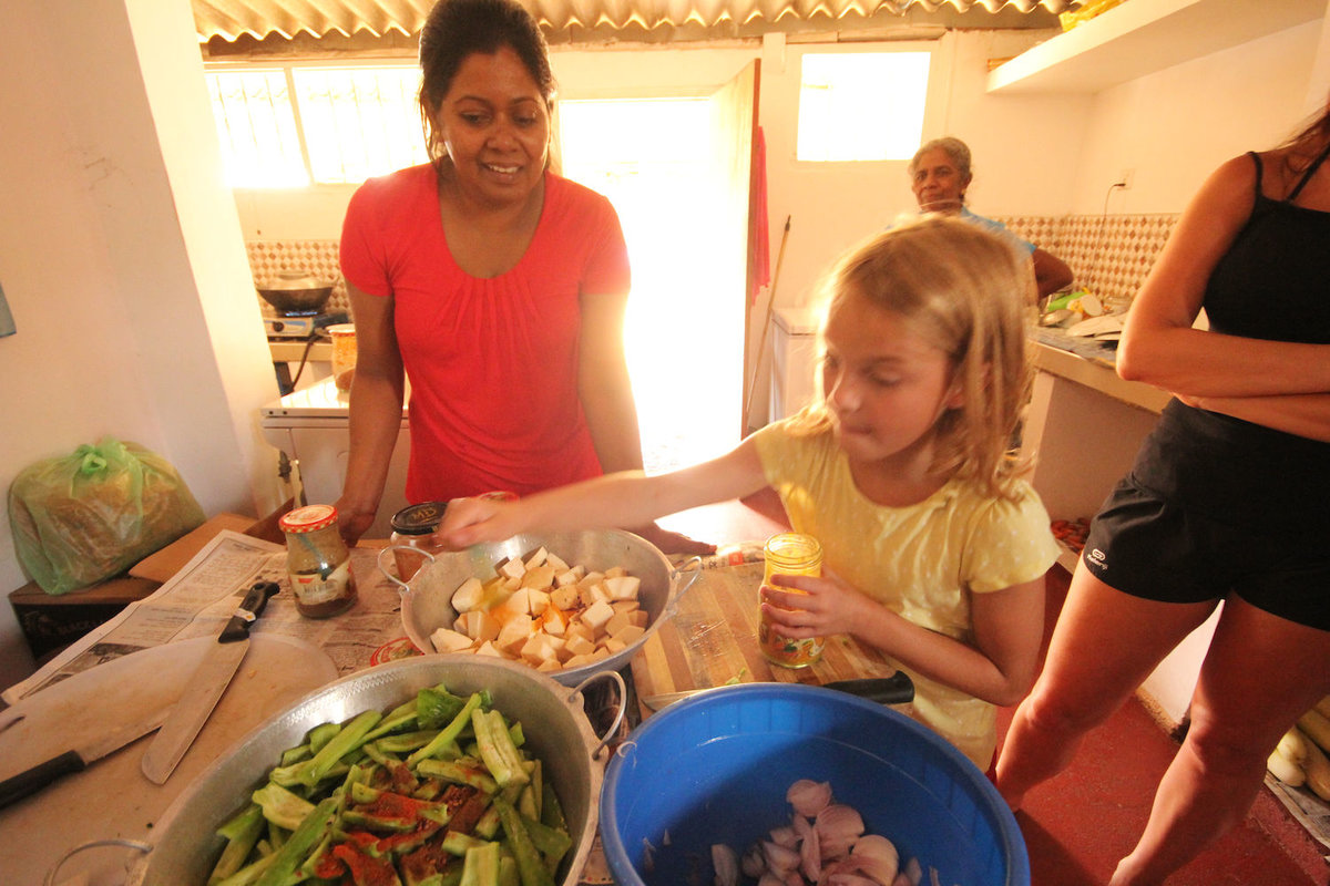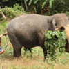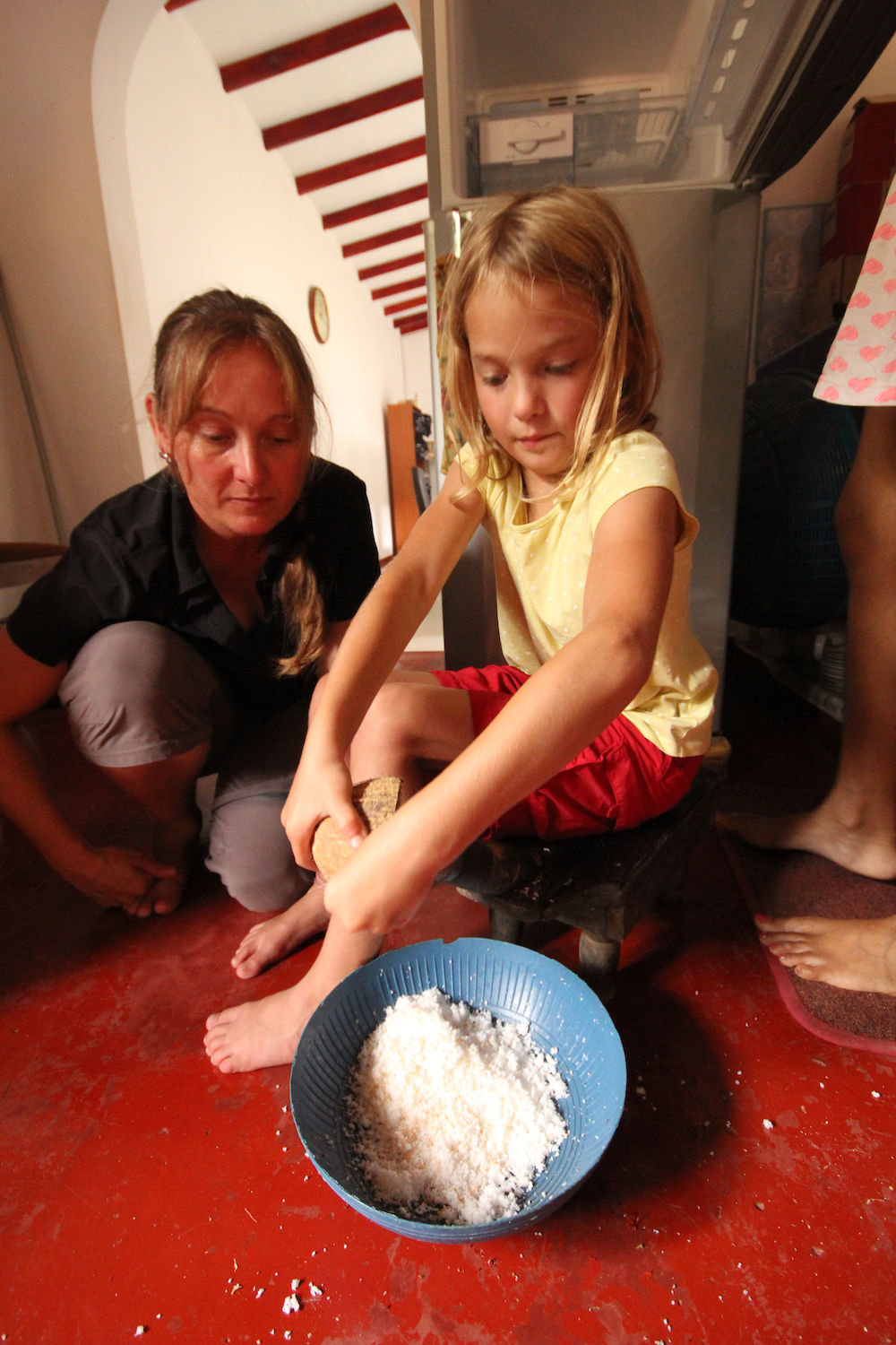 Nach Reiningung des Stalls (Einsammeln von Elefantenkötteln) ging es mit ihr etwas die Straße entlang zu einem Baugrund, wo sie etwa 1,5 Stunden Grünzeug futtern konnte, anschließend wieder zurück zum Stall. Wir haben dann beim Kochen geholfen (Schnippeln und vor allem Ausschaben von Kokosnüssen, um Kokosmilch zu bekommen) und das leckere Curry dann auch als Mittag bekommen (Curries mit Kartoffel, mit Brotfrucht und Schlangenfrucht sowie Kokos-Sambalpaste zu Reis).