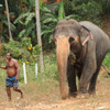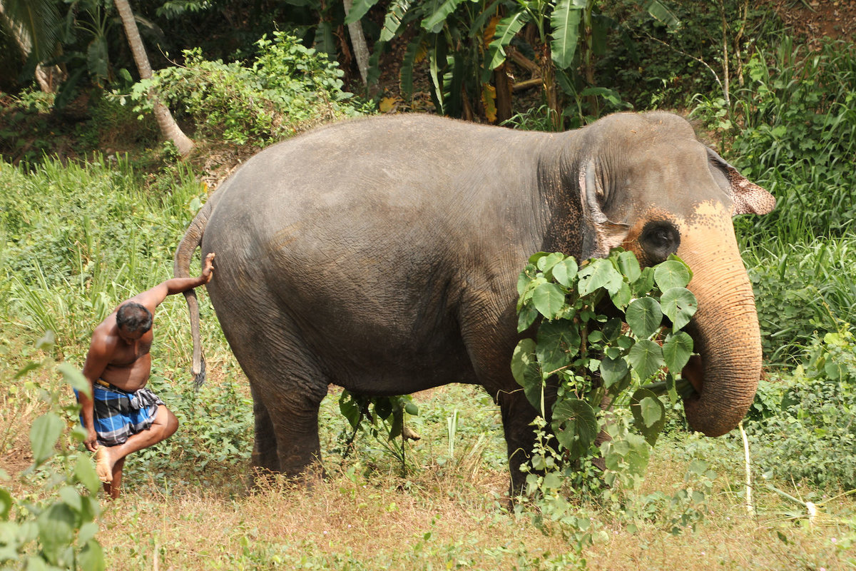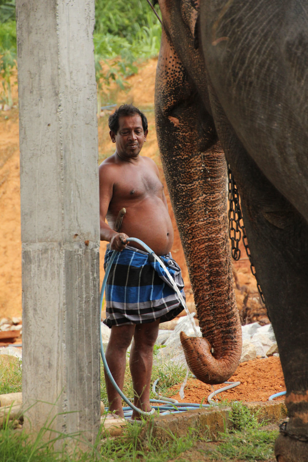 27.08.2016 – Pinnawala – Durch Carsons Frühstück hervorragend gestärkt, sind wir zum Elephant Freedom Project gefahren, um dort ein wenig näheren Kontakt zu einem Elefanten aufzunehmen. Die Leute dort mieten Elefanten dauerhaft (kaufen ist praktisch nicht möglich, weil eigentlich Niemand seinen Elefanten je verkauft), um ihnen ein einfacheres Leben zu bieten als immer nur Holz durch den Wald zu zerren oder Touris durch die Städte zu tragen. Eigentlich haben sie zwei, einer (der zahmere der beiden) wurde aber von seinem Besitzer zu einem Tempelfest abkommandiert. So hatten wir leider nur den etwas unnahbareren Elefanten zur Verfügung.