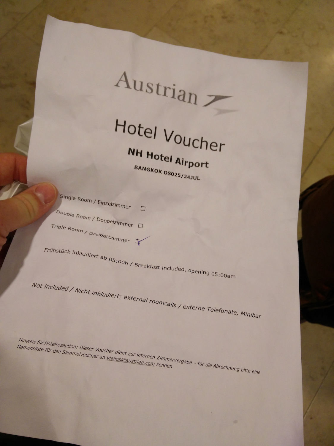 Beim Boarding erfuhren wir dann, dass die Maschine nach Wien 80 Minuten Verspätung haben wird, weil die eigentlich vorgesehene Defekt ist. Grmpf, denn in Wien hatten wir eigentlich nur knapp 2 Stunden Umsteigezeit. Das kappt nie und nimmer! Grmpf. Noch während wir begannen, uns richtig warmzuärgern, kommt eine SMS von AUA (Austrian Airlines), dass unser Anschluss in Wien auch defekt ist und eine neue Maschine kommen muss, so dass dieser Flug dann 7:20 Verspätung haben wird. Sieben Stunden und 20 Minuten! GRMPF, denn der Anschluss in BKK würde urspünglich etwa 8 Stunden nach der geplanten Landung starten. An sich ja ein bequemes Polster, um nochmal nach Downtown Bangkok zu fahren, etwas Futter einzuwerfen und nochwas anzugucken. Das schaffen wir doch nie und nimmer! Grmpf.