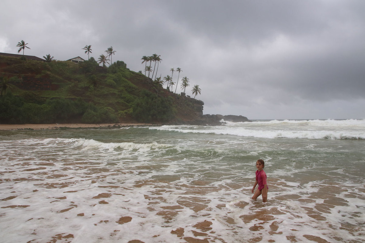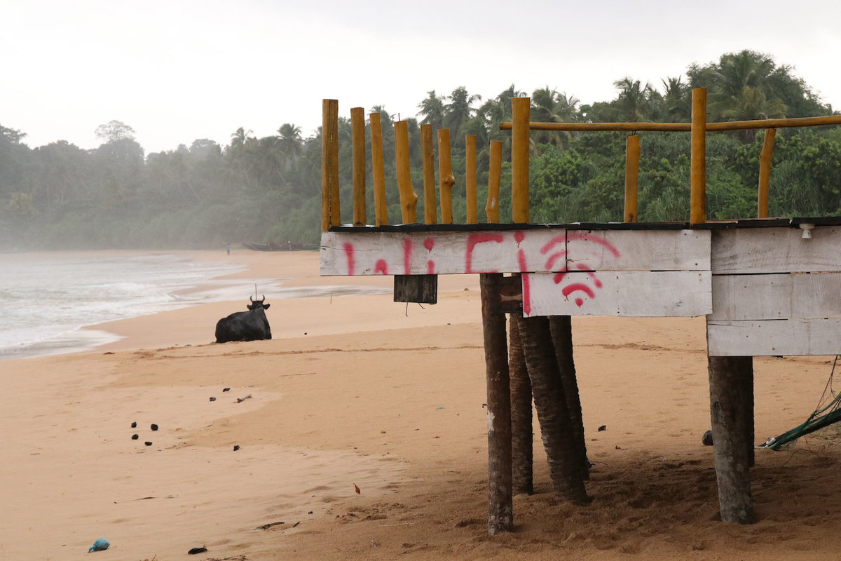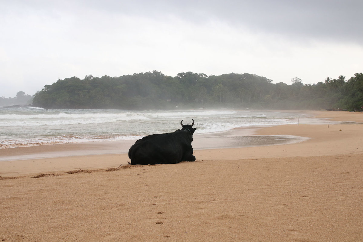 31.07.2017 Talalla – Geduldig wie die lokalen Kühe haben wir heute die langen Regenphasen erduldet, die ab ca. Mittag einsetzten. Zumindest den Morgen konnten vor allem der Welpe und sein Freund noch ein wenig im Wasser verbringen. Danach setzte ergiebiger Regen ein, den wir aber gut mit einer Kanne Tee und Pommes auf der Veranda und unserem Restaurant-am-Abhang überstanden haben.