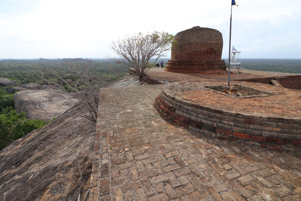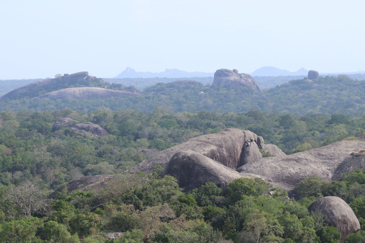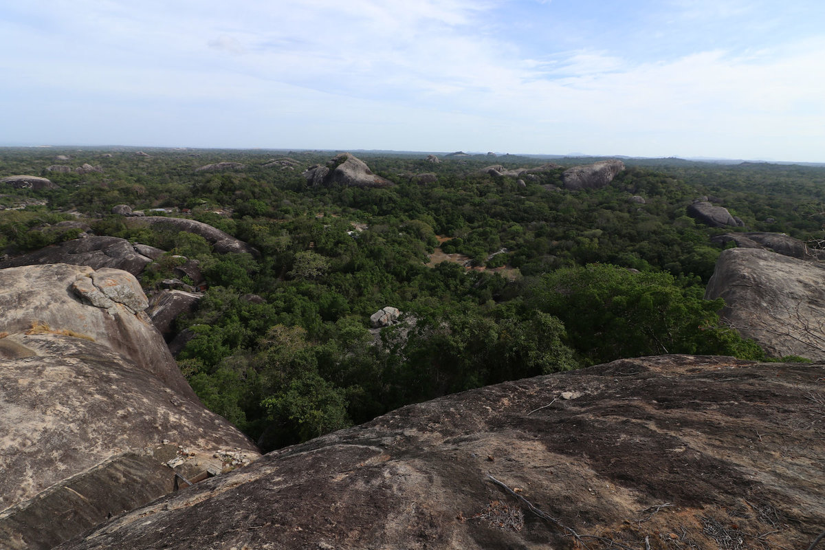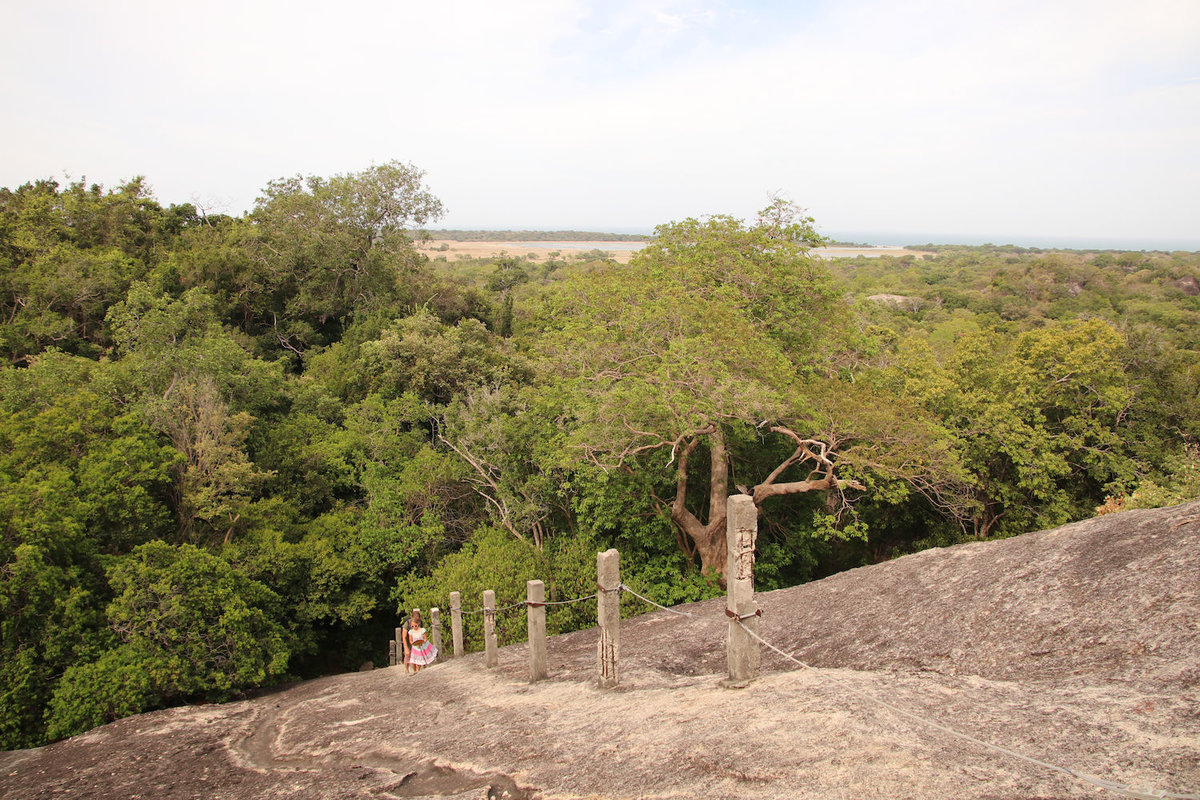 Nach dem Duschen und einer Futter- und Kaffeepause (natürlich im Gecko) sind wir nachmittags noch zu einer 3wheel-Fahrt zum Felsenkloster Kudumbigala aufgebrochen. Ca. 40% des Weges waren asphaltiert, der Rest eine sehr staubige Sandpiste durch eine (derzeit trockene) dschungelige Landschaft (Nationalpark), auf der aber auch große Mengen der durchgeknallten Überlandbusse entlangrasten und alles überholten, was weniger PS hat. Zur Regenzeit kann mal wohl auch viele Elefanten und Krokodile hier sehen, aber abgesehen von einem Elefantenhintern, den der Welpe schwört, erblickt zu haben, sagen wir nur ein paar Affen, Wasserbüffel und sehr viele Pfauen (Pfaue?), bestimmt 30-40, die in der grauen Landschaft noch viel bunter aussahen.