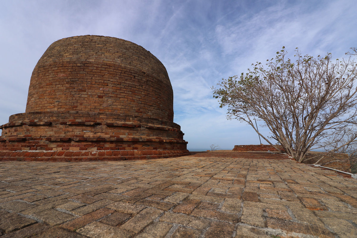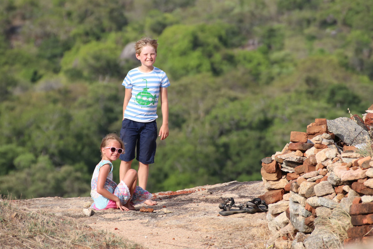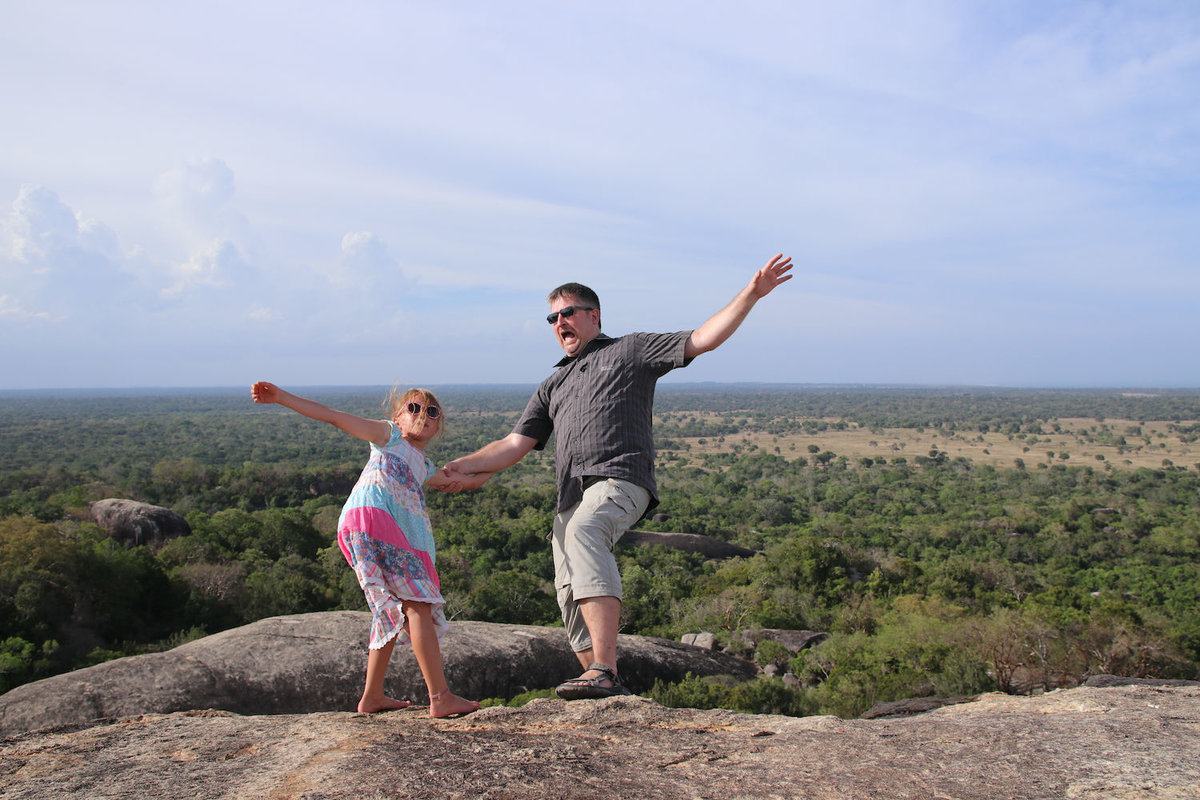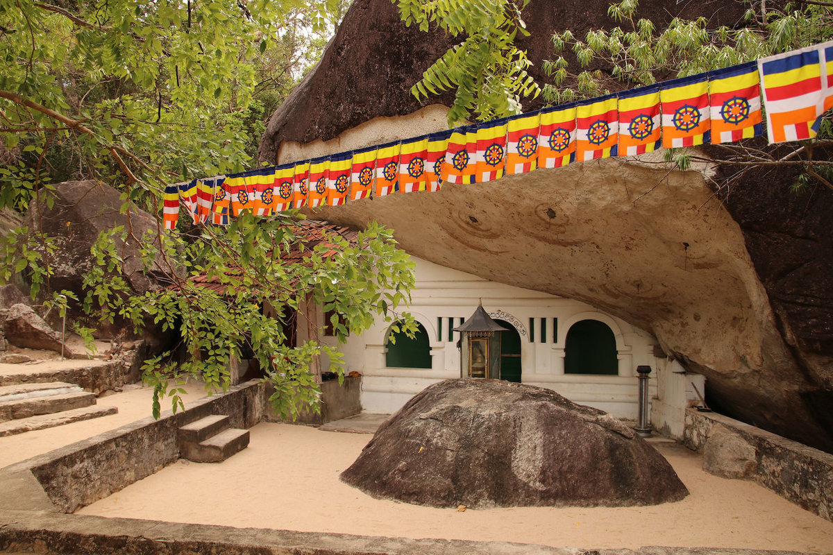 Nach dem Duschen und einer Futter- und Kaffeepause (natürlich im Gecko) sind wir nachmittags noch zu einer 3wheel-Fahrt zum Felsenkloster Kudumbigala aufgebrochen. Ca. 40% des Weges waren asphaltiert, der Rest eine sehr staubige Sandpiste durch eine (derzeit trockene) dschungelige Landschaft (Nationalpark), auf der aber auch große Mengen der durchgeknallten Überlandbusse entlangrasten und alles überholten, was weniger PS hat. Zur Regenzeit kann mal wohl auch viele Elefanten und Krokodile hier sehen, aber abgesehen von einem Elefantenhintern, den der Welpe schwört, erblickt zu haben, sagen wir nur ein paar Affen, Wasserbüffel und sehr viele Pfauen (Pfaue?), bestimmt 30-40, die in der grauen Landschaft noch viel bunter aussahen.