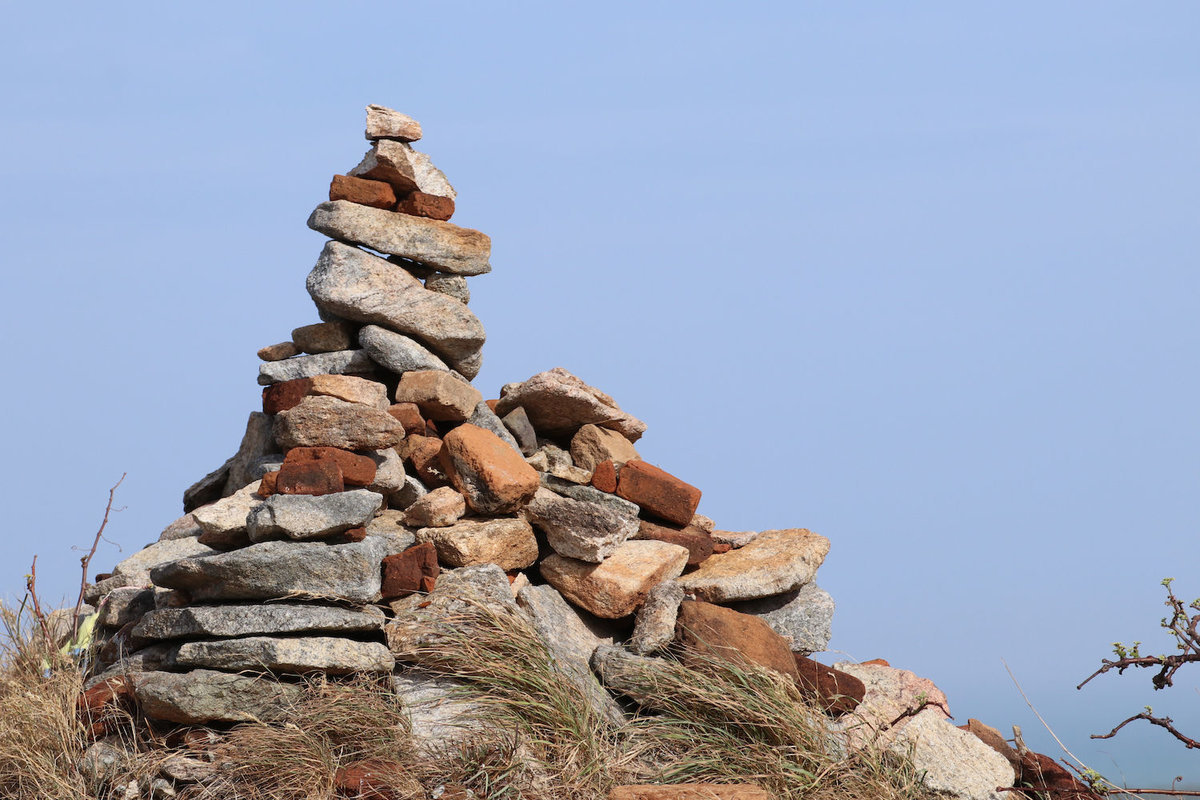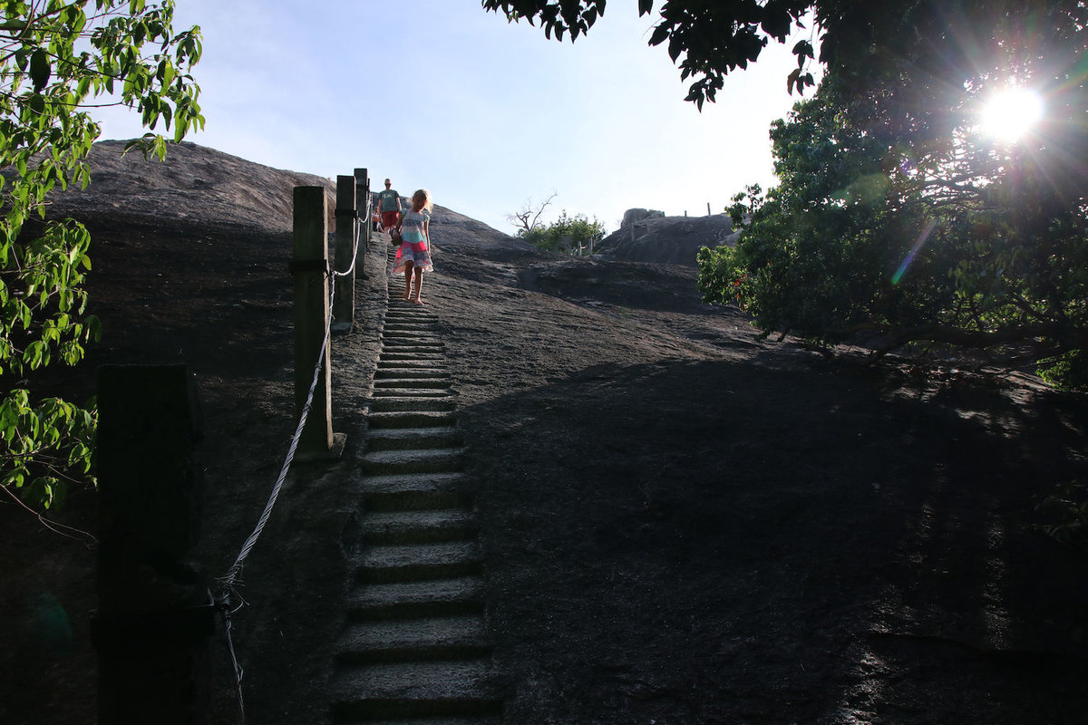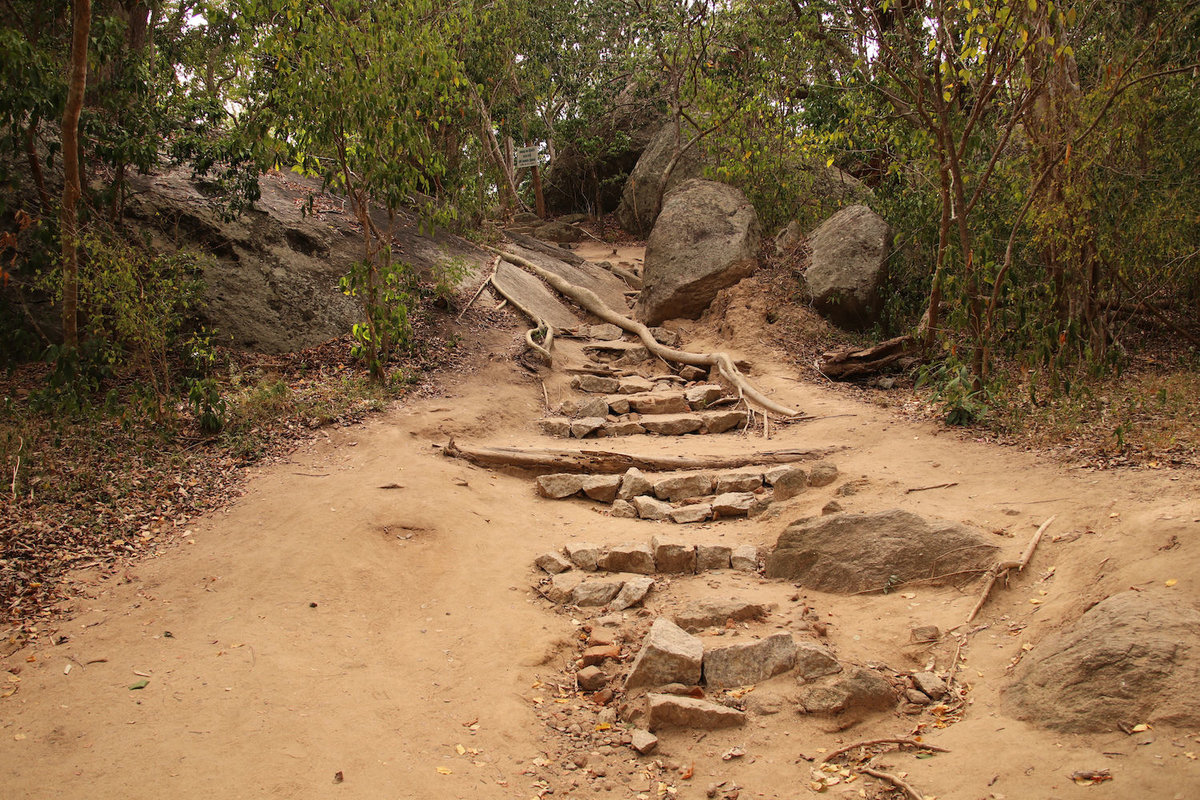 Beim Felsenkloster geht ein kleiner, einfacher Pfad durch ein kleines Dschungelstück mit Felsen, bis man zu mehreren, in den Felsen gehauenen Treppen kommt, die auf den Gipfel des Felsen führen. Oben wartet natürlich ein Stupa, vor allem aber ein toller Blick über die grüne Landschaft, die mit abgerundeten, felsigen Bergen durchzogen ist. Es kachelte leider ganz schön heftig, so dass ich Euch keine Luftbilder machen konnte.