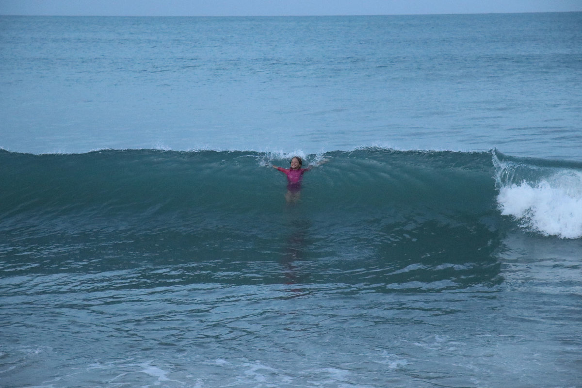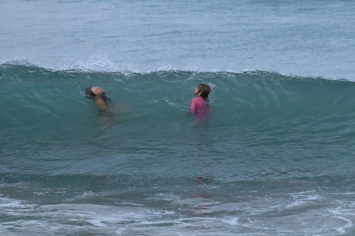 Den großen Hunden ist es so einigermaßen gelungen, sich auf das Wackelige Board zu stellen, aber der Welpe hat von uns dreien den Vogel abgeschossen und glitt schon gleich beim ersten Versuch leicht über die Wogen. Auch Johnson, der Surflehrer war bass erstaunt. Und auch die nächsten Versuche gingen erstaunlich sicher und souverän von statten. Wir haben einfach einen Seehund!