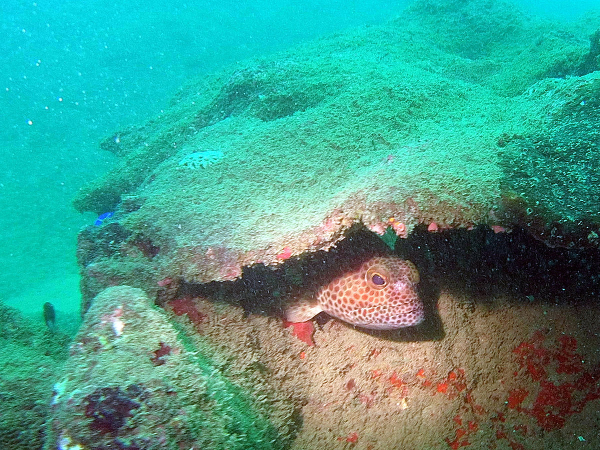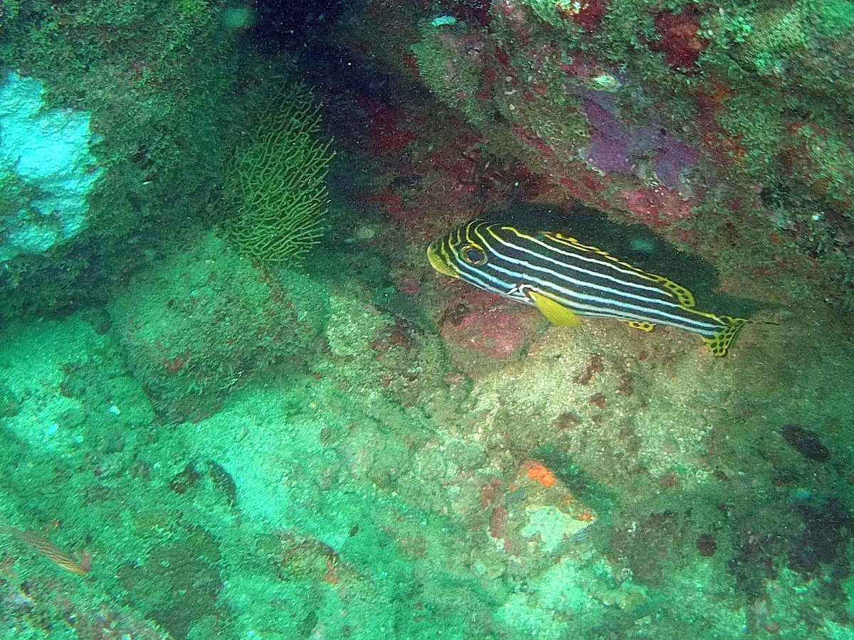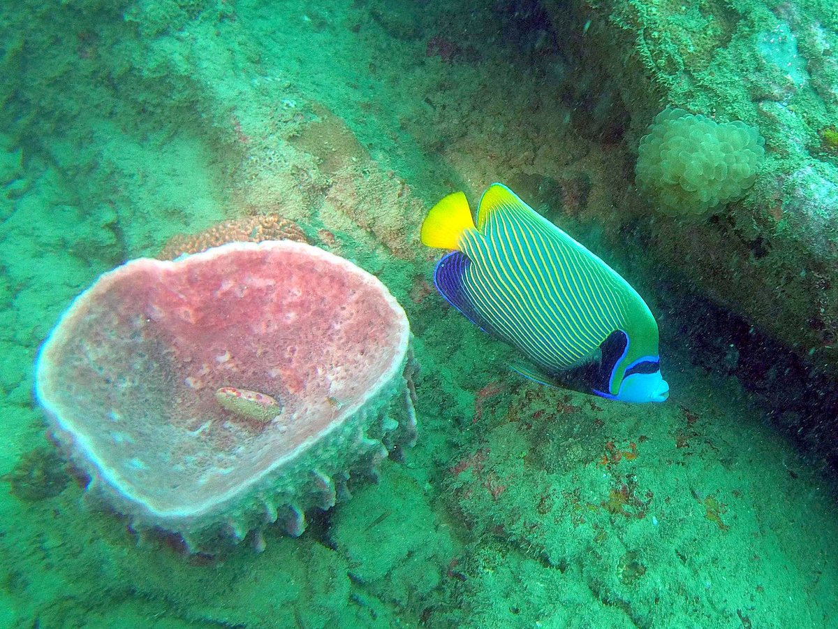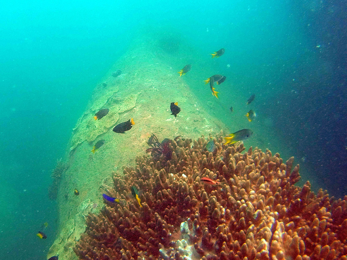 Wir hatten in 16m Tiefe leider nicht so dolle Sicht, etwa 5m, was dann auch leider dazu führte, dass wir zwei belgische Mädels von unserer Fünfergruppe recht schnell verloren haben. Der Guide hat die dann noch eine Weile gesucht und sie schließlich von der Oberfläche eingesammelt, wo sie sich korrekterweise nach fünf Minuten hinbegeben haben. Nach dieser Unterbrechung ging es dann weiter um ein paar große Felsen herum, wo sich dann doch noch einiges an Fischen und Korallen blicken lies, allerdings buchstäblich getrübt durch Detritus.