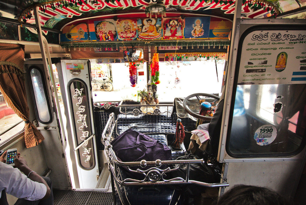 2017-08-23 Trincomalee: Gegen Mittag sind wir von Uppuveli zunächst zum Busstand in Trinco getuktukert und dann eine halbe Stunde später mit dem Bus in etwa 4 Stunden 160 km nach Südwesten gefahren. Das klingt nach einem gemütlichen Rentnertempo, ist aber ein Beispiel darüber, wie wenig Durchschnittswerte über den tatsächlichen Verlauf aussagen. In Wirklichkeit war das wieder ein irrwitziges Gerase mit permanenten, den Führerschein kostenden Überholmanövern, auch bei minimalster Sicht, unterbrochen von hektischen Bremsmanövern, um Foltergäste ein- und aussteigen lassen zu können. Aber natürlich konnte das alles nur gutgehen, weil der Busfahrer gleich nach der Abfahrt am Hindutempel anhielt, um dort zu beten und Duftstäbchen und Blumenketten zu erwerben, die dann sorgfältig vor der Weiterfahrt vorne drapiert wurden. Während der Fahrt gab es natürlich dann auch laute Bollywood-Musik, das geht ja gar nicht anders