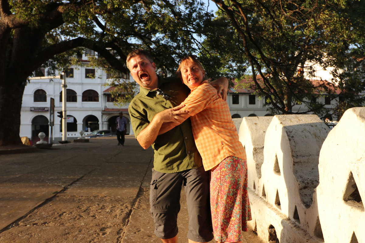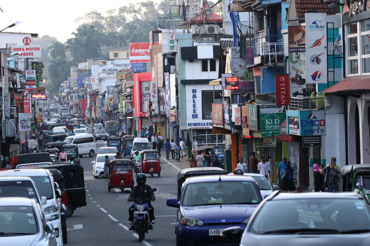 Ziemlich viel Stau während der Ausfahrt aus Kurunegala und vor allem der Einfahrt nach Kandy ließen die Fahrtzeit für die 40 km auf fast 1,5 Stunden anwachsen. Am Bahnhof ließen wir uns absetzen, erkundigten uns nach Tickets nach Peter-Falk-Stadt und heuerten ein Pickme-Tuktuk an, um zum Hotel zu kommen. Im ersten Anlauf sahen wir absolut nichts, welches nach einem Hotel aussah und mussten wegen der vielen Einbahnstraßen nocheinmal um den ganzen Curd herumfahren. Im zweiten Anlauf half uns ein Mechaniker in einer winzigen Nebenstraße und wir fanden dann auch den Eingang: eine schmucklose Treppe zwischen vielen bunten Läden und Restaurants, mit einem kleinen schwarzen Hinweisschild.
