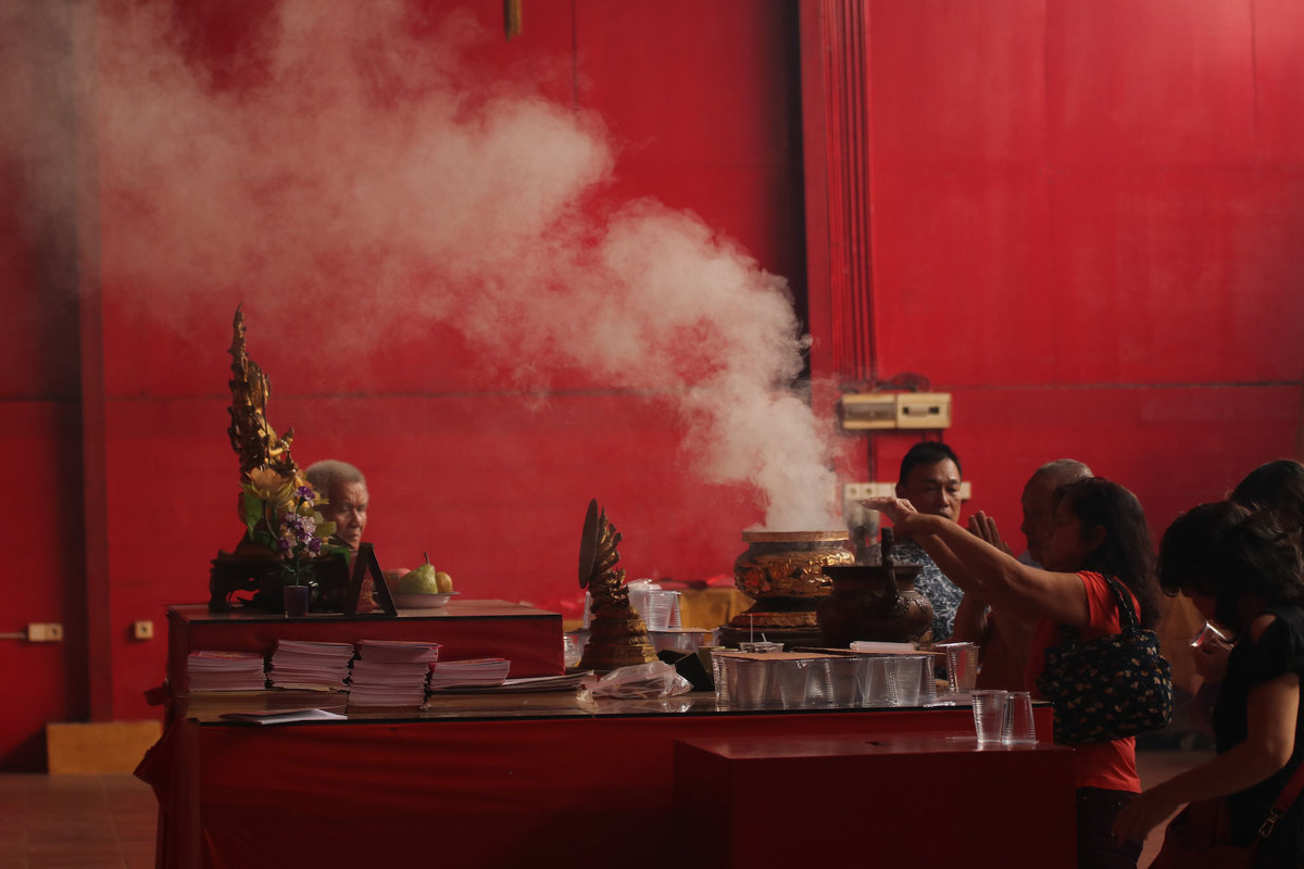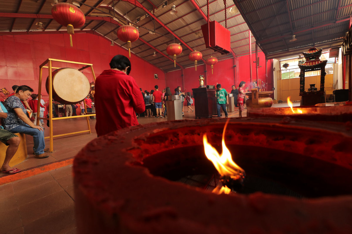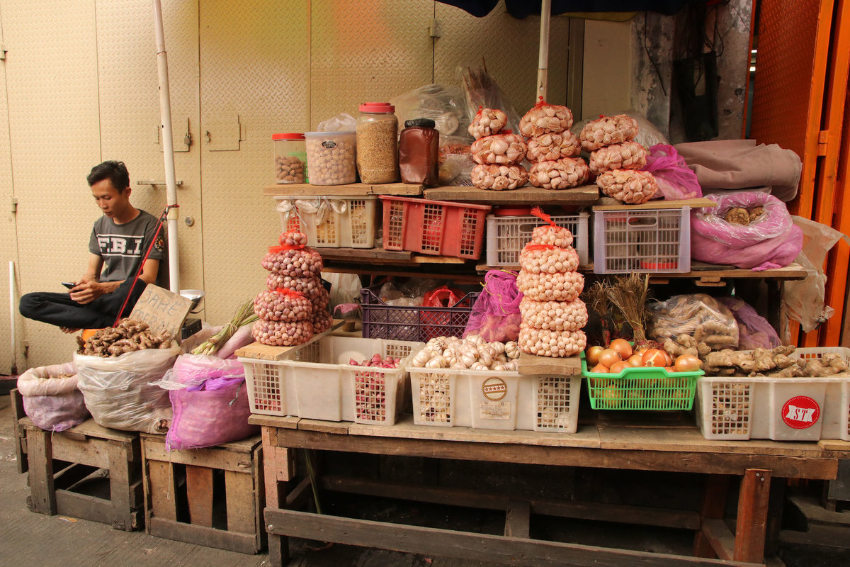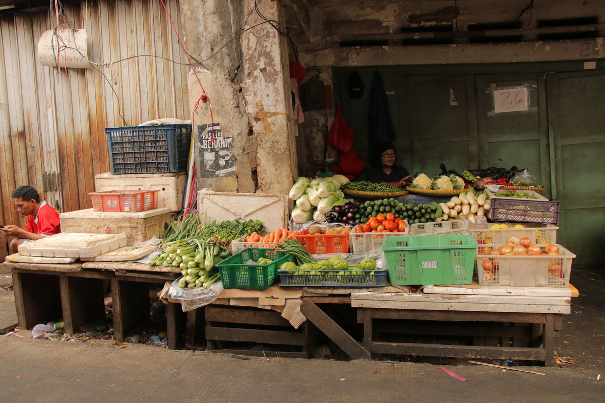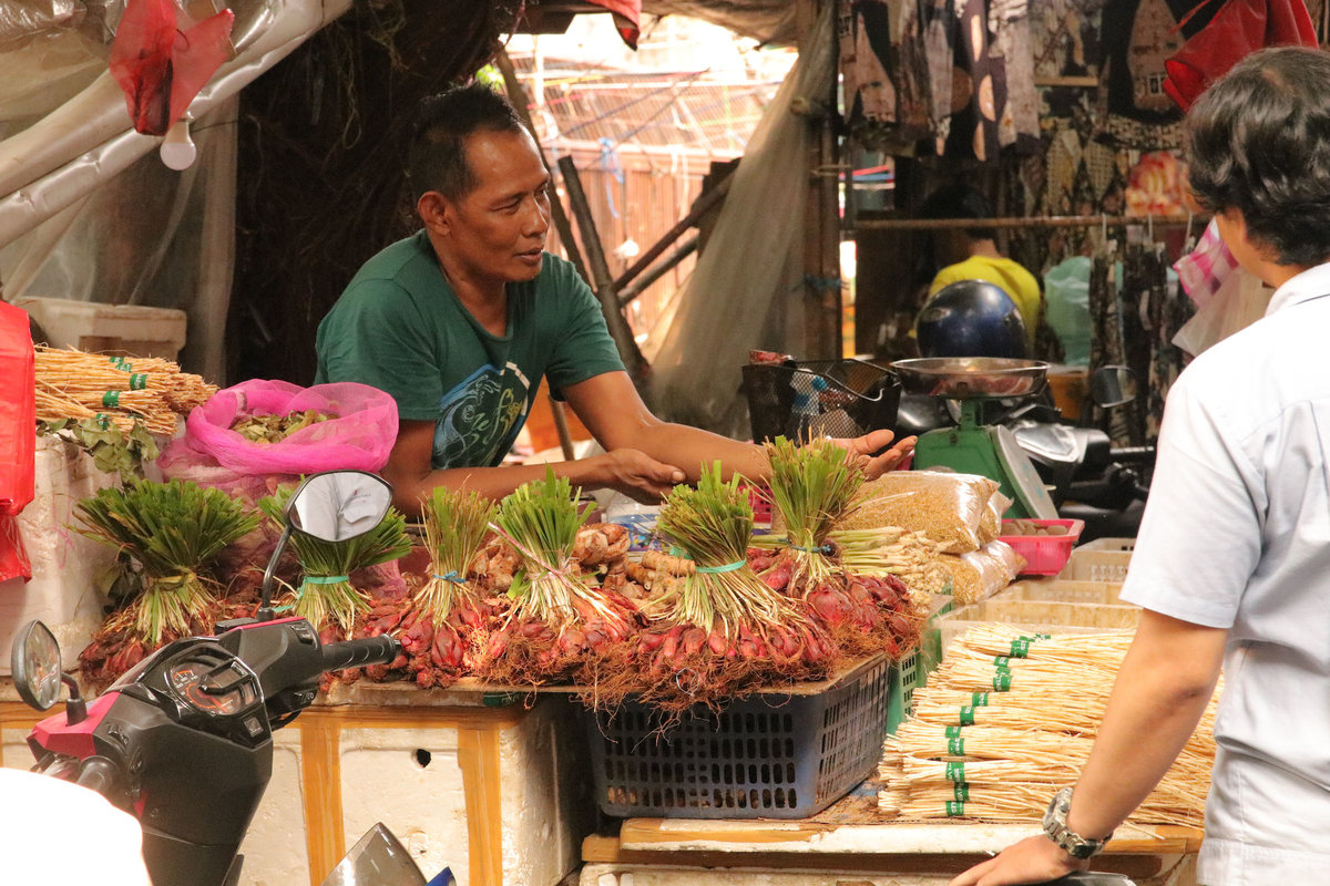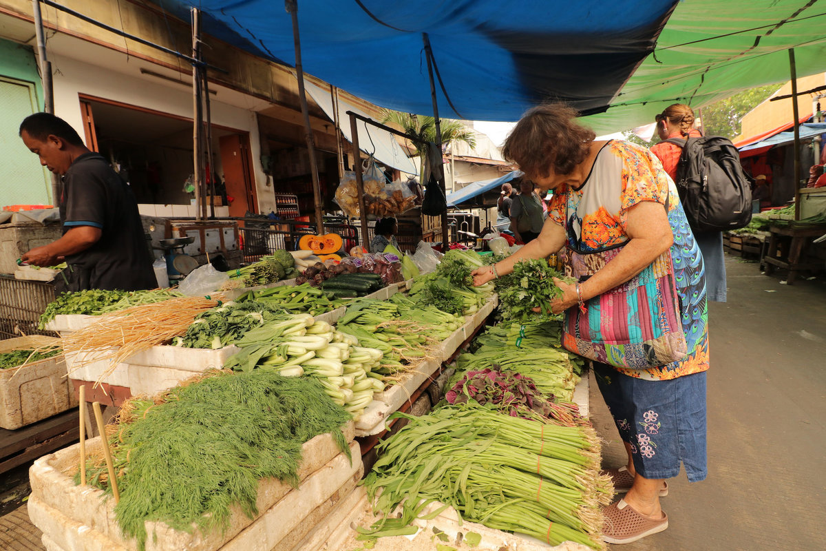 13.7.2018, Jakarta. Der Vorsatz, früher aufzustehen, hat exakt bis zum Weckerklingeln gehalten. Wir sind aber trotzdem noch zu akzeptabler Zeit mit einem Grab-Teksi Richtung Chinatown aufgebrochen. Nur leider hat der Verkehr die veranschlagten 20 Minuten zu etwa dem Doppelten anwachsen lassen. Der Dauerstau auf den größeren Straßen hat unseren Fahrer bewogen, auf die labyrinthischen kleinen Straßen auszuweichen, die so schmal sind, dass sie sich naturgemäß nur in einer Richtung befahren lassen, aber trotzdem in beiden Richtungen befahren werden, was zu ständigem Rangieren, Wenden und Umwegefahren führt. Irgendwann haben wir dann dem Fahrer gesagt, er soll es bleiben lassen, wir würden den Rest zu Fuß gehen, worüber dieser ziemlich erleichtert schien. Das war auch keine schlechte Maßnahme, denn die kleine Gasse zum Chinesischen Buddhistischen Tempel entpuppte sich als interessante Chinatown-Einkaufszone mit einem breiten Angebot an Kröten, Gemüse, Mollusken, Schreibblöcken, Süßigkeiten und Fußmatten. Der Tempel war recht schmucklos und pragmatisch, wurde aber rege von Leuten zum Vollräuchern genutzt. Wieder wurden die Räucherstäbchen, die man zuhause vielleicht mal einzeln anzündet, in fetten Bündeln abgeraucht. Desgleichen wird hier auch mit Kerzen verfahren – sofern man nicht gleich die XXXXXL-Variante verwendet, die ca. 50cm Durchmesser hat. Der Welpe war ob der Feinstaubbelastung not amused.