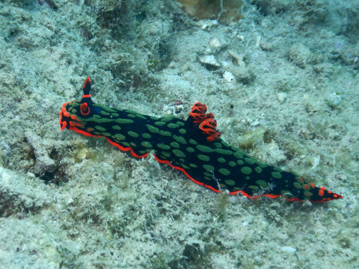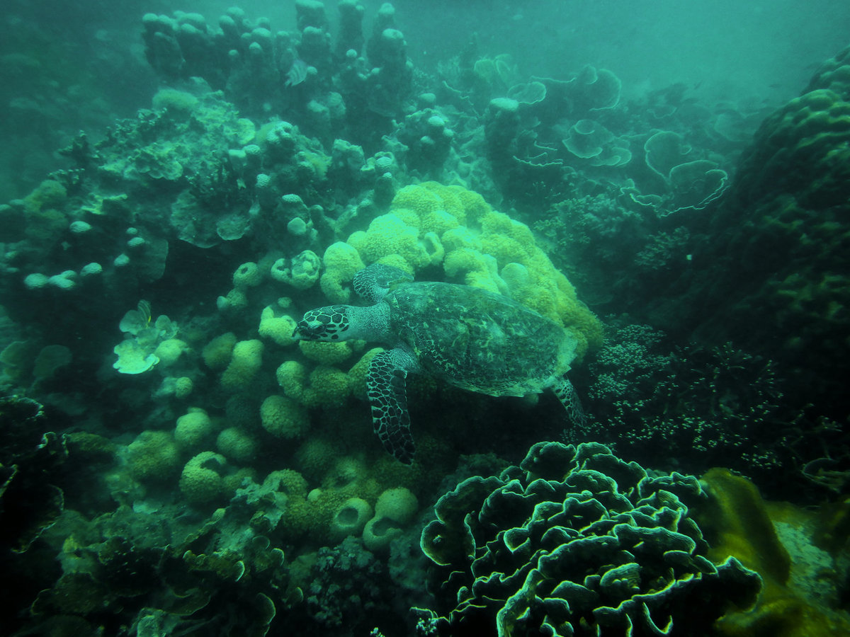 17.7.2018, Pulau Pramuka: Nicht viel zu berichten. Waren zweimal mit Mazu Divers tauchen. Einmal ein kleines Wrack eines Fischerbootes, das in 10m auf dem Kopf lag. Weil die lokalen Fischer da immer gerne Harpunieren, gibt es leider kaum Fische dort, während Wracks normalerweise ideale Verstecke sind. Wir konnten sogar durchtauchen. Die ganze Gegend hat zwar wenig Fische, aber dafür sehr schöne, intakte Korallen und auch einige coole Hippie-Nacktkiemer, mein Highlight heute. Sogar knapp vor der Echten Karettschildkröte (sorry). Sicht war dafür so lala.