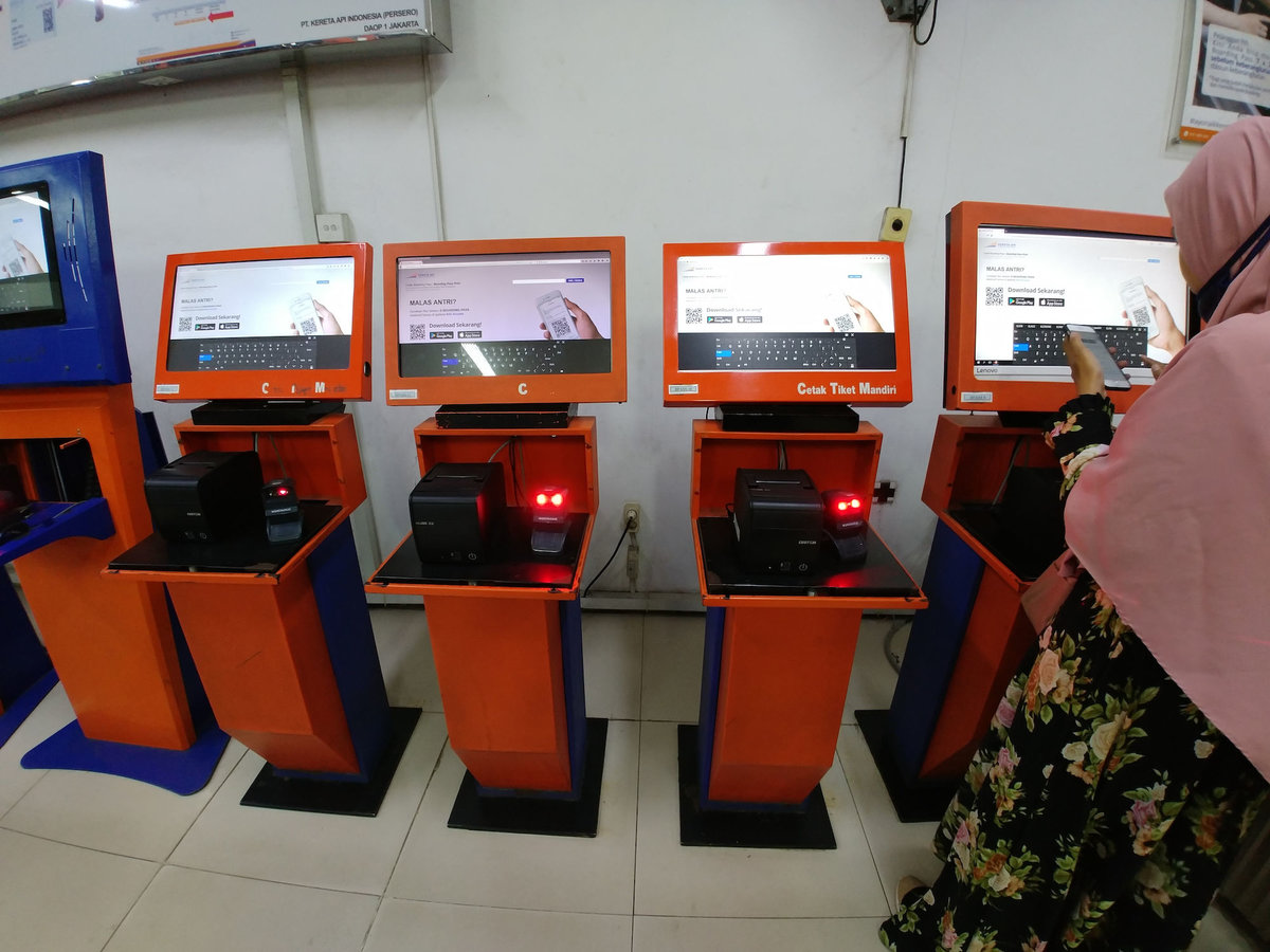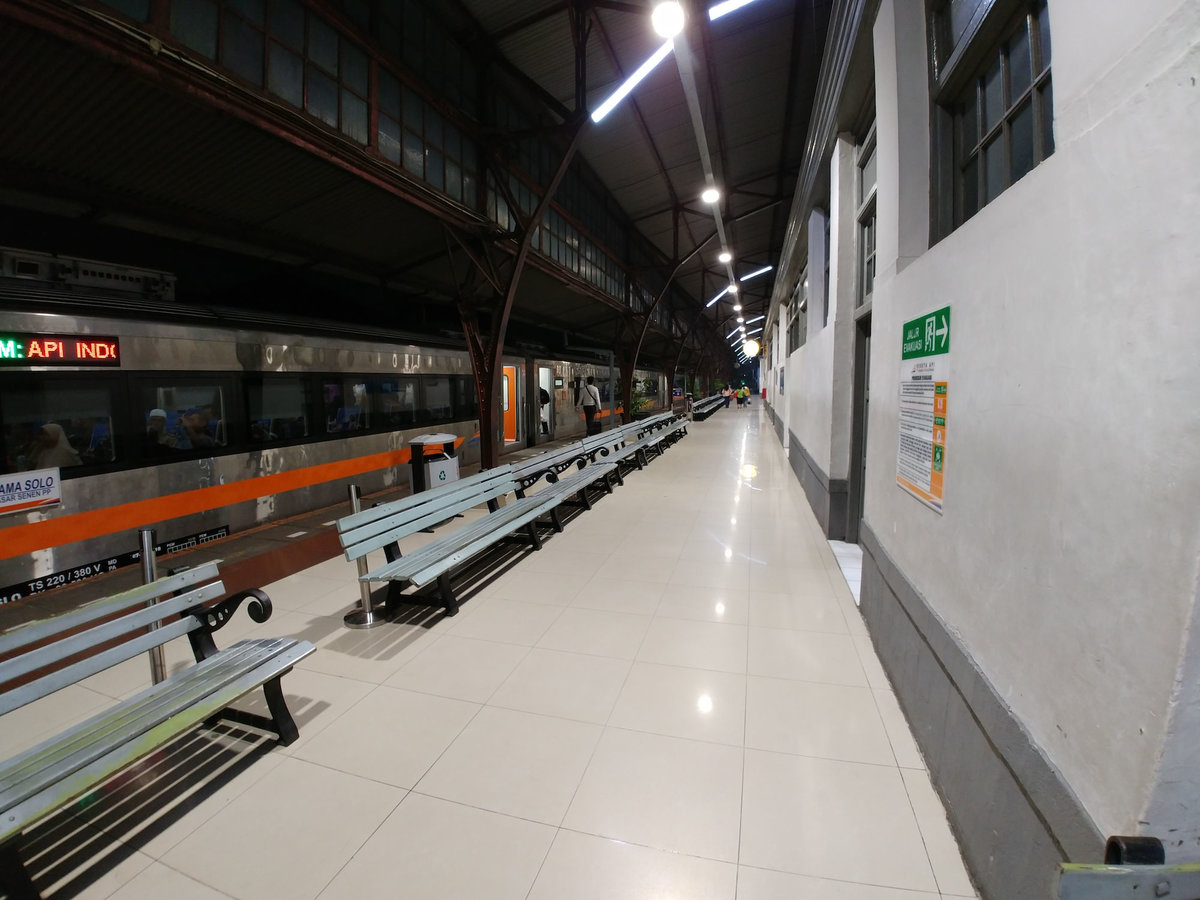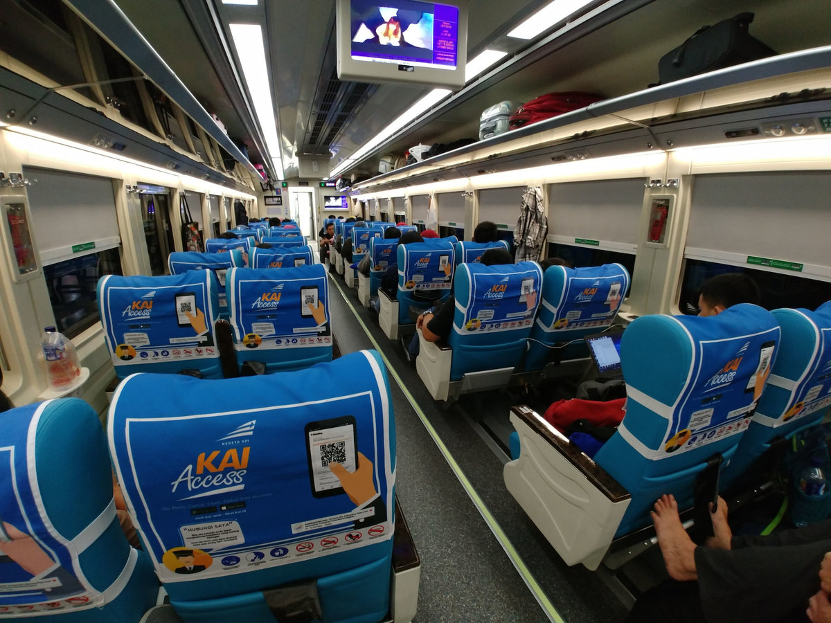 In einem anderen Laden ohne funktionierende Klimaanlage haben wir Mie Baso Ayam gefuttert und sind zum Zug. Das Ticket hatten wir online mit der App Traveloka gekauft (sogar mit Platzwahl). Man bekommt wie beim Flugticket einen Reservierungscode/Barcode. Mit dem geht man zum Checkin-Terminal, scannt den Barcode vom Telefon und druckt seine Fahrkarten/Boarding Passes. Vor dem Bahnhofseingang kontrollieren Soldaten zweimal Ticket und Reisepass und dann erst darf man in den Bahnhof und zwar nur direkt zum richtigen Bahnsteig.