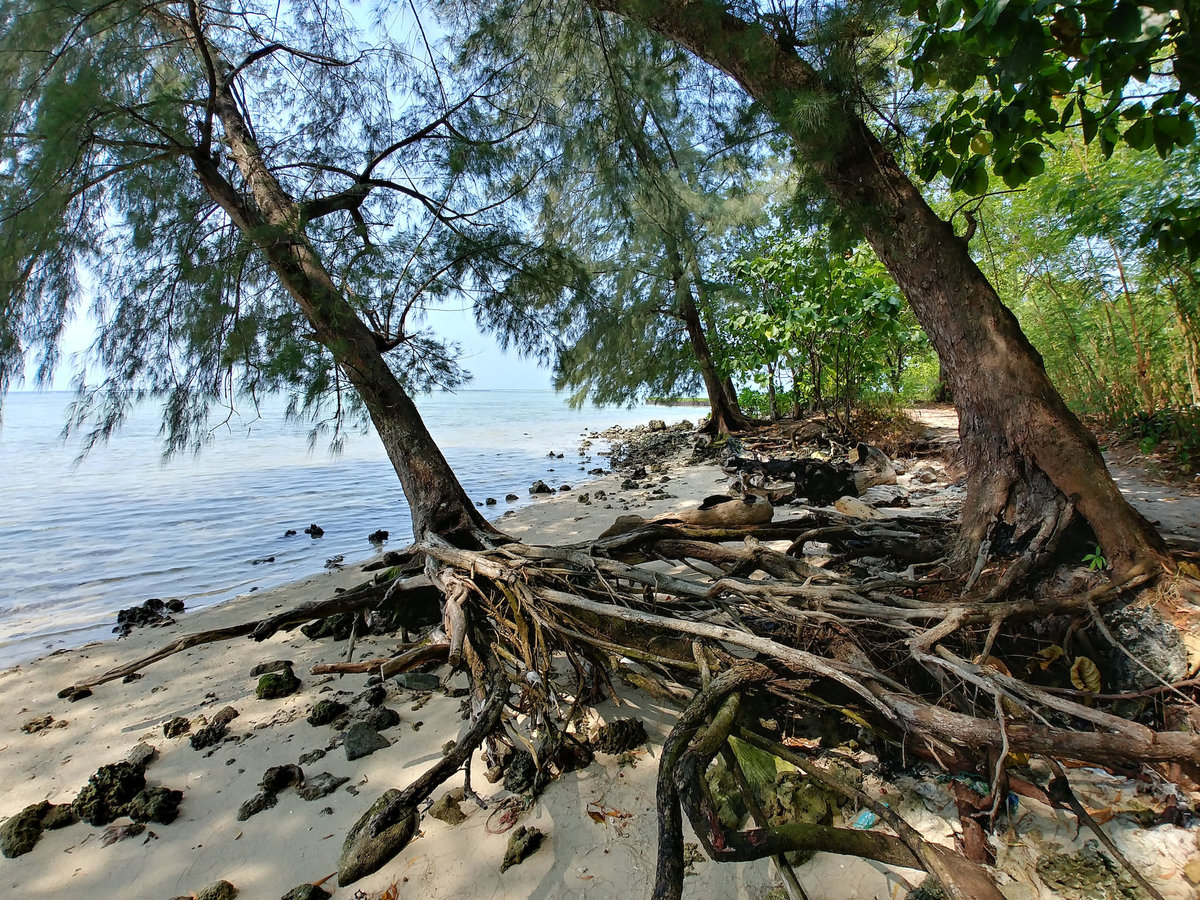 Im Wasser zwischen den Mangroven sahen wir aber wenigstens noch zwei große Warane vor uns flüchten. Einen kleinen Wald gab es auch noch, aber dann waren wir schon wieder rum, das ist doch wirklich eine sehr kleine Insel.