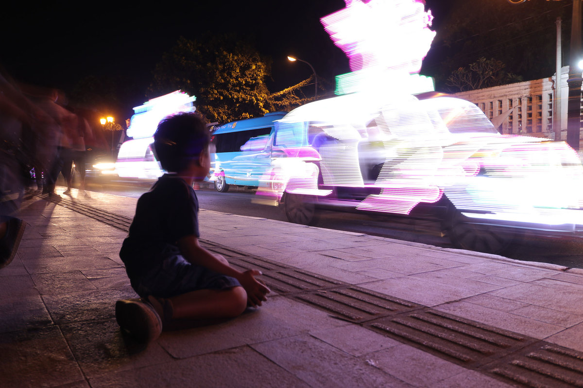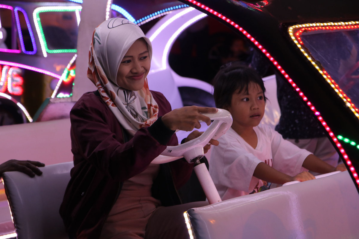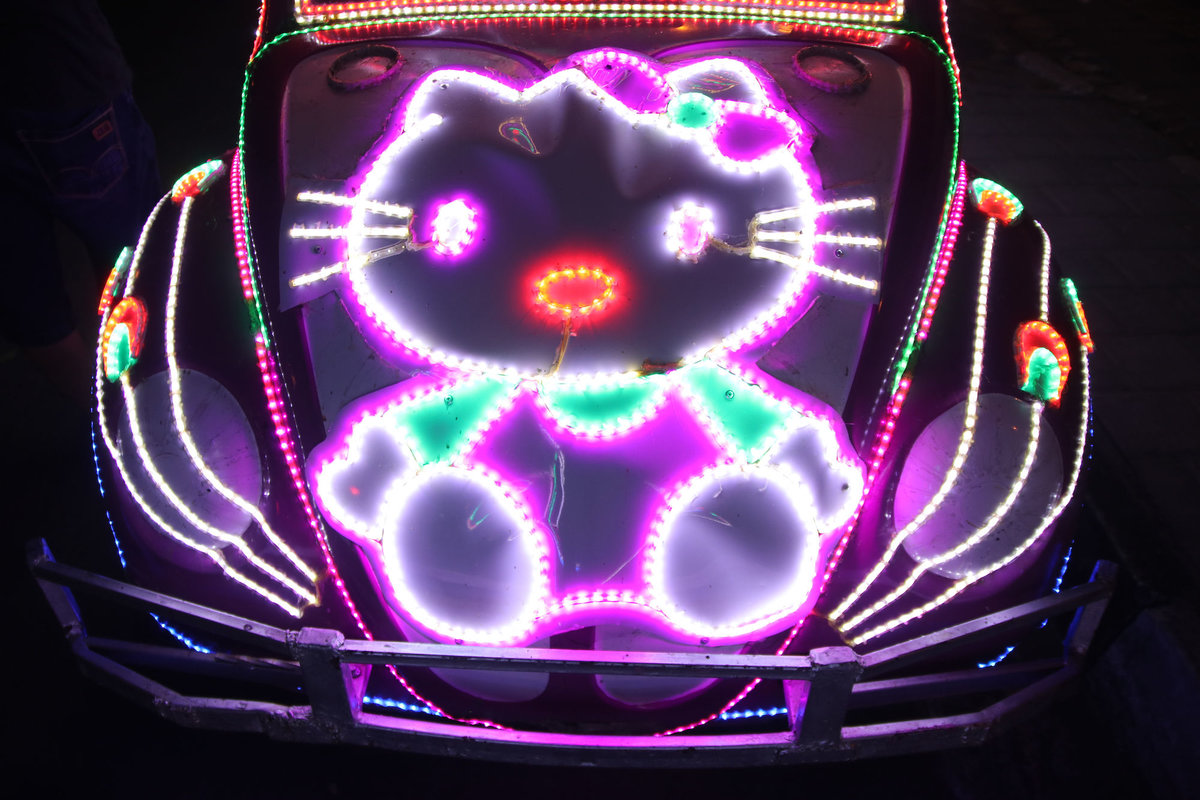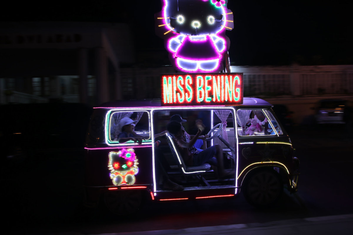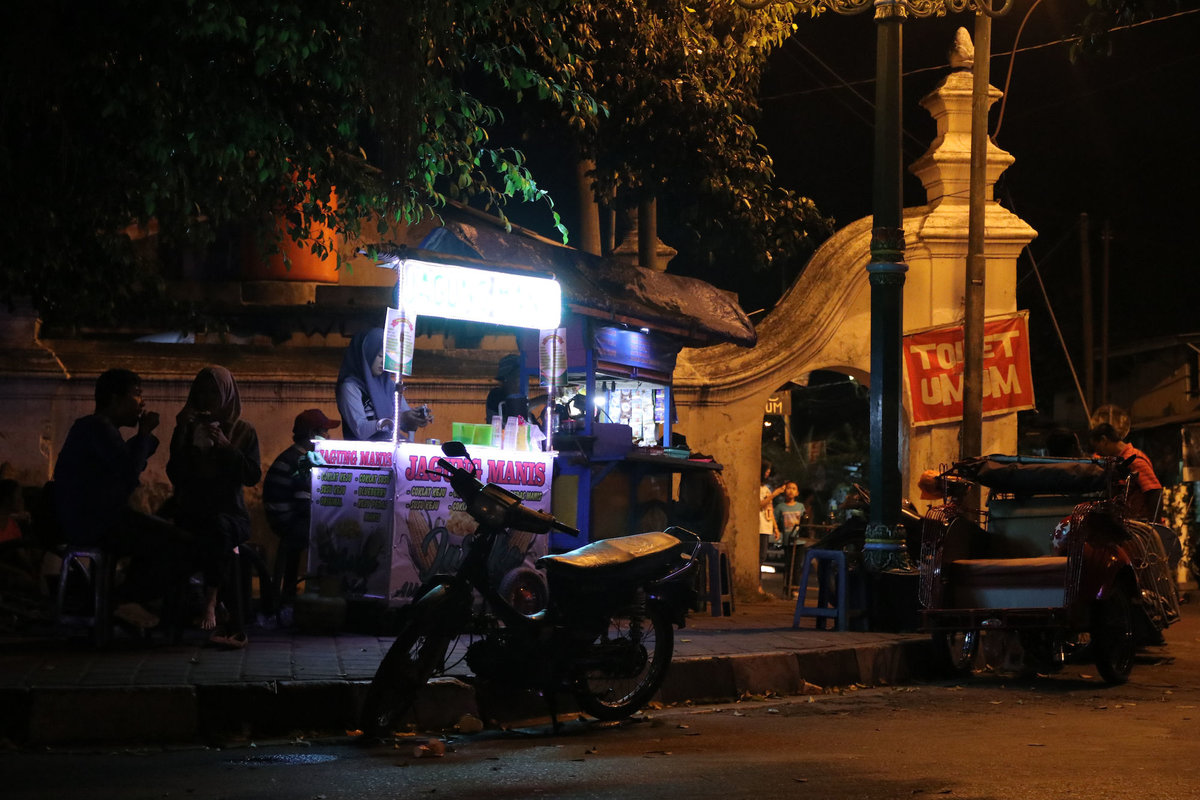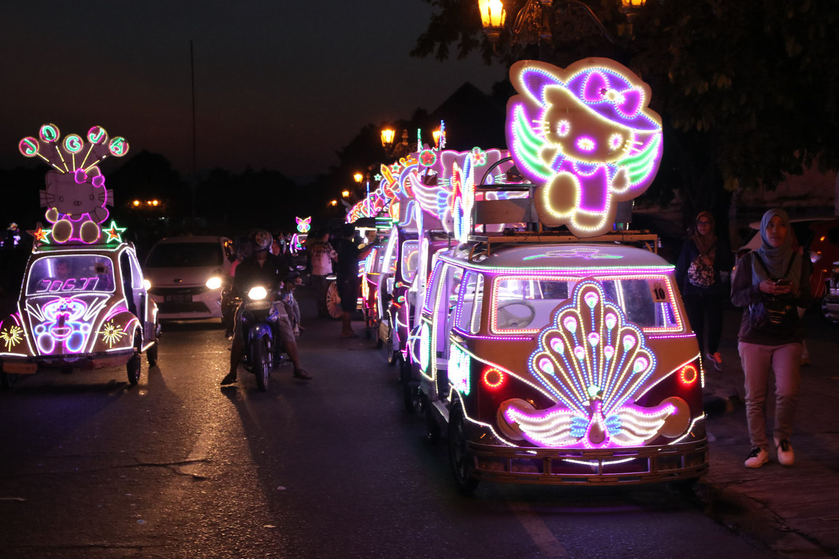 Als dann wirklich die Sonne unterging, sind wir noch zum Alun Alun Kidul, einem Platz mit einer braun vertrockneten Wiese, die gegen Abend offenbar zu DEM Treffpunkt wird. Man kann sich dort viersitzigen Fahrräder leihen, mit denen man dann auf der Ringstraße zwischen den Autos den Platz runden kann. Nur sind die Fahrräder als Autos getarnt, welche wiederum extremst mit LEDs geschmückt sind. Drinnen ist jedes Rad mit einem Soundsystem ausgestattet, so dass also lauter kleine leuchtende Familiendiskos um den Platz schleichen.