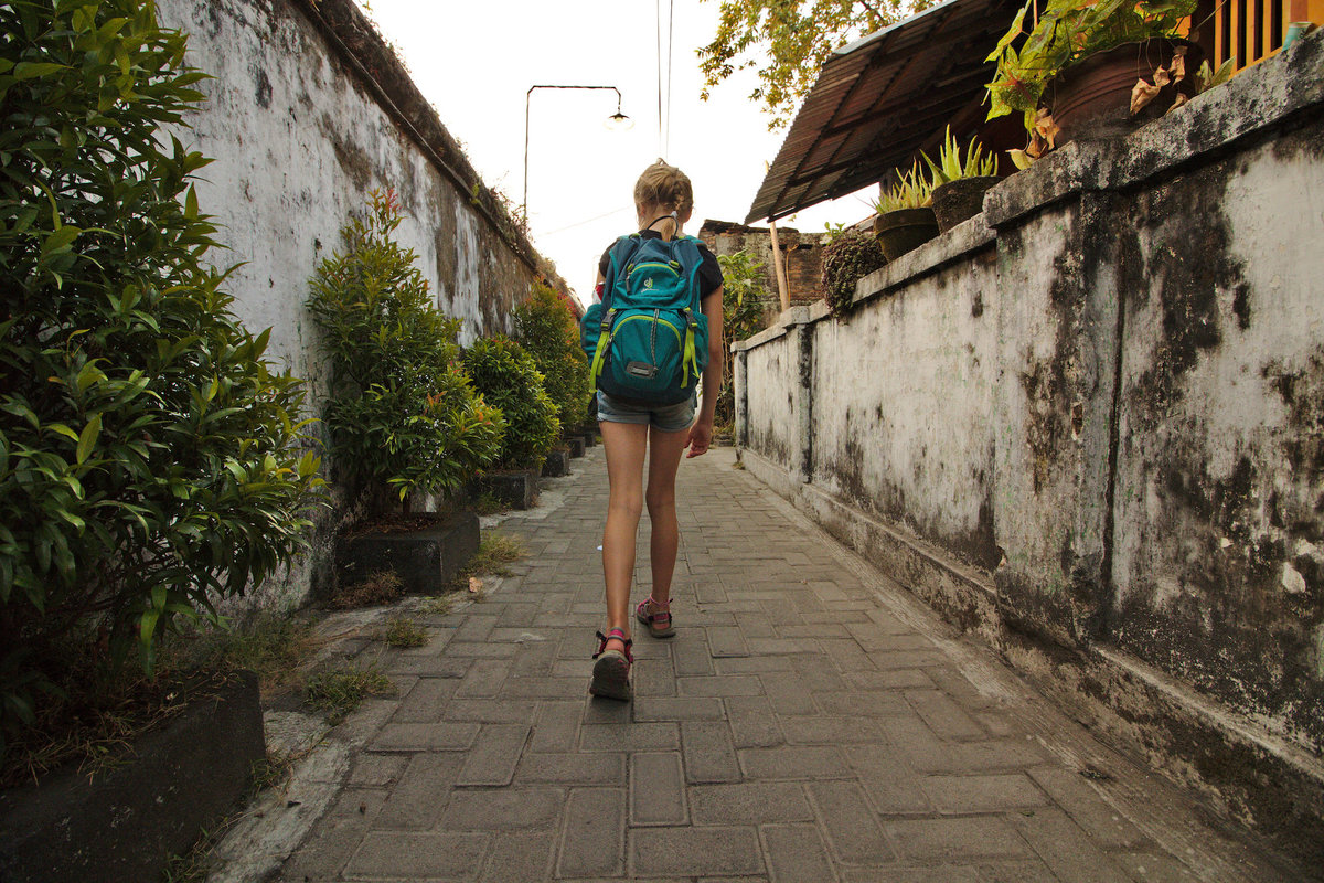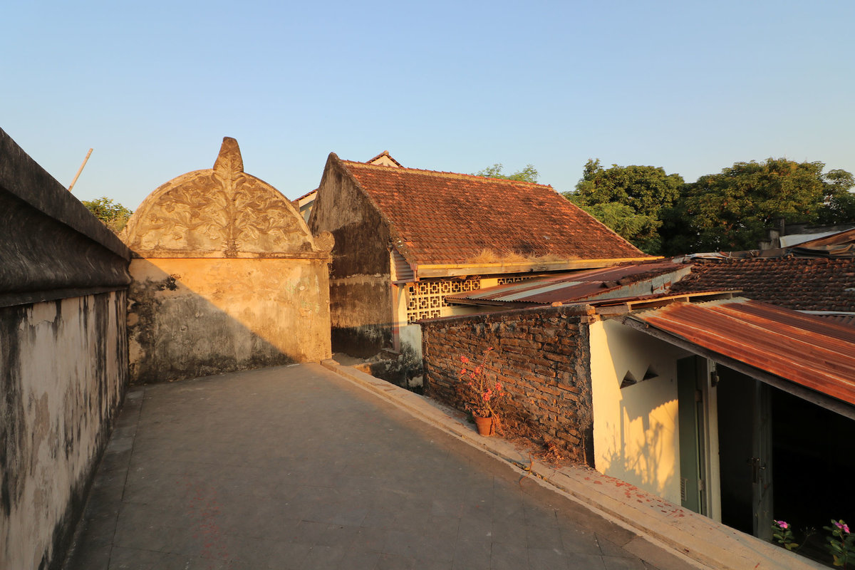 22.07.2018, Yogyakarta: Da 2/3 der Reisenden heute morgen ein wenig Unwohlsein verspürten (was sich im Laufe des Tages dann wieder gegeben hat), begann das Programm außerhalb des Guesthouses erst am Nachmittag. Wir ließen uns mit einem der altebewährten Grabtaxis in eine etwas touristischere Ecke bringen, weil wir dort unsere Mägen mit Crêpes erfreuen wollten. Jedoch war der von uns vorab ausgesuchte Laden nicht auffindbar, daher nahmen wir mit einem italienischen Café vorlieb, tranken Tee, Soda und Vietnamesischen Eiscaffee und der Welpe vertilgte noch den größten Teil einer Pizza.
