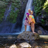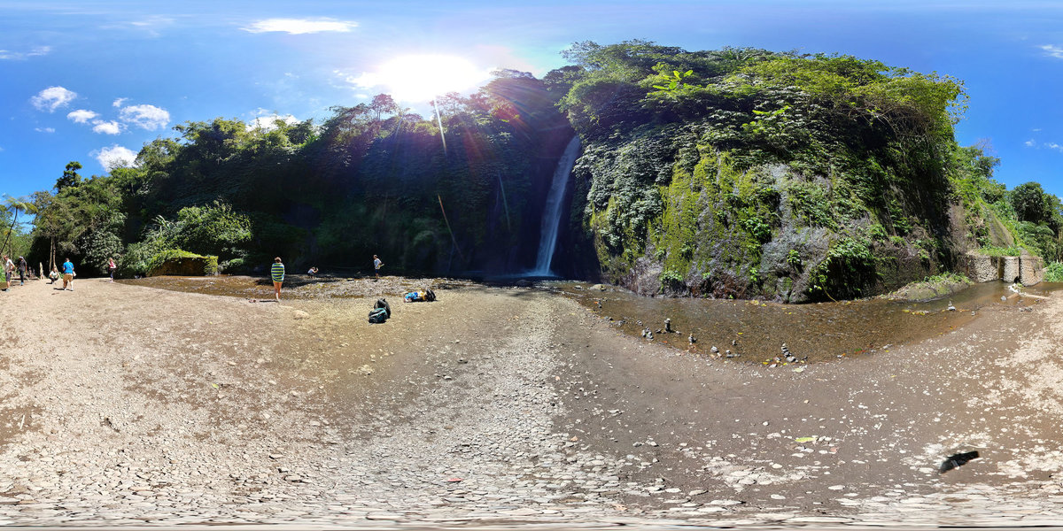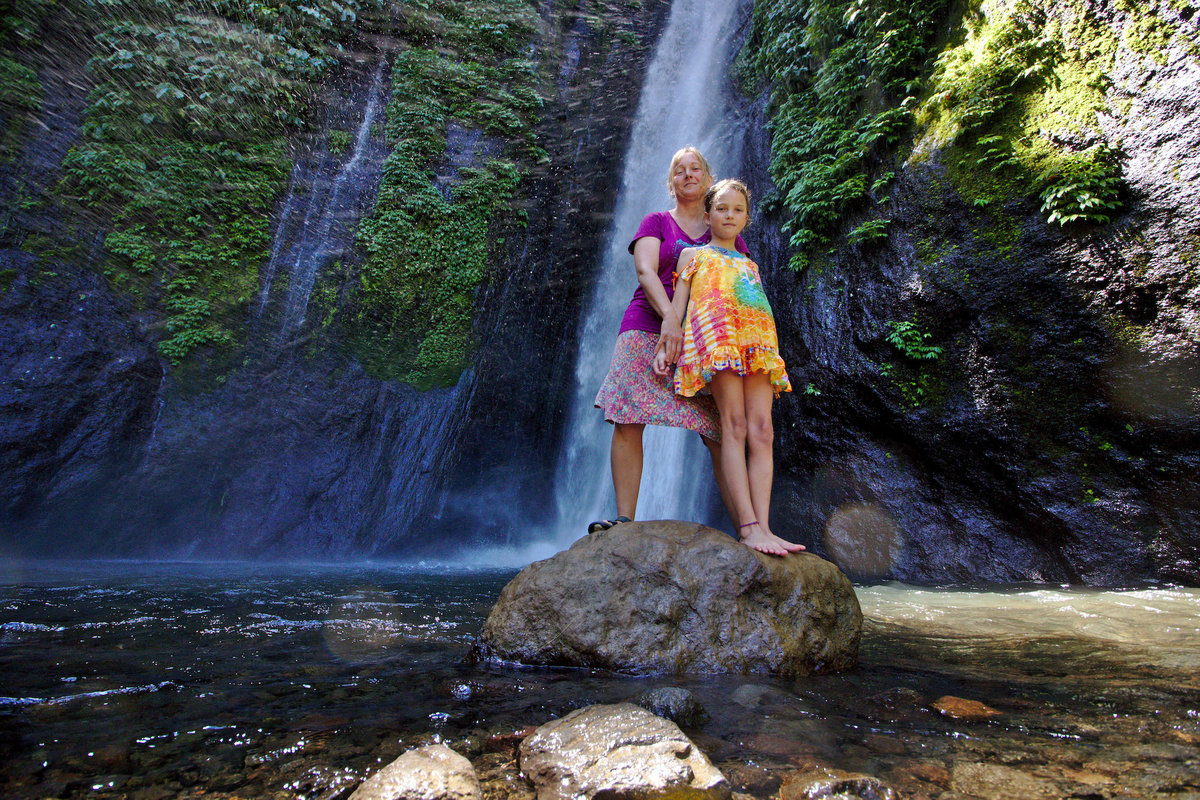 Unser Fahrer wollte uns nicht einfach nur stur nach Ubud bringen, sondern uns auch noch ein paar Highlights zeigen, u.a. den ca. 40m hohen Wasserfall in der Nähe von Munduk, zu dem man nach einem kleinen 500m Fußmarsch durch einen extrem grünen Hang gelangt. Man kann dann vor ihm stehen und sich vom Spray binnen Sekunden komplett durchnässen lassen, was der Welpe auch getan hat. Leider hat er dann den Rückweg ziemlich gefroren, aber die Sonne hat ihn wieder getrocknet. Im Bambus-Enjoy-Café auf halbem Weg haben wir dann lange auf (leckeres) Mittagessen gewartet und die Umgebung genossen.