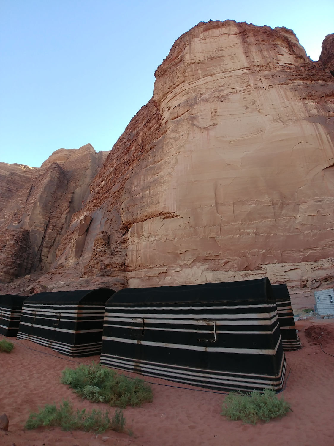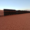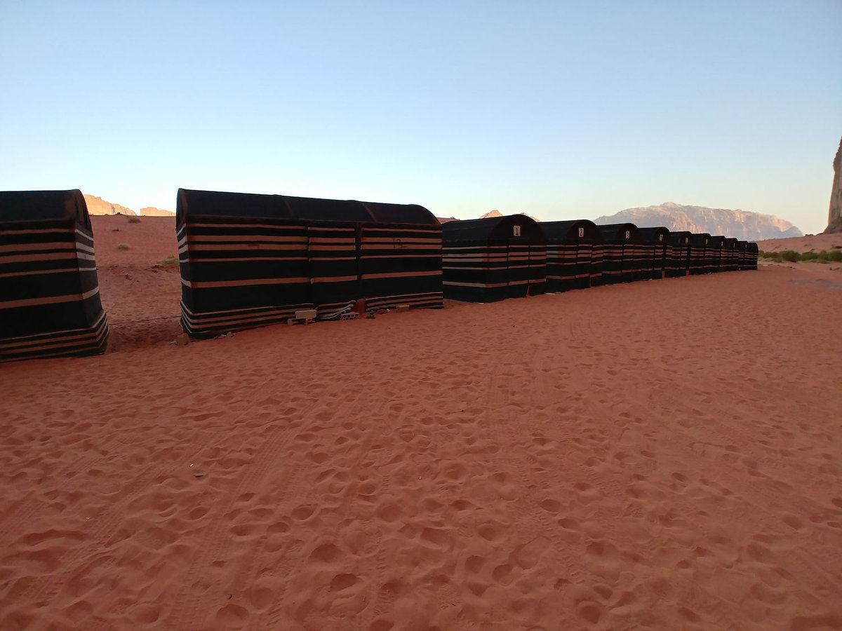 15.10.2018, Wadi Rum: In der kühlen Luft von Wadi Rum (unser Camp liegt im Schatten eines Berges), bestiegen wir wieder unsere erprobten Kamele und es ging zwei Stunden lang zurück zum Dorf Wadi Rum, das etwa 8 Kilometer weiter nördlich liegt. Auf der waagerechten, merkmalslosen Wüstenebene zwischen den riesigen Bergen versagt der Sinn für Entfernungen komplett. Wir hatten also den Eindruck, mit Schneckentempo durch die Landschaft zu schwanken. Eine frei umhertrabende Kamelherde am Fuße des Berges vor uns sah auf den ersten Blick wie eine Rattenherde aus. Laster und Jeeps wirken wie Matchboxautos.