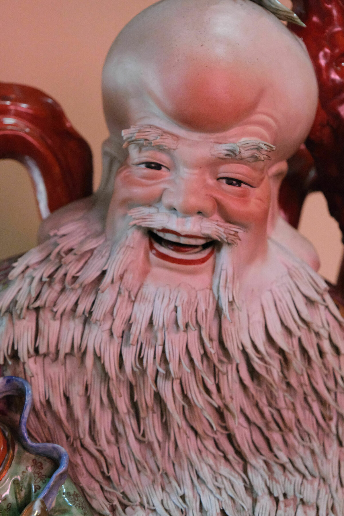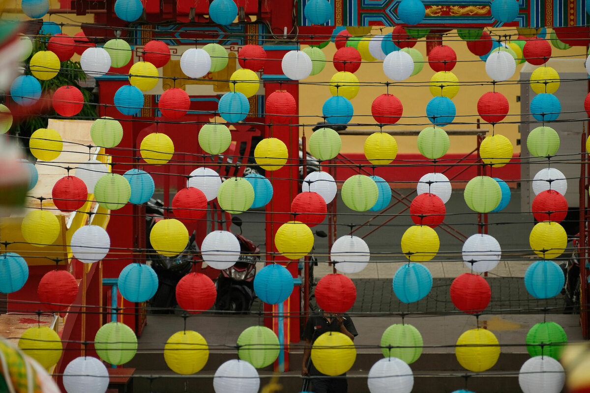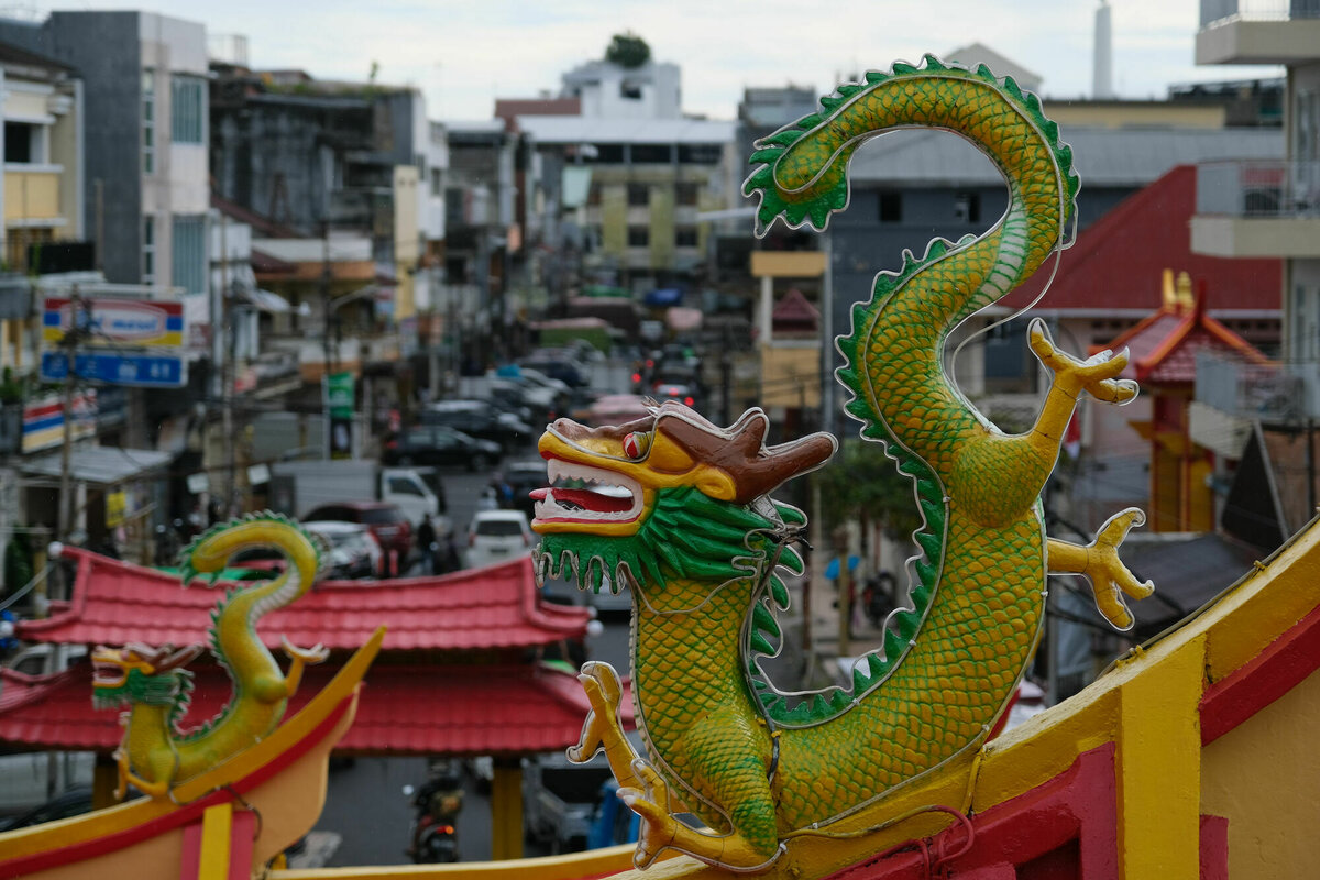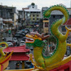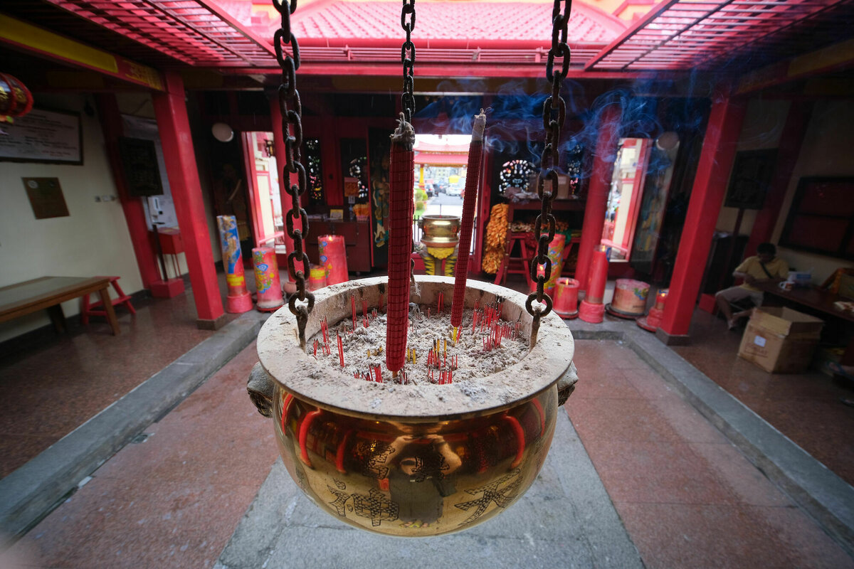 14.7.2022, Manado, Salawesi: Der mittlere Hund hat sich, wie eigentlich immer im Urlaub eine leichte Erkältung zugezogen (ja, nur eine Erkältung, keine Hinweise auf was schlimmeres) und so haben wir für heute kein größeres Programm geplant. Der Welpe und ich sind gegen Nachmittag nochmal zu zwei chinesischen Tempeln gefahren, die für chinesische Tempelverhältnisse fast etwas schlicht waren, aber natürlich immer noch voller extravaganter Porzellanfiguren, gigantischen roten Kerzen und Räucherstäbchenduft. Im Gegensatz zu den sehr hübschen chinesischen Tempeln in Georgetown, kann man hier aber noch jeweils zwei Stockwerke hochgehen, um jeweils einen weiteren Schrein zu bewundern und auf den Vorplatz zu gucken.
