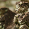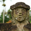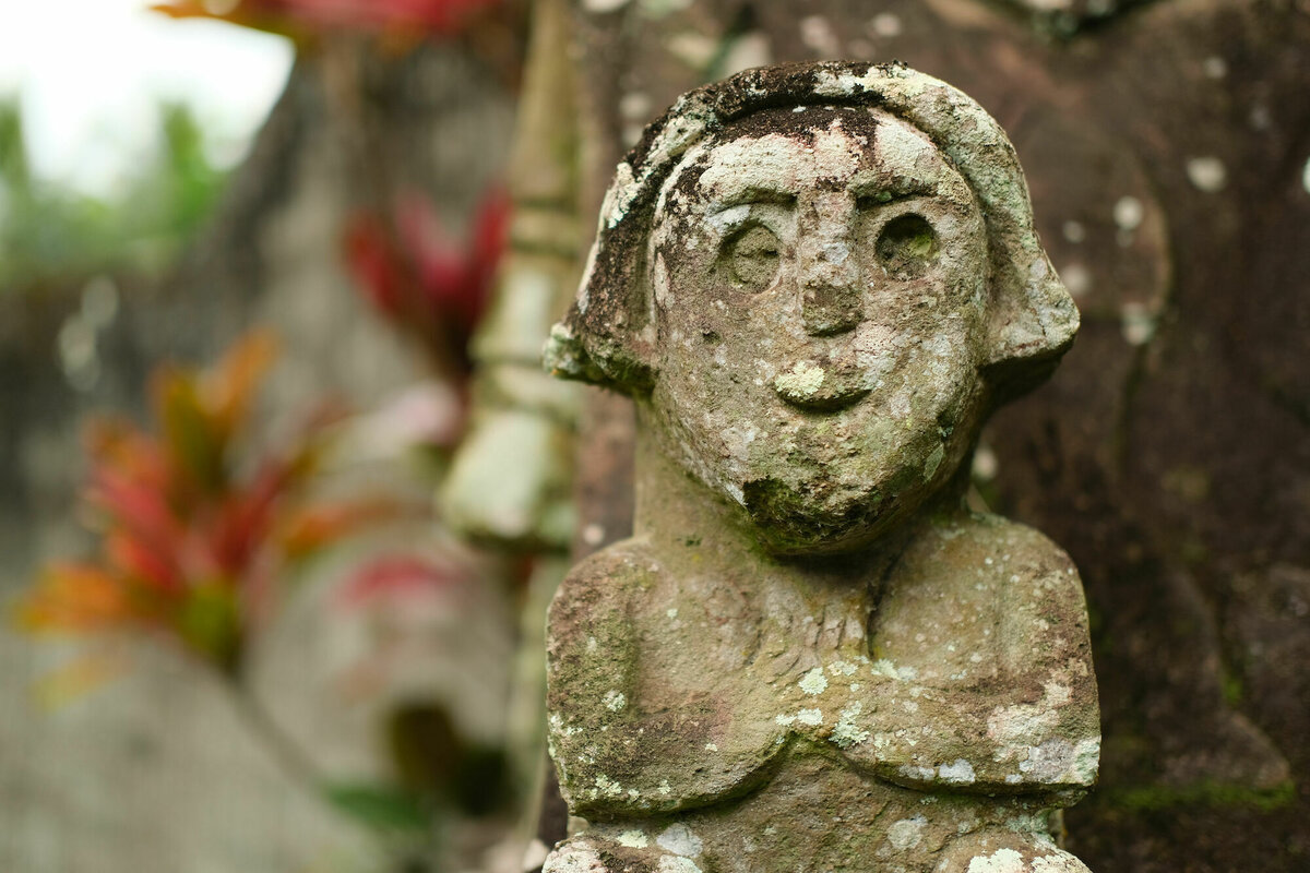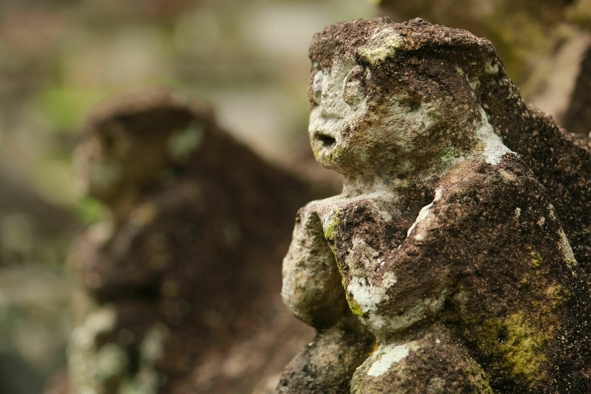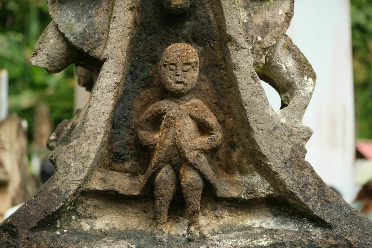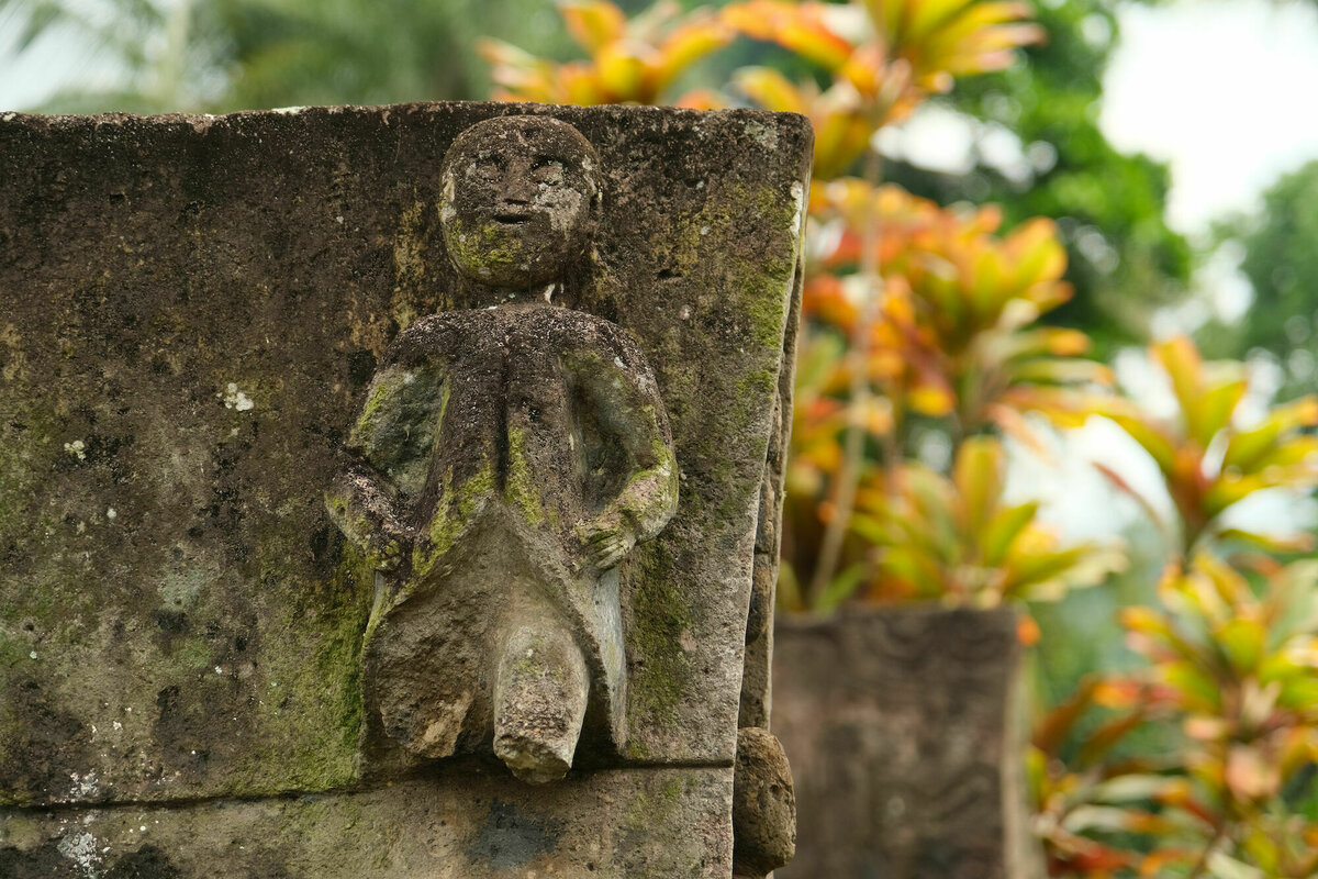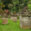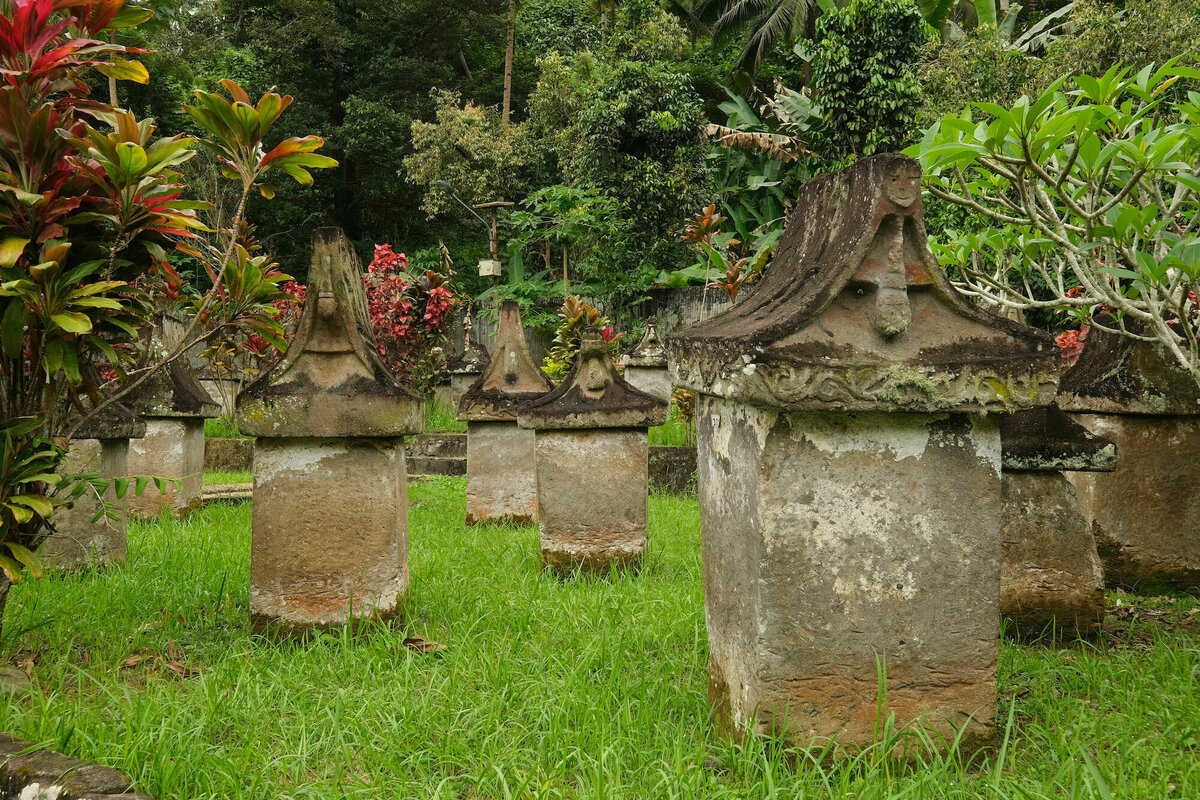 10 Minuten später waren alle aber schon wieder verschwunden und wir waren tatsächlich alleine hier mit den Warugas. Die Warugas sind Gräber und Grabstein in einem: Die Toten wurden in fötaler Haltung in einen ausgehöhlten quadratischen Steinbehälter gesetzt und mit einem dachförmigen Deckel verschlossen, der mit Hinweisen auf den Job des oder der Toten geschmückt ist. Das wurde von den hier lebenden Minhasa seit der Steinzeit gemacht, bis die Holländer meinten, das sei doch unhygienisch und es verboten haben. Hier stehen auf einem kleinen Teil des Friedhofs etwa 140 Warugas.