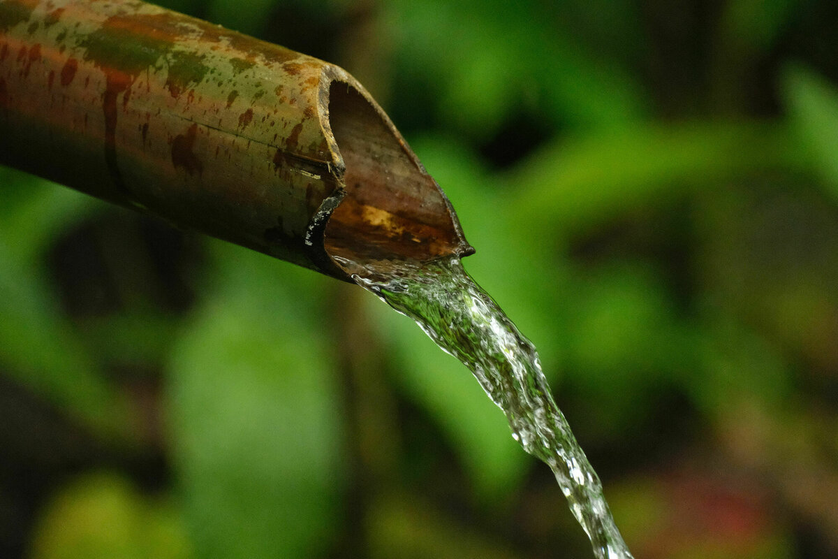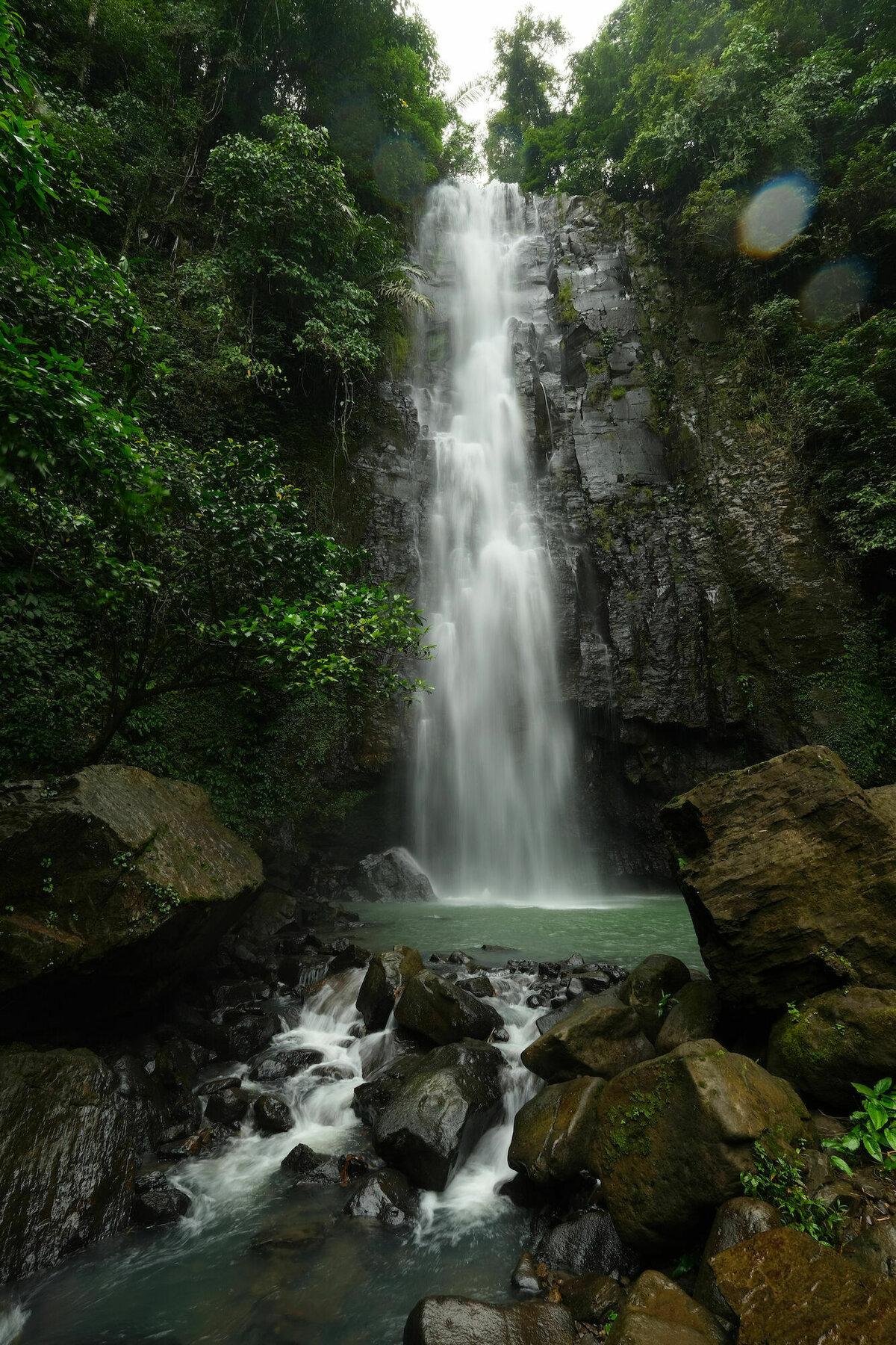 Zum Wasserfall geht man ein etwa 300 Meter auf einem betonierten Weg durch den leicht tropfenden Dschungel und freut sich, dass der Weg betoniert ist, weil man sonst nur durch Matsch laufen müsste. Am Ende des Wegs und des Tals findet sich tatsächlich ein sehr schöner Wasserfall, den wir wieder komplett für uns alleine hatten. Die Schülergruppe war wohl schon wieder durch. Fast schade …