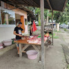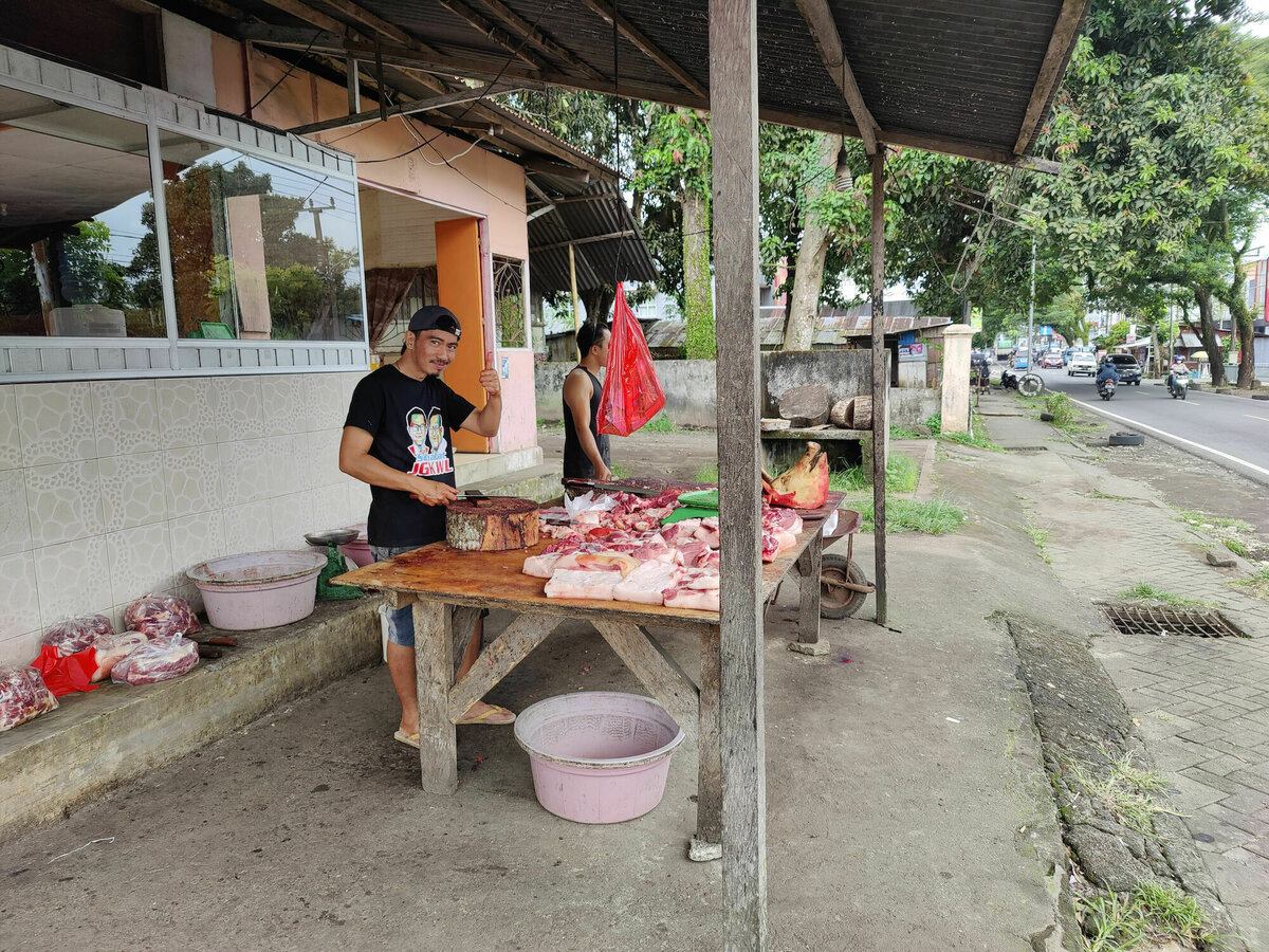 Im Anschluss wollten wir was essen und holten uns von der Frau, die den Friedhof verwaltet und auch ein wenig Auskunft gibt, wo es denn gutes lokales Essen gibt. Sie beschrieb unserem Fahrer einen Ort, wo vorne auf der Straße gerade ein Schwein auf einem Tisch zerlegt wurde. Hinten gab es, wie in vielen indonesischen Garküchen, viele Schalen mit vielen unterschiedlichen frischen Curries, meist mit Schwein, aber auch Huhn, Schlange oder einfach unterschiedlichen Gemüsen.