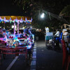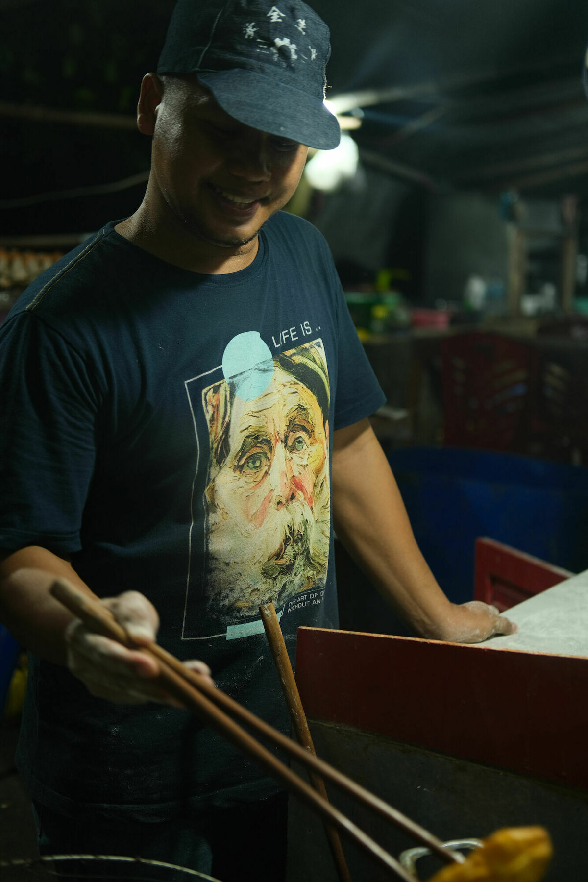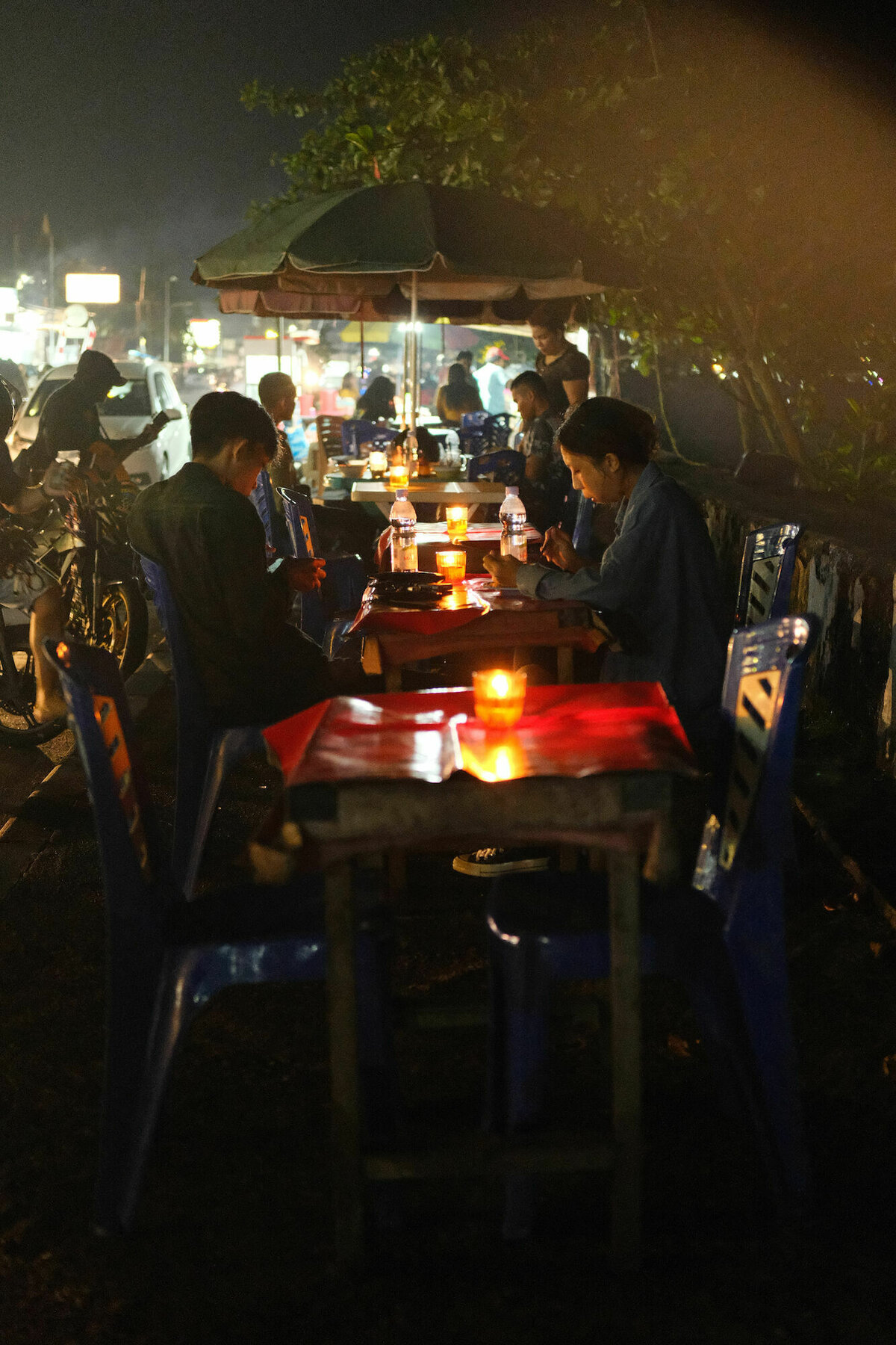 Viele der Stände bieten Maiskolben oder gegrillte Kochbananen an, wir haben aber spontan Cakwe gegessen, frittierte Teigstreifen, die an Churros erinnern. Der mittlere Hund hatte welche mit Schokoladensauce und Käse, ich hatte welche mit Hühnerwurstfüllung, scharfem Ketchup und Majo. Seltsam, aber vollkommen OK als Abendessen, dazu sehr billig. Und wir wurden wenigstens nicht geräuchert.