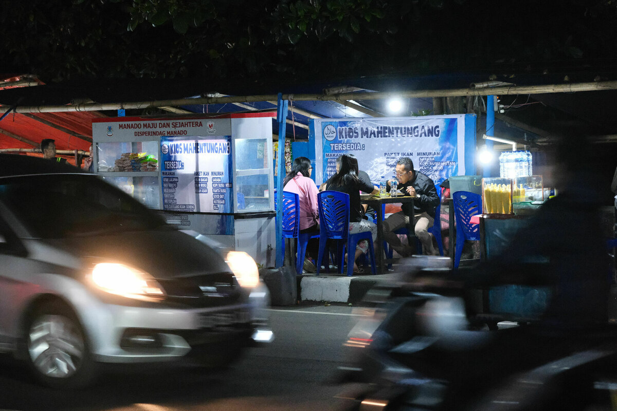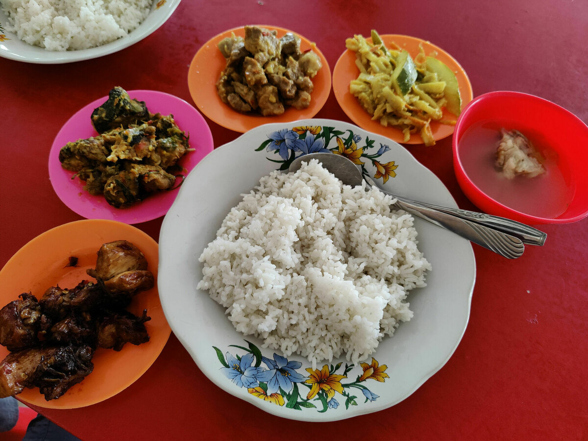 Wir haben uns ein paar kleine Schalen mit Schwein, Huhn, Schlange und einem sehr fruchtig schmeckenden Bambuscurry ausgesucht, dazu gab es – natürlich – Nasi Putih, weißen Reis, etwas Brühe mit einem Klumpen Fleisch drin und Tee, alles für 45000 – für drei, also etwa ein Euro pro Person. Die Curries waren alle wirklich sehr lecker, leicht scharf, aber absolut gut essbar. Nur die kleinen Schlangenstücke hatten leider nur wenig Fleisch, der Rest war Haut und Knochen (mit dünnen Rippen, fast wie die Gräten beim Fisch.