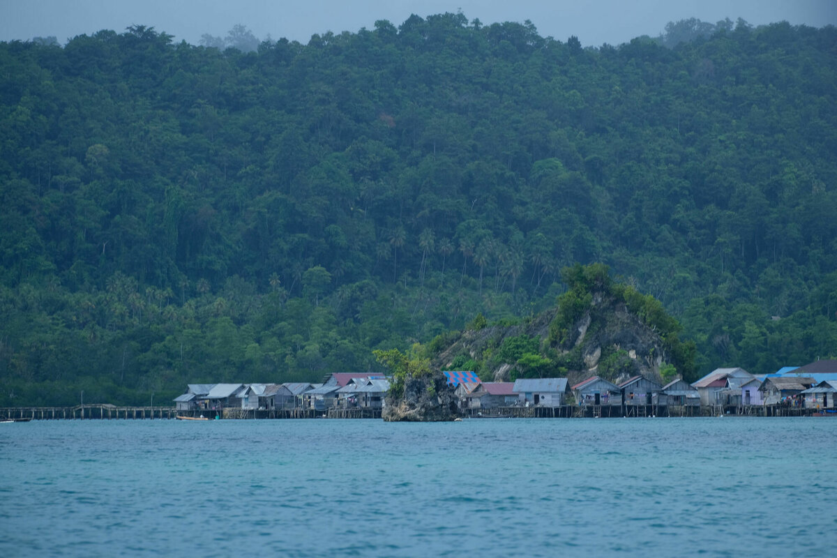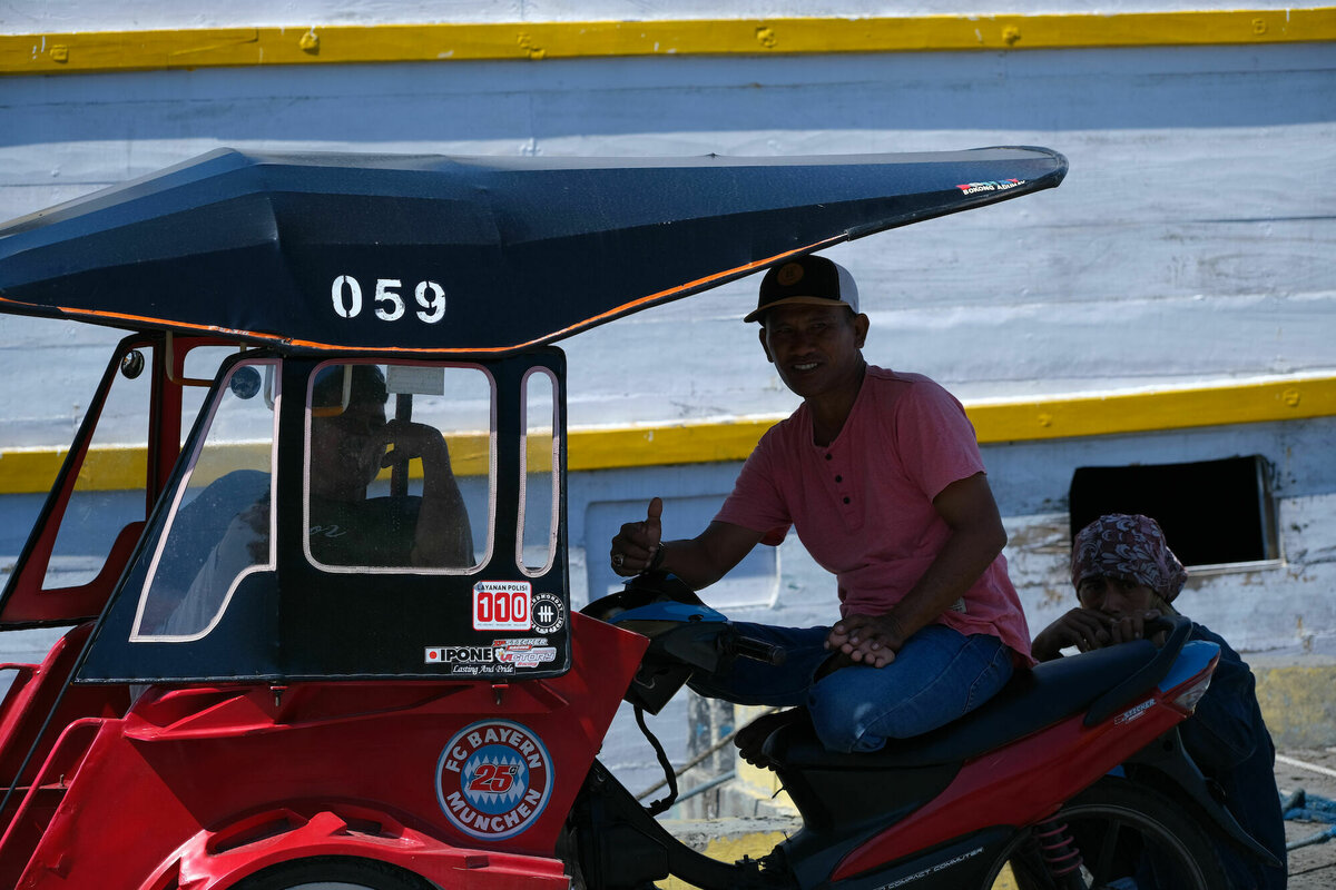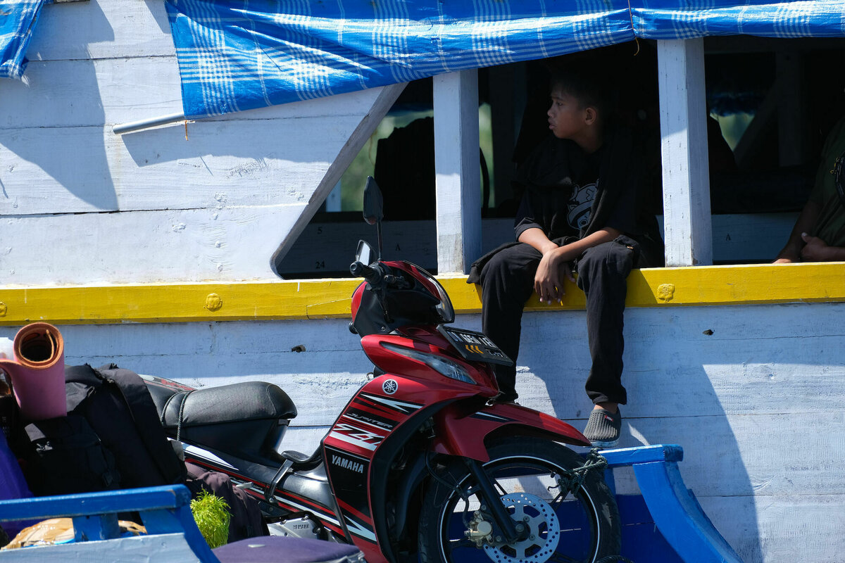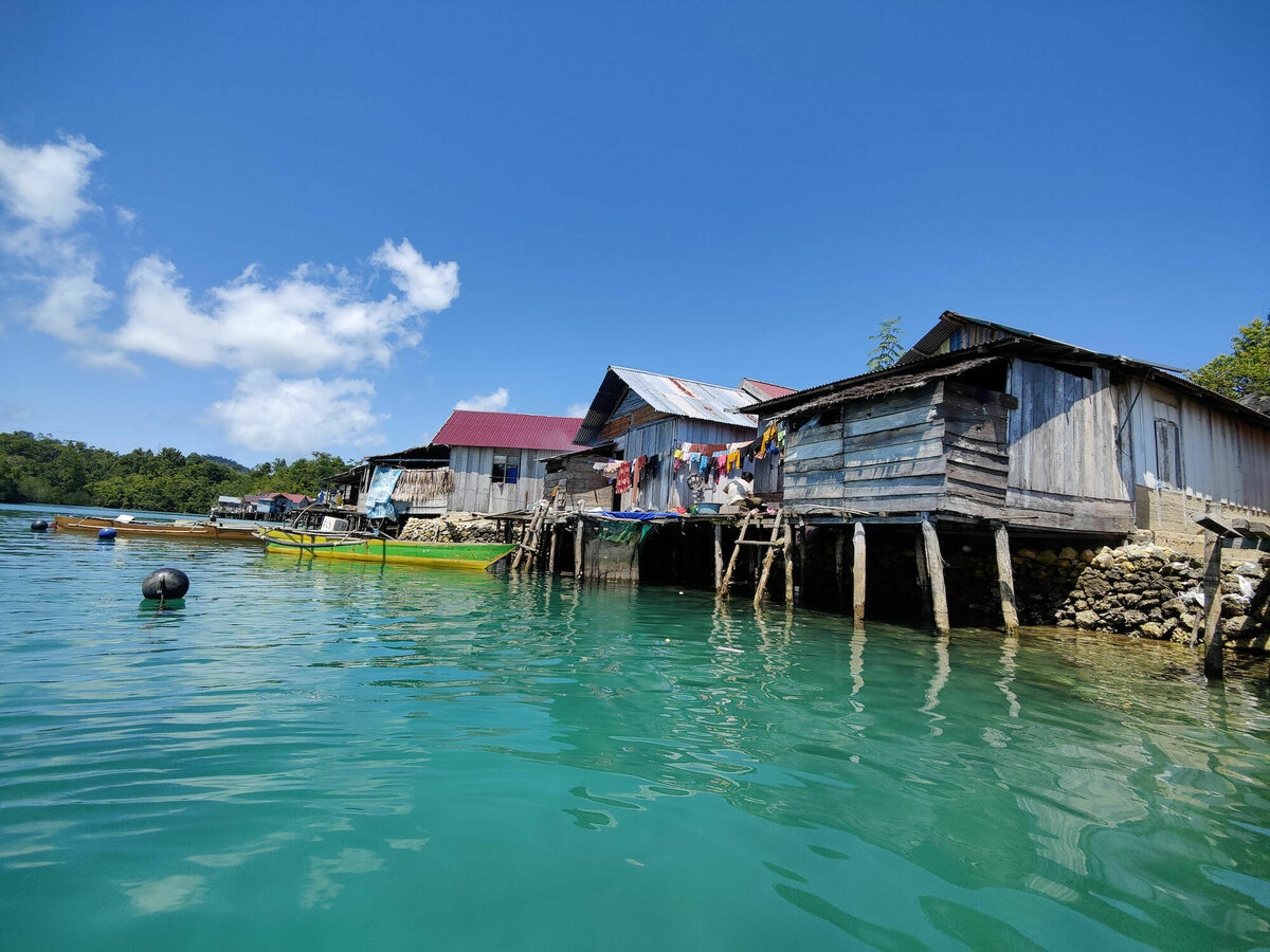 So, 24.7.2022, Ampana, Sulawesi: So gegen 8:40 wurden wir von Atnan mit seinem Moped und einem dieser eigentümlichen Moped-Rikschas, bei denen zwei Leute auf einer überdachten Bank vor dem Fahrer sitzen können, abgeholt. Unser Gepäck und 2/3 von uns wurden auf die Rikscha geschnallt und ich wurde auf Atnans Soziussitz gesetzt, um zum nahen Hafen von Ampana zu fahren. Dort warteten wir in einem weißen, schucklosen, eher kargen und heruntergekommenen Gebäude darauf, auf die Fähre zu kommen. Die freundlichen Mitarbeiter der Fährgesellschaft kassierten für unsere Tickets und Eintritt zum Nationalpark. Nach fast einer Stunde ging es zum Speedboot am Anleger, eine viel zu kleine, übermotorisierte, schwankende Röhre, in die viel zu viele Leute und viel zu viel Gepäck reingequetscht wurden. Die laute und mit 30 Knoten viel zu schnelle Fahrt zu dem Togean-Archipel mit seinen vielen kleinen schicken Inseln konnten wir nur mit Verrenkungen und durch kleine Fenster im Fiberglasrumpf sehen. Man konnte zumindest Stelzendörfer erahnen, die prima als Filmkulisse dienen könnten.