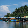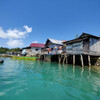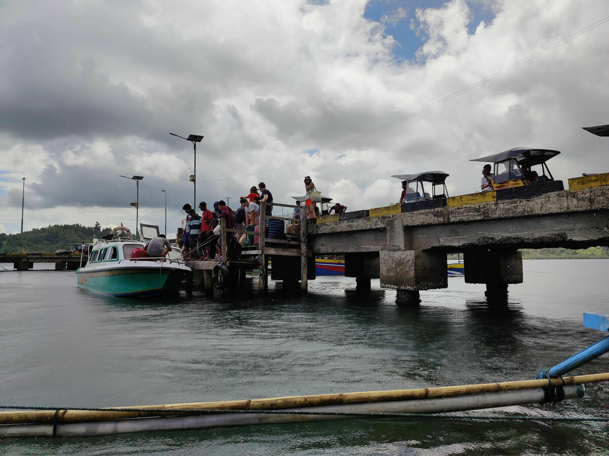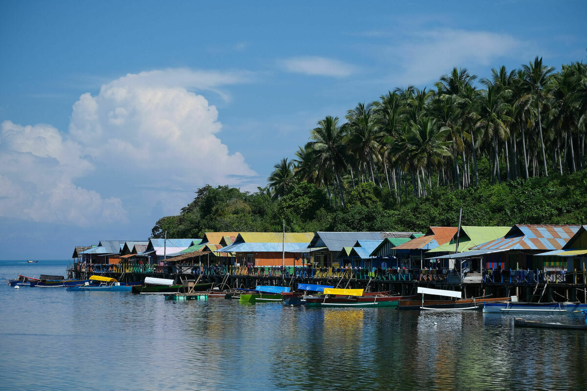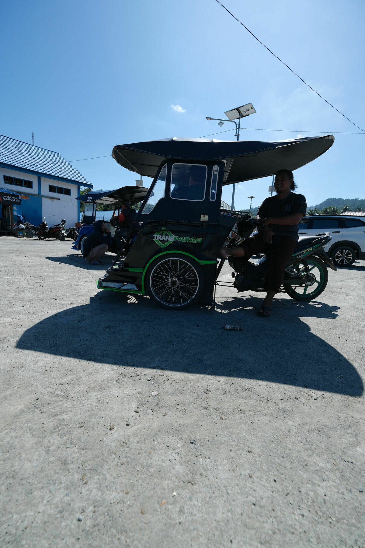 So, 24.7.2022, Ampana, Sulawesi: So gegen 8:40 wurden wir von Atnan mit seinem Moped und einem dieser eigentümlichen Moped-Rikschas, bei denen zwei Leute auf einer überdachten Bank vor dem Fahrer sitzen können, abgeholt. Unser Gepäck und 2/3 von uns wurden auf die Rikscha geschnallt und ich wurde auf Atnans Soziussitz gesetzt, um zum nahen Hafen von Ampana zu fahren. Dort warteten wir in einem weißen, schucklosen, eher kargen und heruntergekommenen Gebäude darauf, auf die Fähre zu kommen. Die freundlichen Mitarbeiter der Fährgesellschaft kassierten für unsere Tickets und Eintritt zum Nationalpark. Nach fast einer Stunde ging es zum Speedboot am Anleger, eine viel zu kleine, übermotorisierte, schwankende Röhre, in die viel zu viele Leute und viel zu viel Gepäck reingequetscht wurden. Die laute und mit 30 Knoten viel zu schnelle Fahrt zu dem Togean-Archipel mit seinen vielen kleinen schicken Inseln konnten wir nur mit Verrenkungen und durch kleine Fenster im Fiberglasrumpf sehen. Man konnte zumindest Stelzendörfer erahnen, die prima als Filmkulisse dienen könnten.