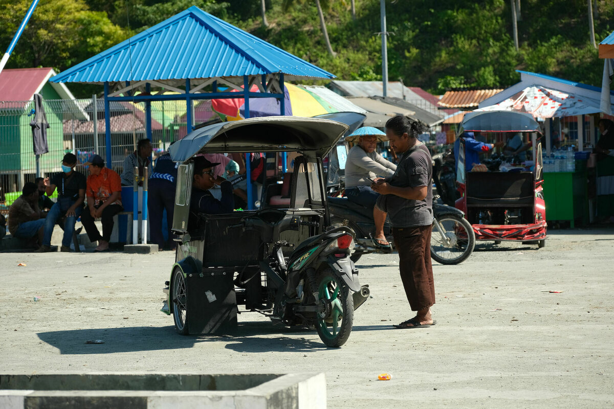 Nach einer Stunde waren wir in Wakai, der »Hauptstadt« der Hauptinsel, genau im strategisch guten Moment, als es zu regnen anfing. In einer chaotischen Wuselei, die dadurch zustande kam, dass sich auf der rutschigen Anlegerbrücke nicht nur die Aus- und Einsteigenden aneinander vorbeiquetschten, sondern auch noch Waren be- und entladen wurden. Und zwischendurch fragten auch noch Rikschafahrer, wo man uns denn hinbringen könne.